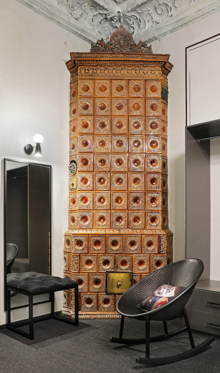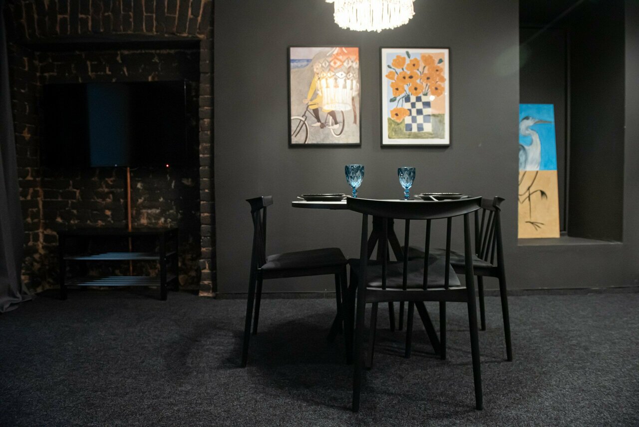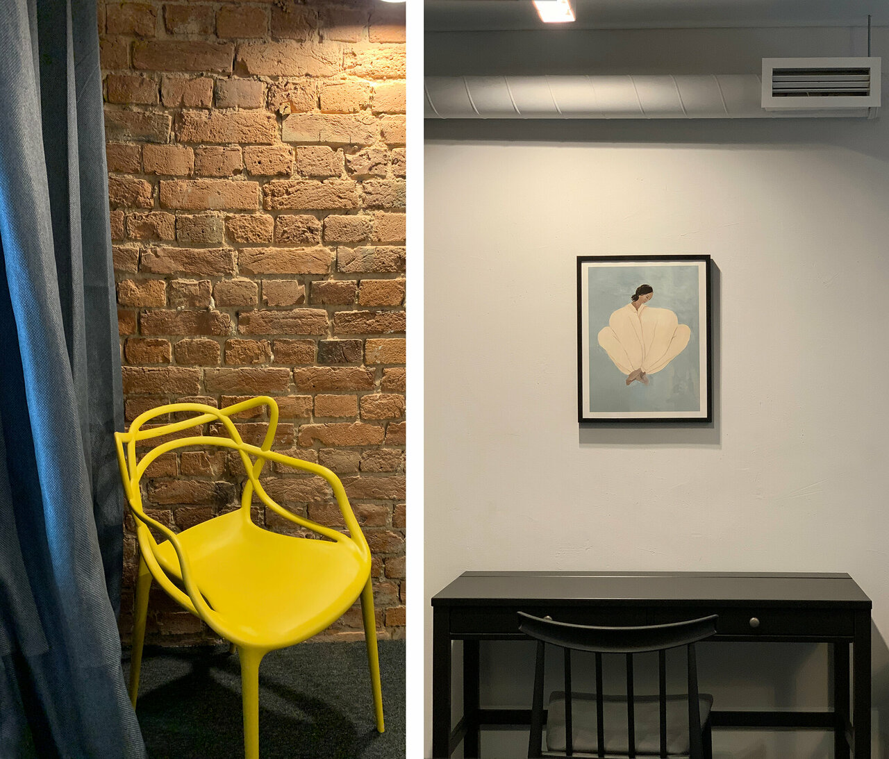 Студия занимает часть старинного здания с высокими потолками и большими окнами, которые обеспечивают хорошее естественное освещение. Интерьер выполнен в стиле лофт: кирпичные стены, металлические элементы декора создают атмосферу уюта и тепла.