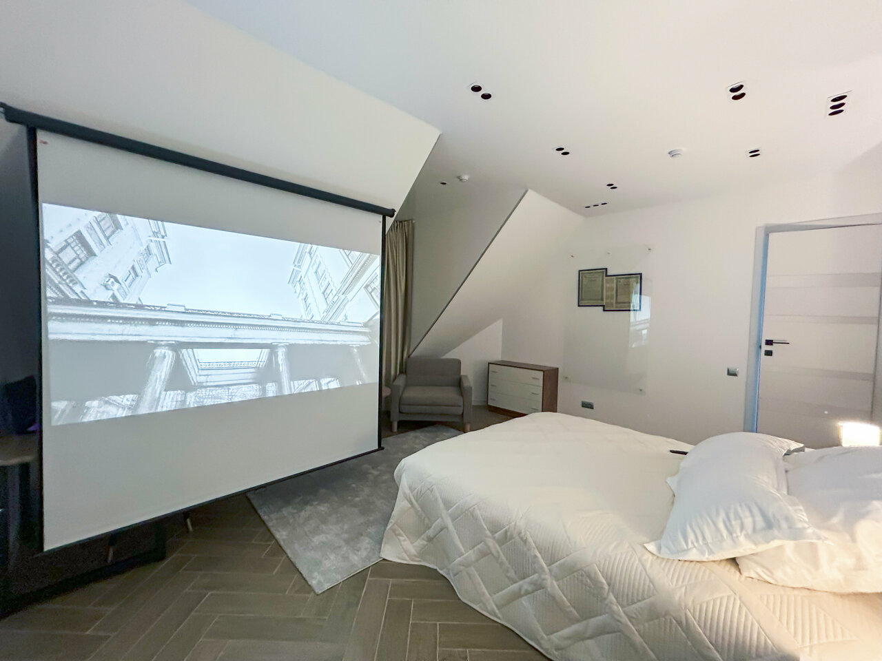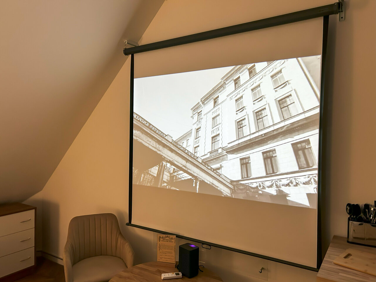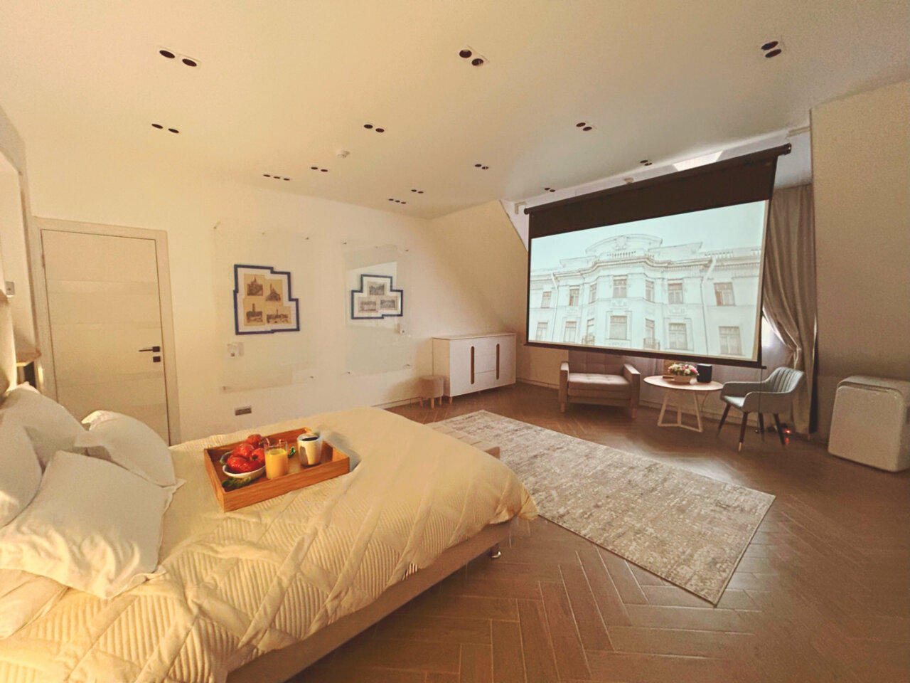 Отличные апартаменты. В номере капсульная кофе машина, кондиционер, проектор, колонка Алиса. Присутствуют элементы умного дома (управление проектором, кондиционером). Номер был огромный, 70 кв, также присутствует парковочное место для машины