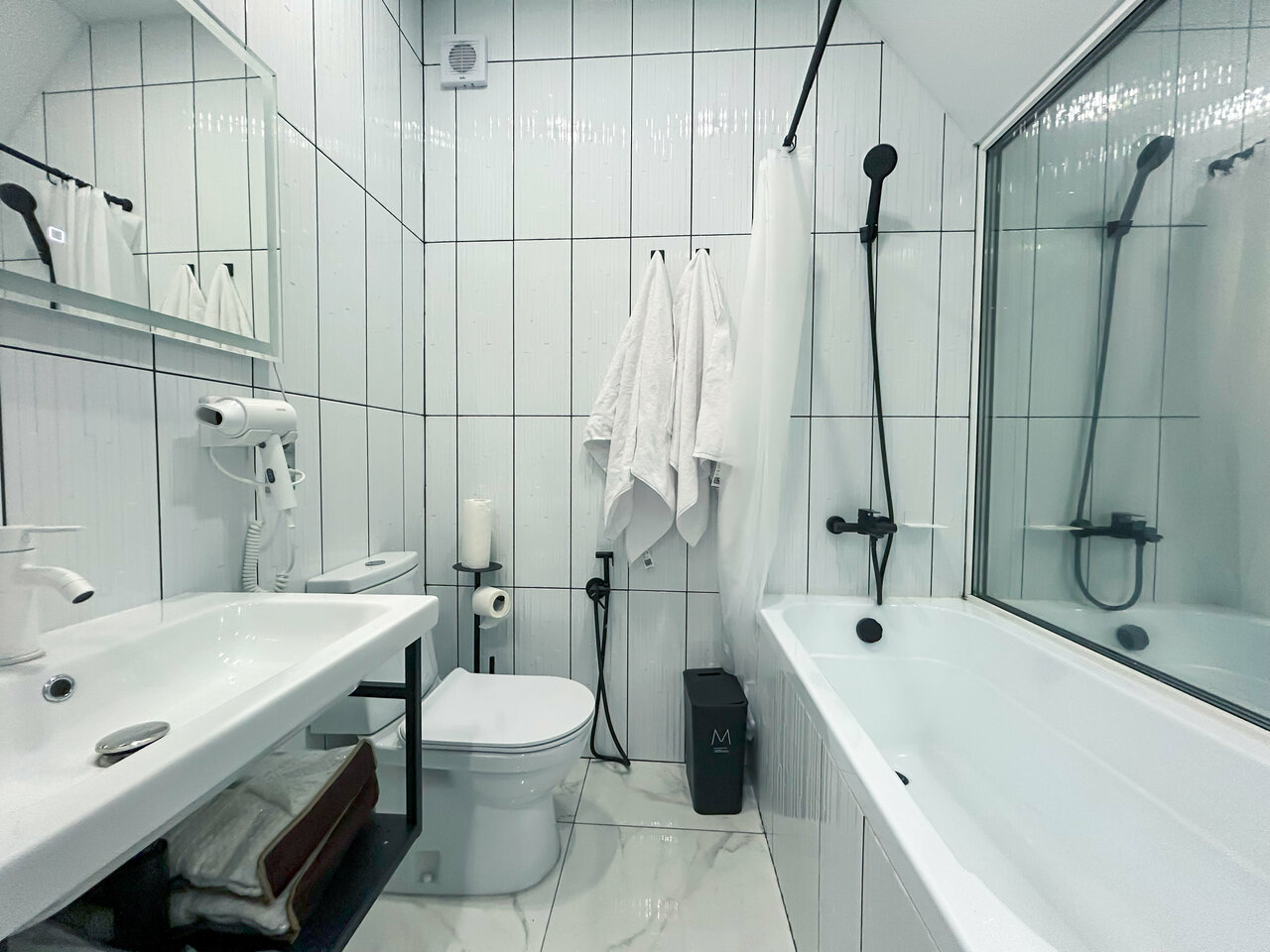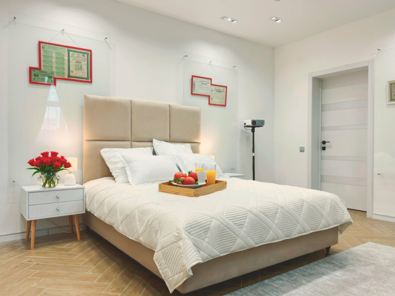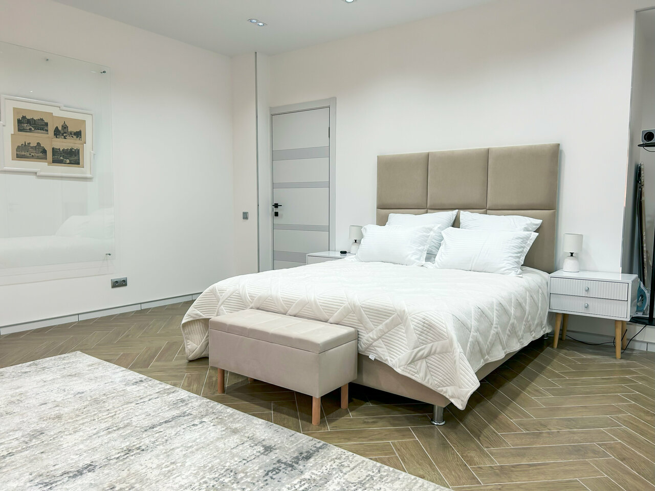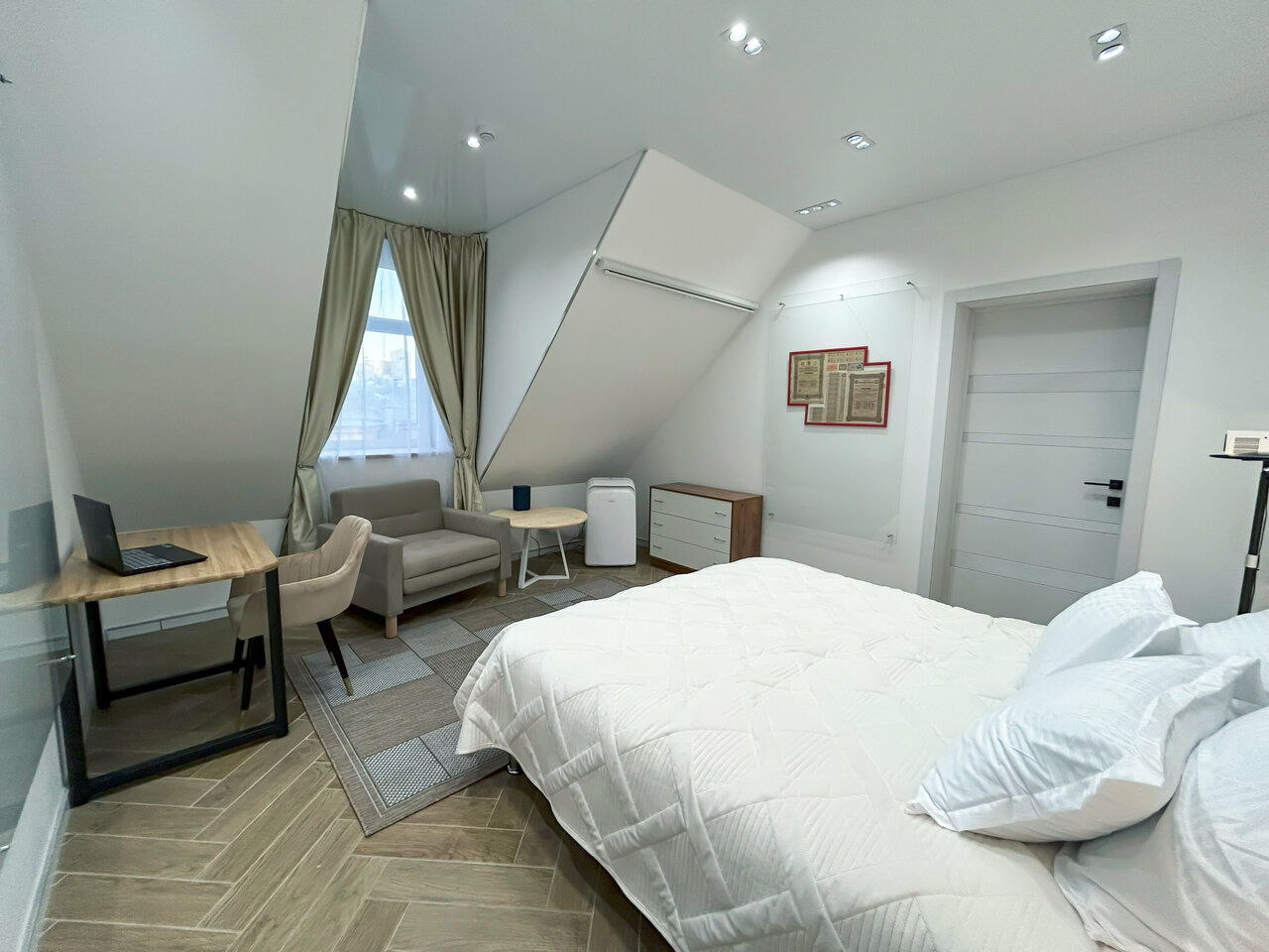 Отличные апартаменты. В номере капсульная кофе машина, кондиционер, проектор, колонка Алиса. Присутствуют элементы умного дома (управление проектором, кондиционером). Номер был огромный, 70 кв, также присутствует парковочное место для машины