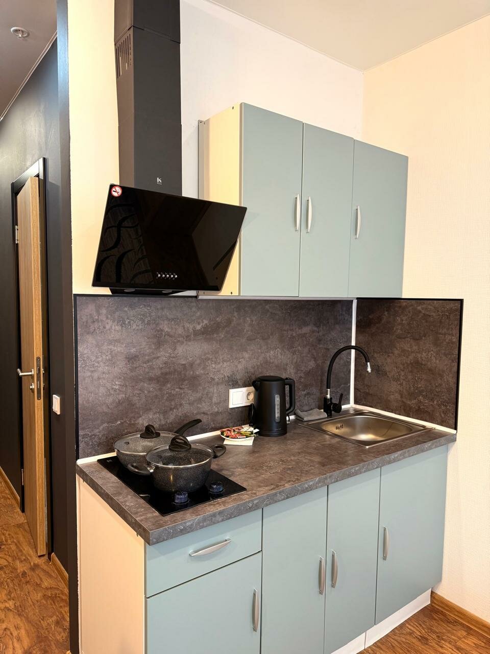 Очень понравились апарты: все новенькое, свежий ремонт, в номере есть все: от кастрюли до гладильной доски. Приятно, что кухонная зона отделена от спальни, на кухне можно положить спать ребенка.