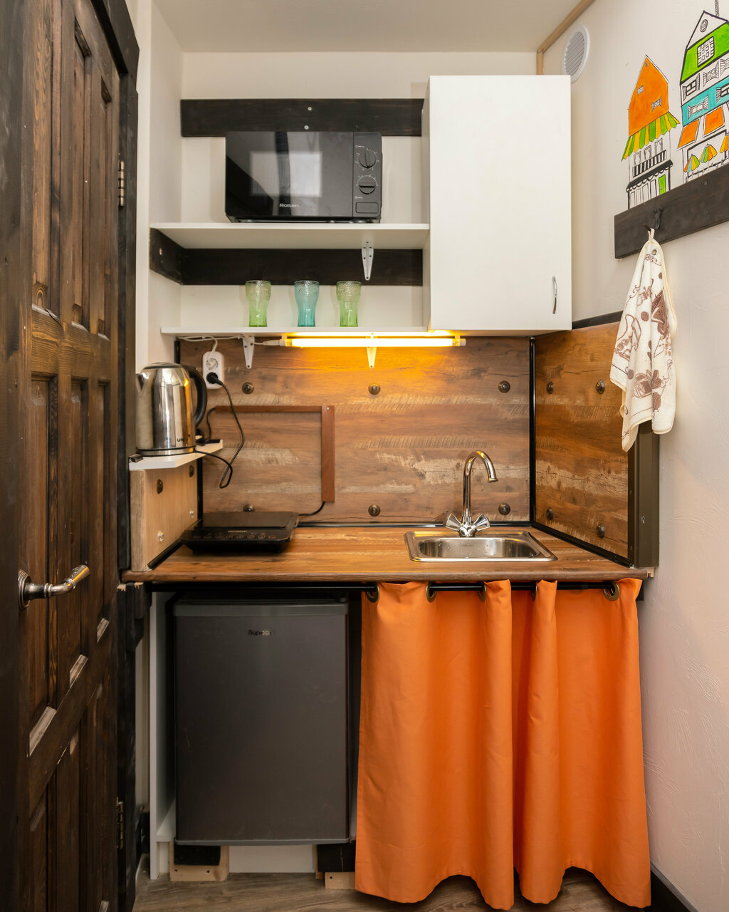 В студиях есть всё необходимое: кондиционер, Wi-Fi, кухонный уголок, большой балкон (можно курить). Минимальный срок аренды — 2 суток, цена от 2000 ₽/ночь (зависит от сезона и количества гостей).