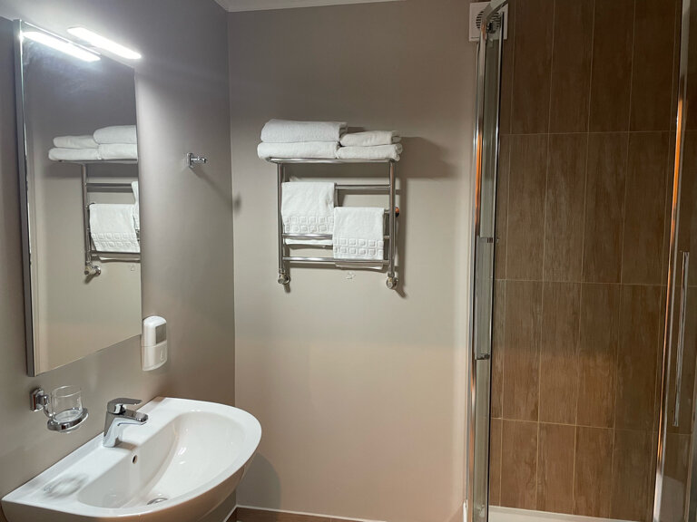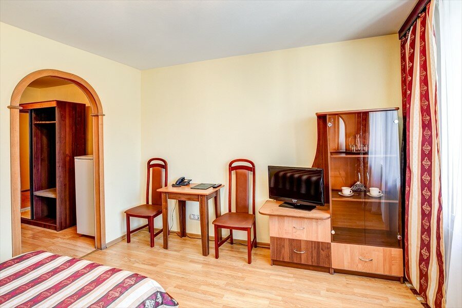 Номера не новые, но все необходимое есть, постель удобная, все чисто, техника совсем не новая, телевизор мне не был нужен, холодильник маленький был, душ современный удобный, фен удобный, туалетные принадлежности все были, белье и полотенца чистые в отличном состоянии, первостепенно дружелюбный. Особенно порадовала доступность утюга. Завтрак устроил во всех отношениях.