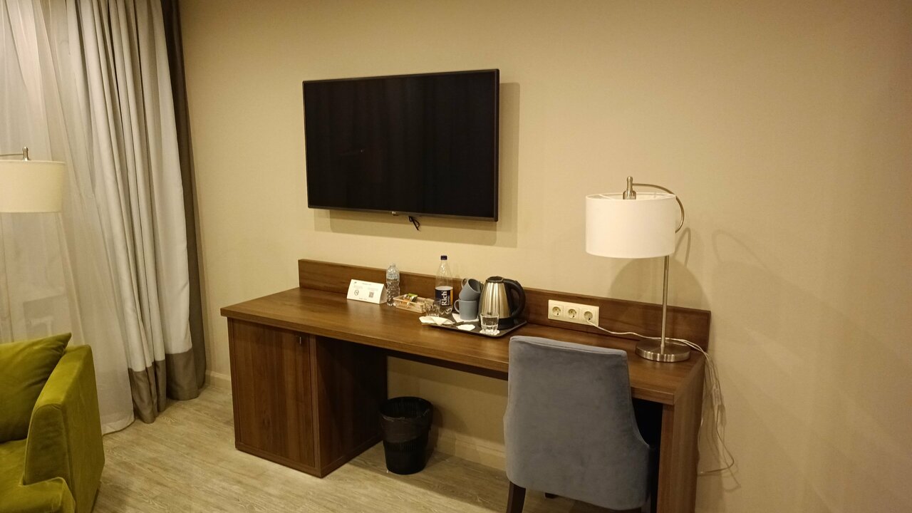 Абсолютно новые номера со свежим ремонтом, современным дизайном и всеми удобствами: в номере предоставляется набор для приготовления чая, мини-холодильник, сейф, огромный плазменный телевизор, отдельное рабочее место.