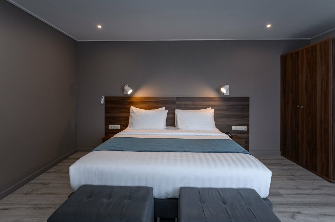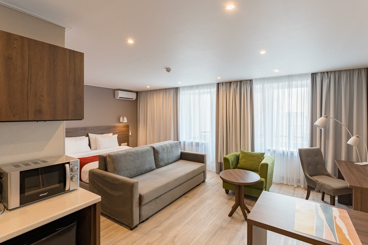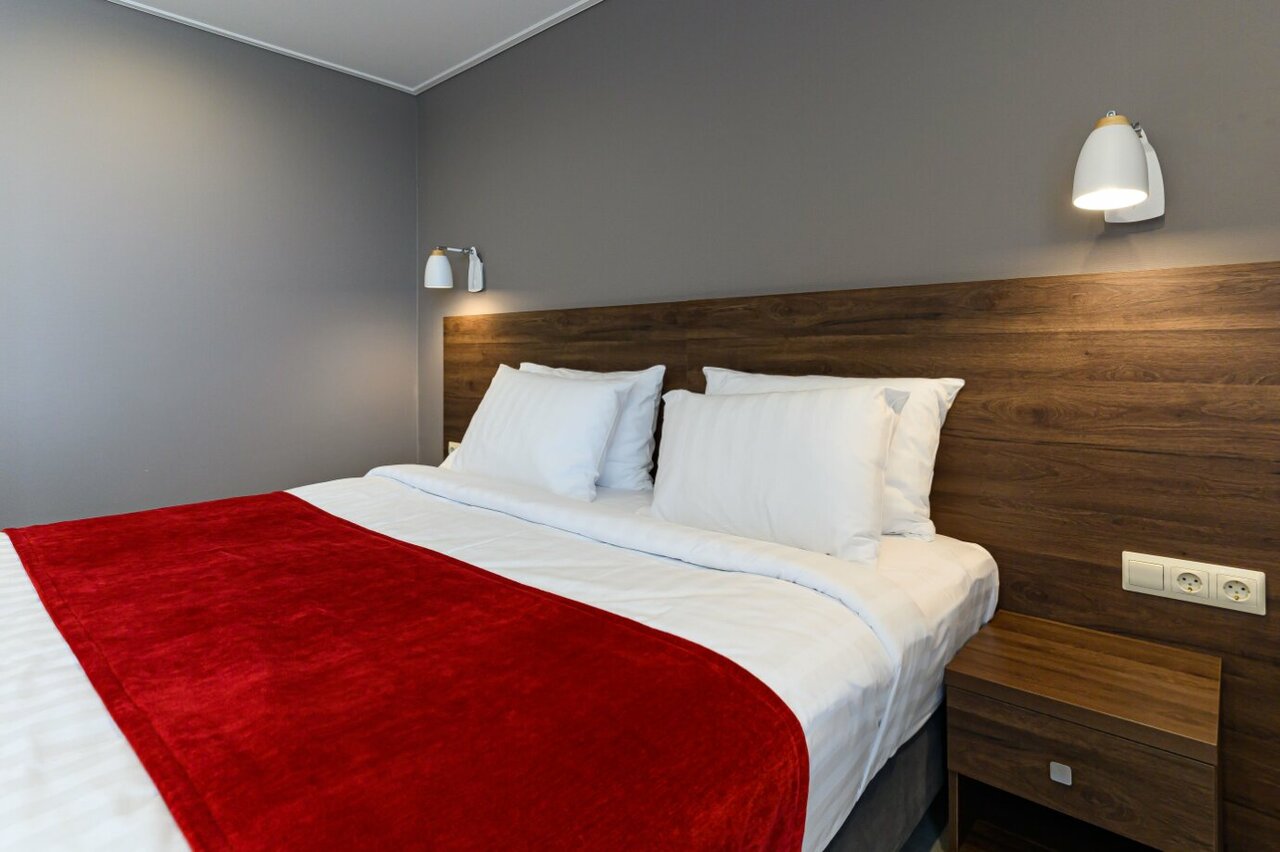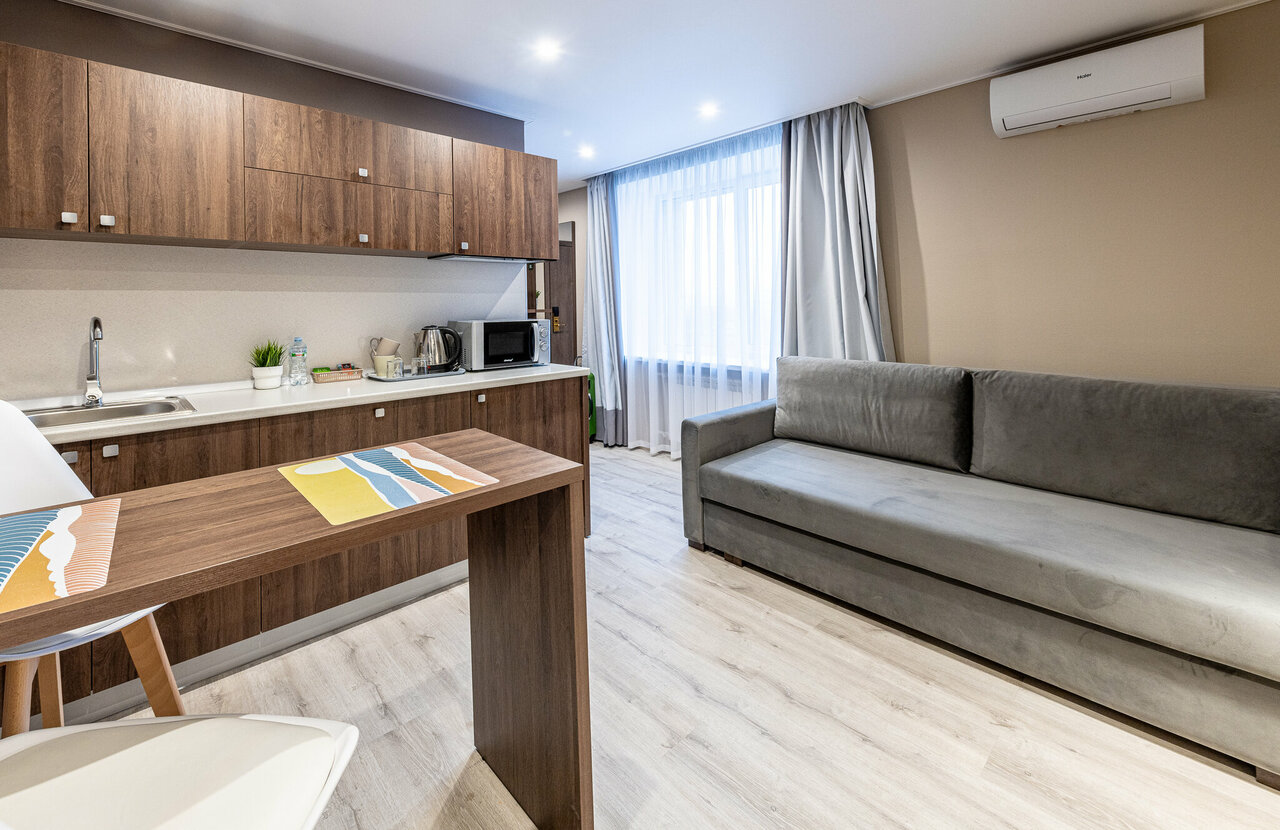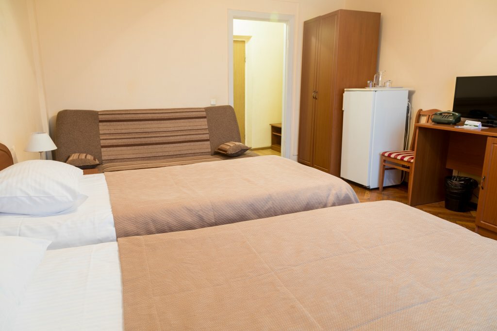 Просторные однокомнатные номера с ремонтом 2023 года. Во всех номерах установлена одна двуспальная кровать 180*200 с ортопедическим матрасом и комфортный диван, который может быть использован как дополнительное спальное место. Оборудованы сейфом, ...