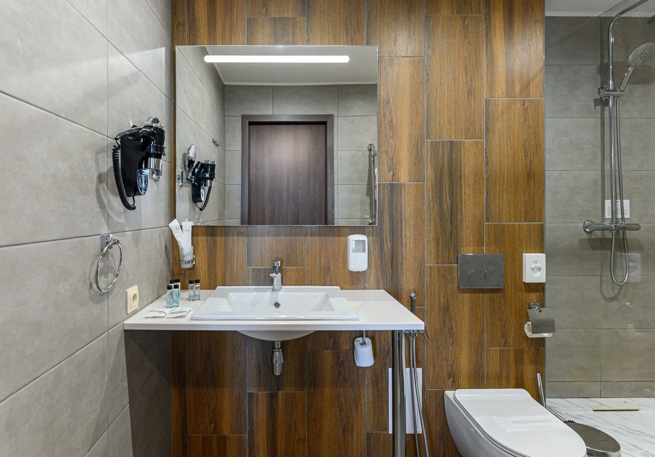 Был забронирован номер комфорт. Разместили нас на 9м этаже. Номер понравился, все новое, современное. Отличная удобная двуспальная кровать, в наличии все самое необходимое — холодильник, чайник, тв. Завтрак ‘шведский стол’ — еды в изобилии на любой вкус. Все вкусно! ’-‘ — очень плохо регулируется вода в душе. Сначала льётся холодная, затем кипяток. Сложно поймать такое положение смесителя, чтобы не тёк кипяток. Одно мучение. Хотя сантехника новая.