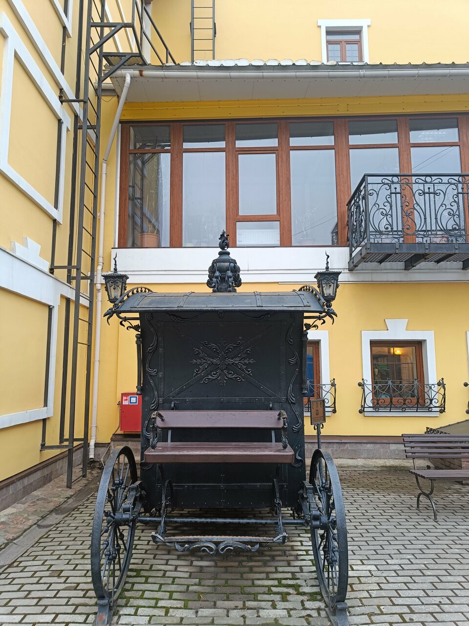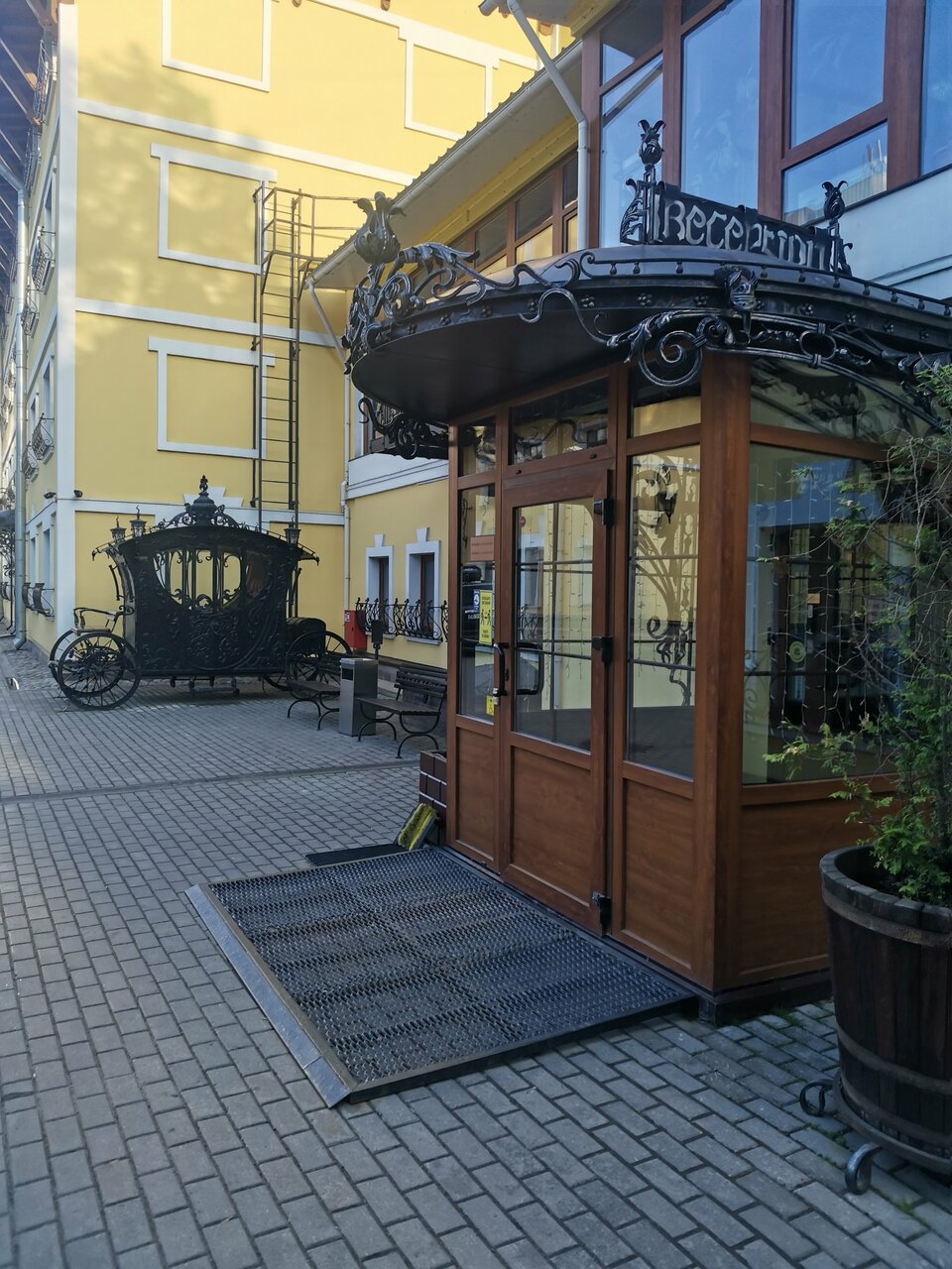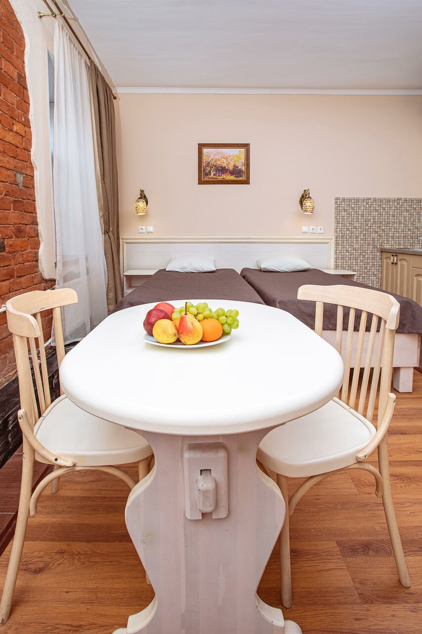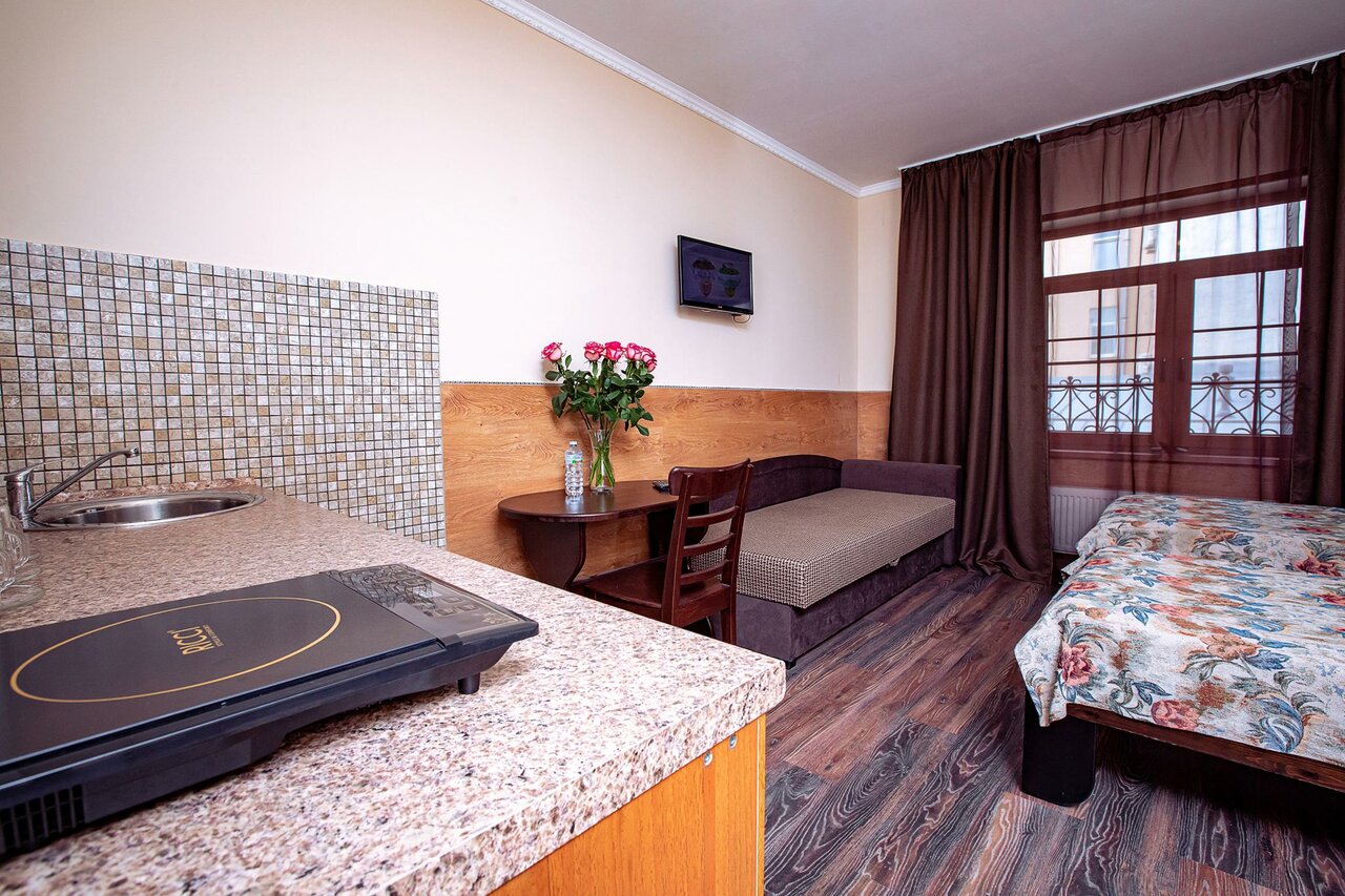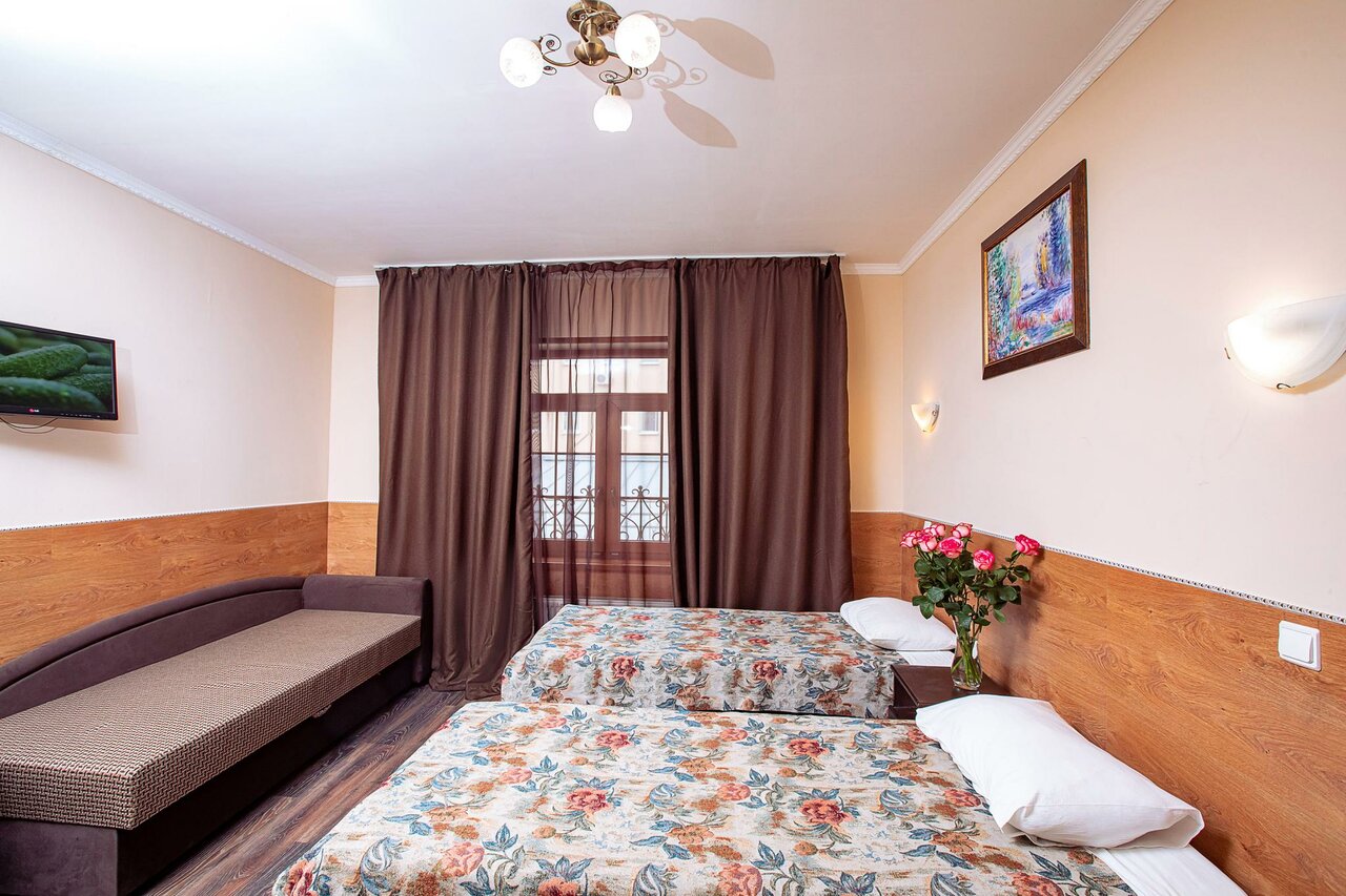 Были в этом отеле семьей (2 взрослых и ребёнок) с 29.05.23 по 03.06.23 г.,красивая территория, есть своя парковка (250 в сутки, место для курения-Номер был-студия эконом-3 кровати+диван,мини холодильник,элекроплита(работала правда только одна комфорка),телевизор (пульт не работал,переключали вручную),ванная комната (душевая кабина-только,чтобы была горячая вода нужно было ставить на синюю кнопку,неправильно установлен смеситель,но вода самое главное горячая была,унитаз,фен,сушилка для белья),было 3 банных полотенца и одно для рук,мыло и гель для душа и шампунь в пакетиках,но нам этого не хватило,хорошо что привезли с собой),посуду тоже брали из дома,так как было две маленькие кружки,сковородка и три тарелки,столовые приборы,кастрюли и крышок не было),правда мы в основном ели в кафе,В номерах убирают.Есть шкаф с 4 вешалками и полками,за водой нужно было ходить на второй этаж в кулер.До центра ездили либо на такси,либо пешком.На территории было кафе,