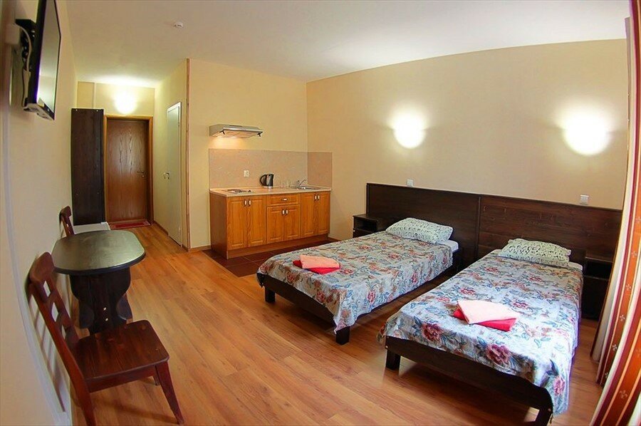 Номера чистые, уютные. Кухня можно приготовить или разогреть пищу, туалет и душевая кабинка. Все рассчитано для нормального отдыха. В 10 шагах есть кафе, для тех кто не успевает покушать в номере.