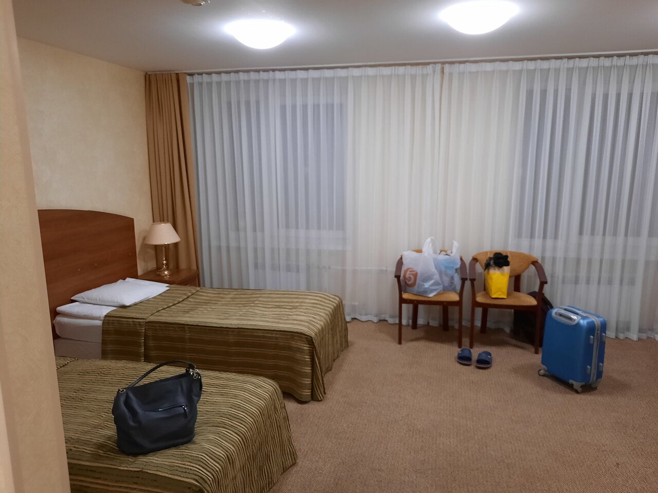 Отвечает минимальным требованиям 3х звезд Цена космическая В номере пришлось самим делать уборку, Тк пыль на столе, волосы на полу (несколько клоков нашли), грязная штора в ванной, как сам сан узел 1я уборка в номере была ужасна, согласились на др смену, было лучше, поменяли шторку, помыли, пропылесосили, но общее впечатление : не стоит своих денег Персонал приветливый