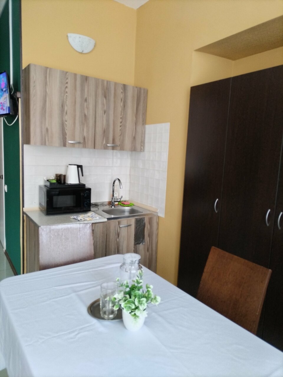 Цена за 1-2 человек.Рядом-Пятёрочка,столовая с вкусной едой,автомойка.А номере есть:-средства гигиены,свежее постельное,полотенца-кондиционер-микроволновка,холодильник-есть печь индукционная,приборы,посуда-wi-fi и телевизор-гладильная доск...