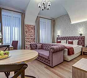 В просторных семейных номерах Вы сможете насладиться тишиной и покоем. В номерах имеется спальня с двуспальной кроватью и гостиная с полноценной двуспальной кроватью, на котором возможно размещение ребенка или взрослого. Еще одно дополнительное место