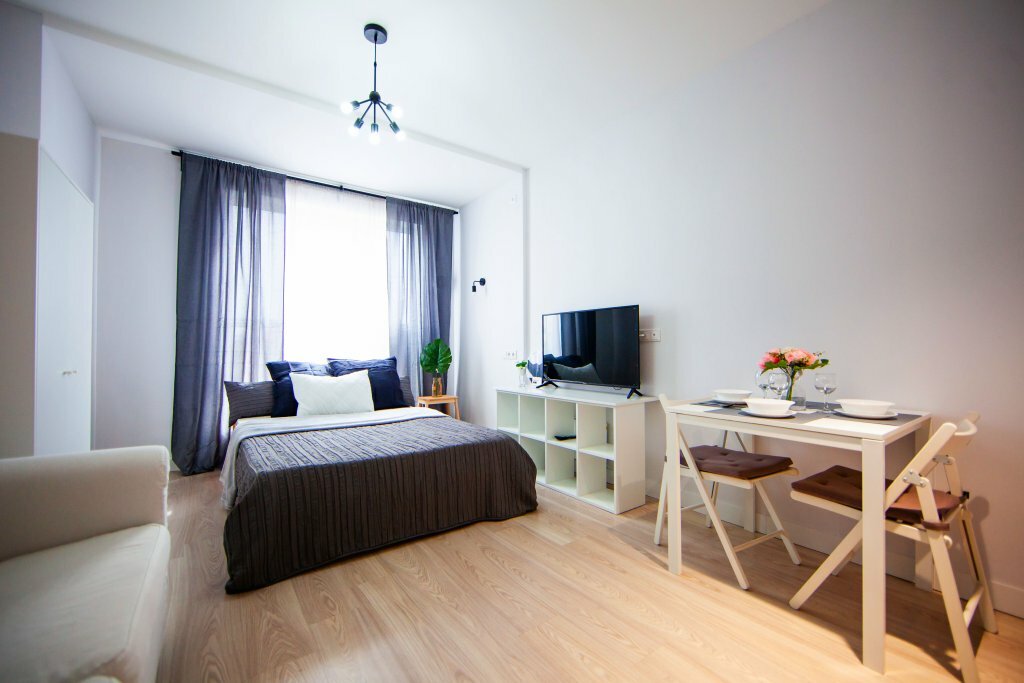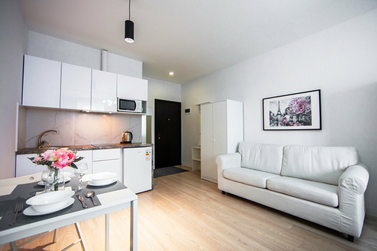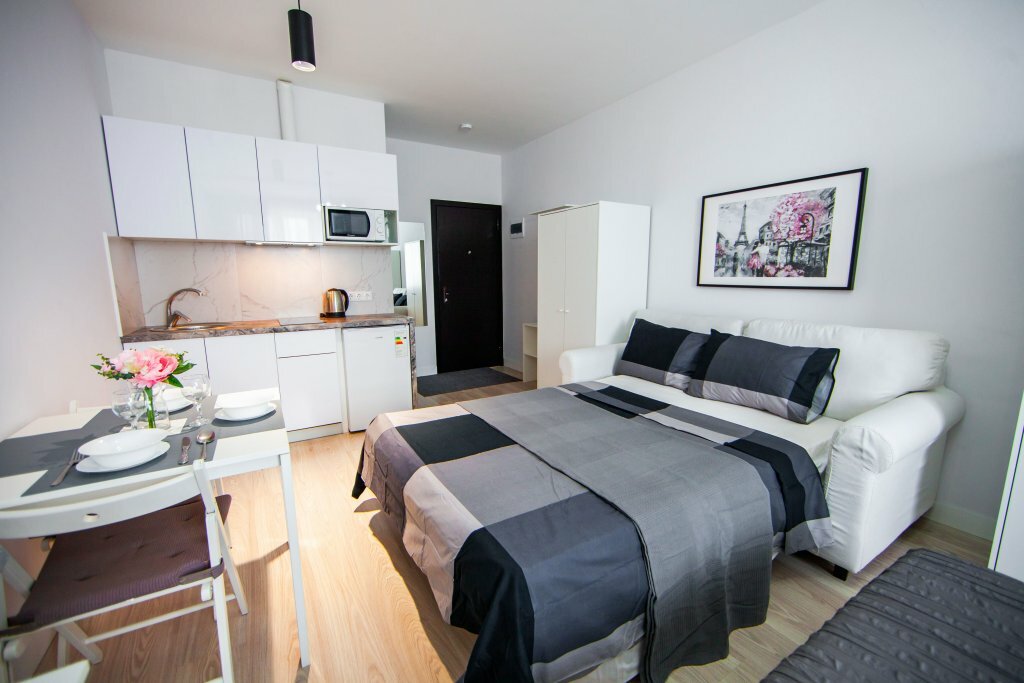Апартаменты на 2 гостей с евроремонтом в новом жилом доме 2020 года постройки. Всё предусмотрено для комфортного проживания: Кухня со всем необходимым для приготовления и прием пищи, санузел, двуспальный диван, телевизор, бесплатный WiFi