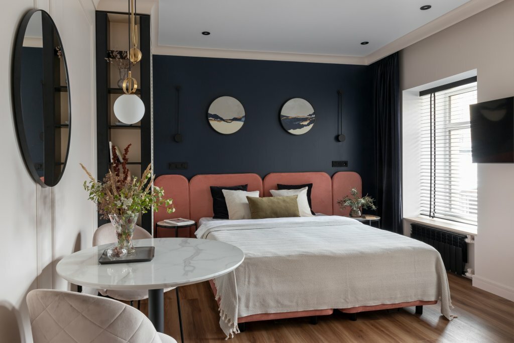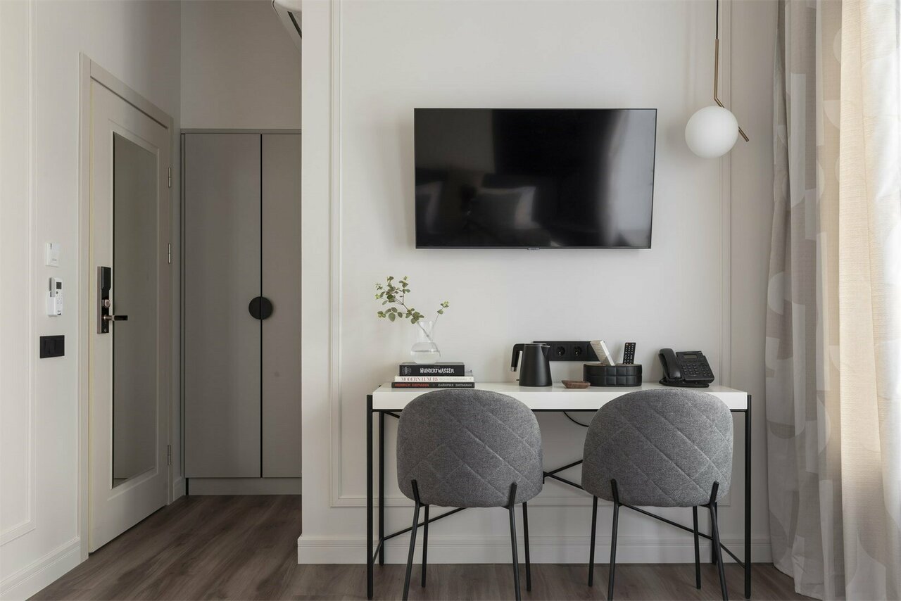 Уютный отель, с интересным дизайном, студия как дома, с удобной планировкой и комфортной площадью для двоих, выручала мини-кухня, есть фильтр для питьевой воды, утюг, колонка Алиса. Приветливый персонал. Есть кафе внизу, заказывали обед в номер. Расположение удобное, близко от центра. Парковка городская (100 р/ч). Из минусовых нюансов: душновато в номере, небольшой шкаф для хранения вещей. В общем остались довольны, рекомендуем.