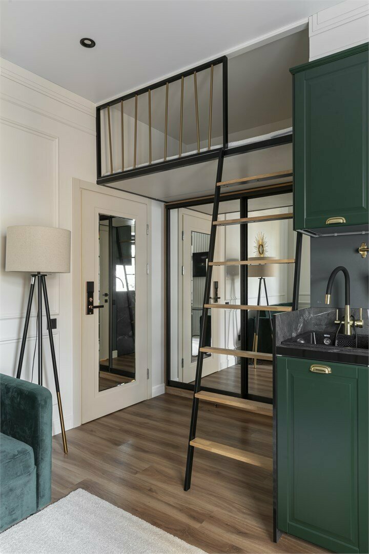 Апартаменты с кухней-гостиной, изолированной спальней и собственной ванной комнатой с душевой.