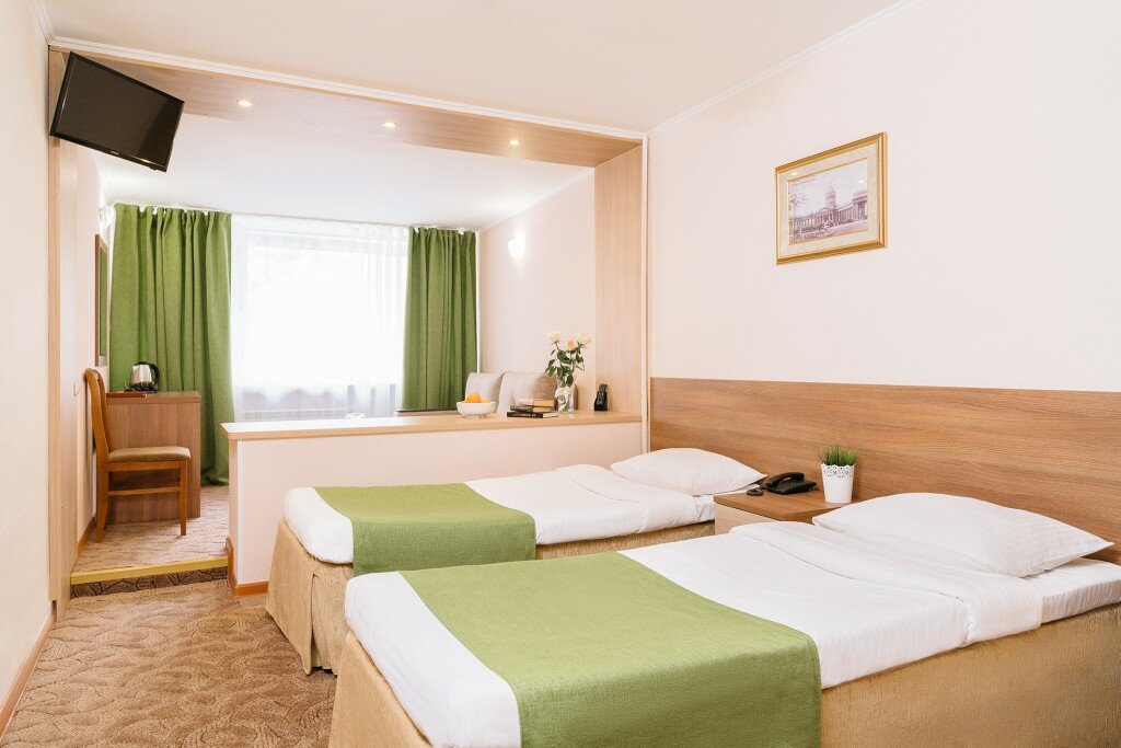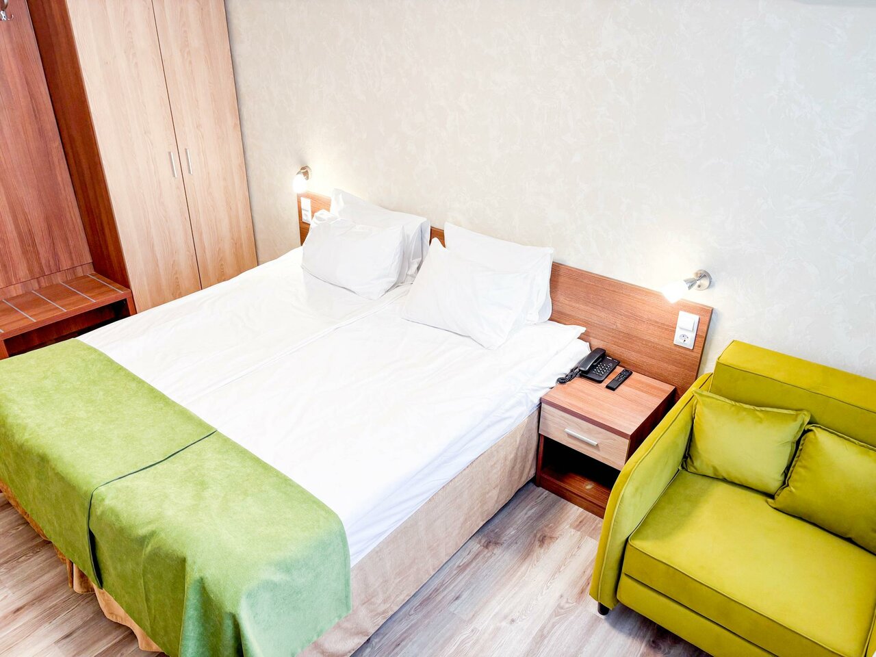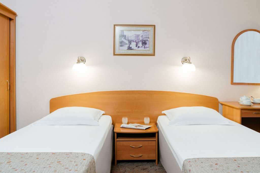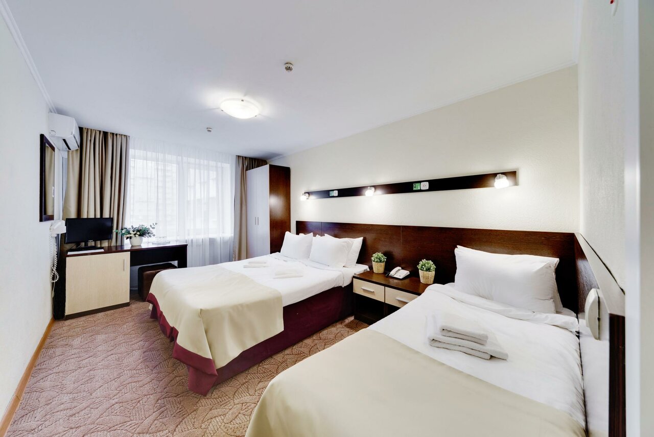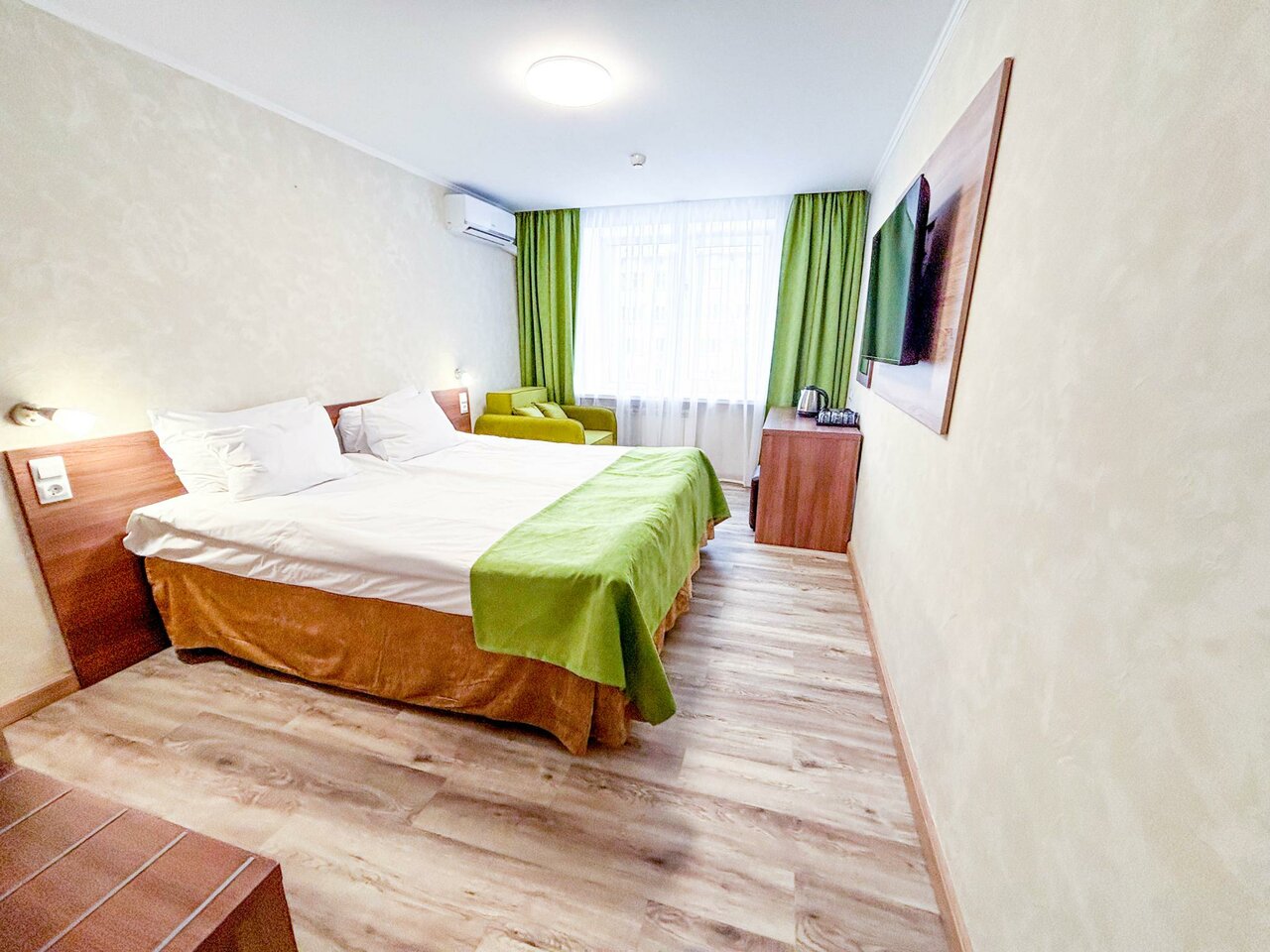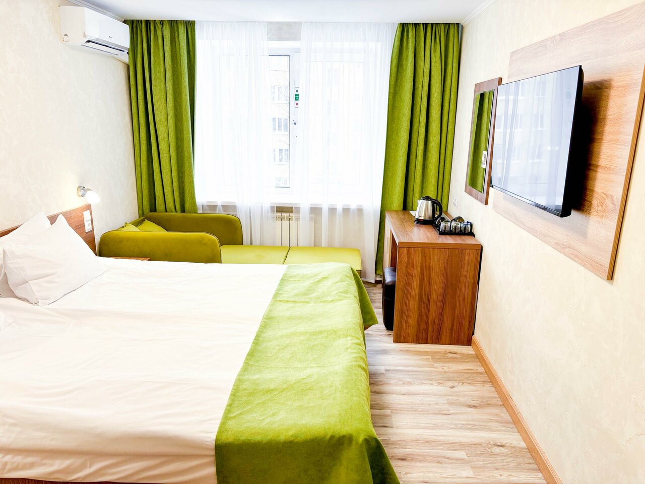 Стандартный одноместный номер. Кровать огромная, матрац мягкий, спать комфортно. Небольшой холодильник, тв и кондей. В санузле вместо душевой кабинки ванна. Завтраки, правда, не очень, но кто любит макарошки с сосисками, тому зайдёт. Звукоизоляция практически отсутствует, особенно ночью слышно как в конце коридора кто-то пошёл в туалет. На длительный срок оставаться сомнительная идея. В целом, свои три звезды оправдывает. Накинул одну звезду, так как совсем рядом отличный магазин с разливным и шавермой, а чуть дальше шикарная столовая. Дополняю отзыв. В очередной раз зеселили в номер с балконом, там столик, два кресла. Можно расположиться с чашечкой кофе на балконе и наслаждаться свежим воздухом. Утром на завтрак пошёл пораньше и был приятно удивлён разнообразием блюд, так что действительно, можно хорошо и вкусно позавтракать. Так что добавляю ещё одну звезду.