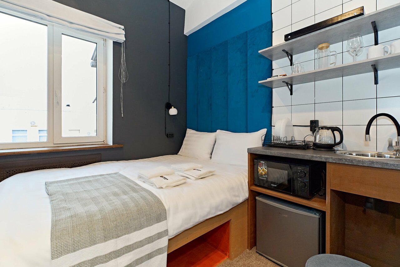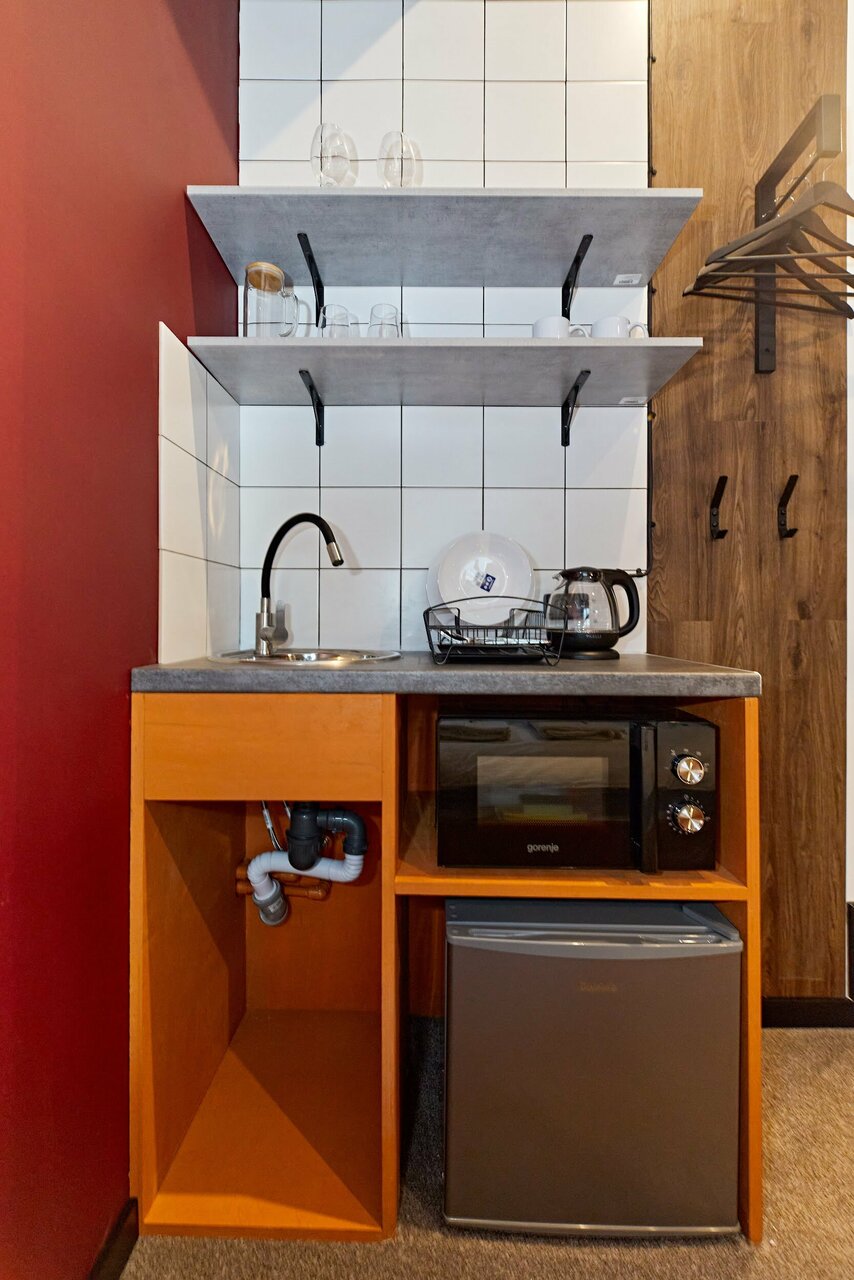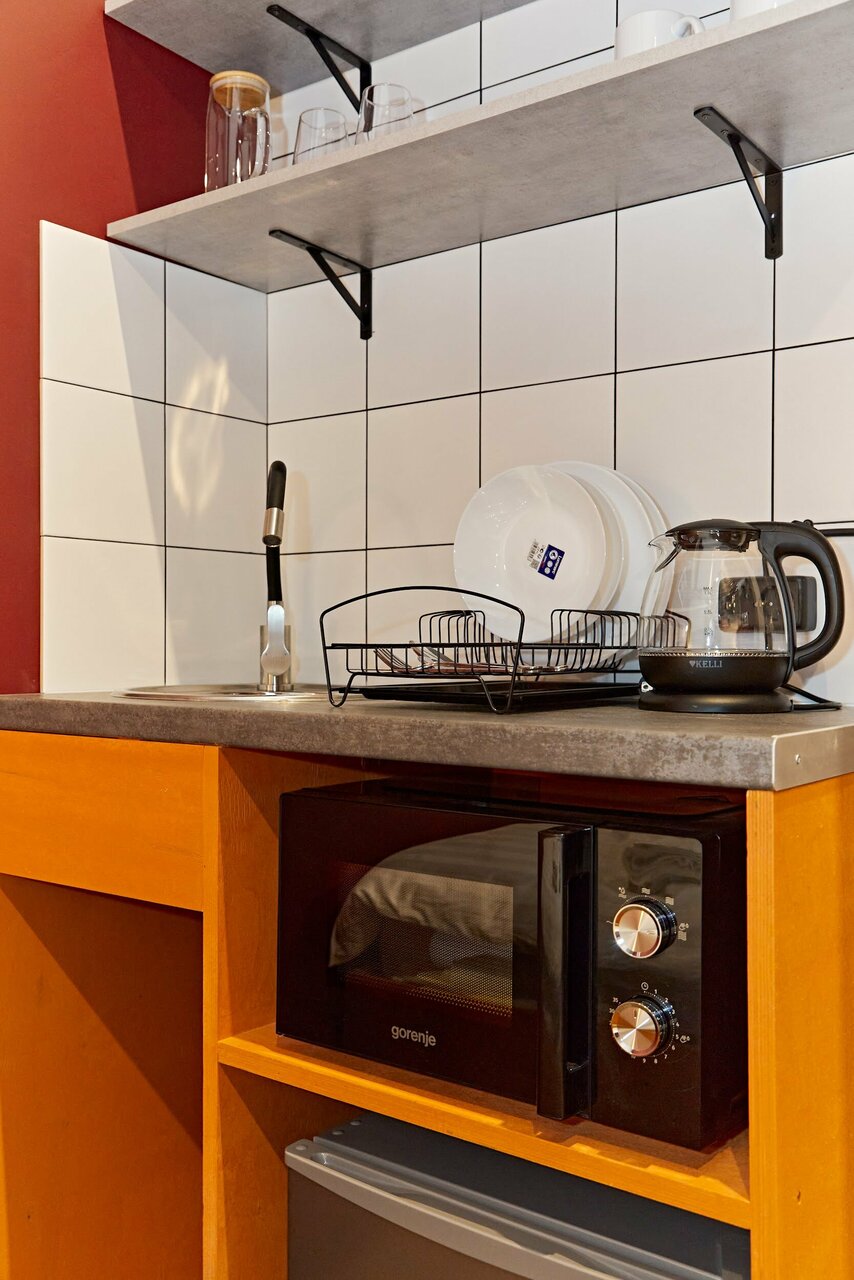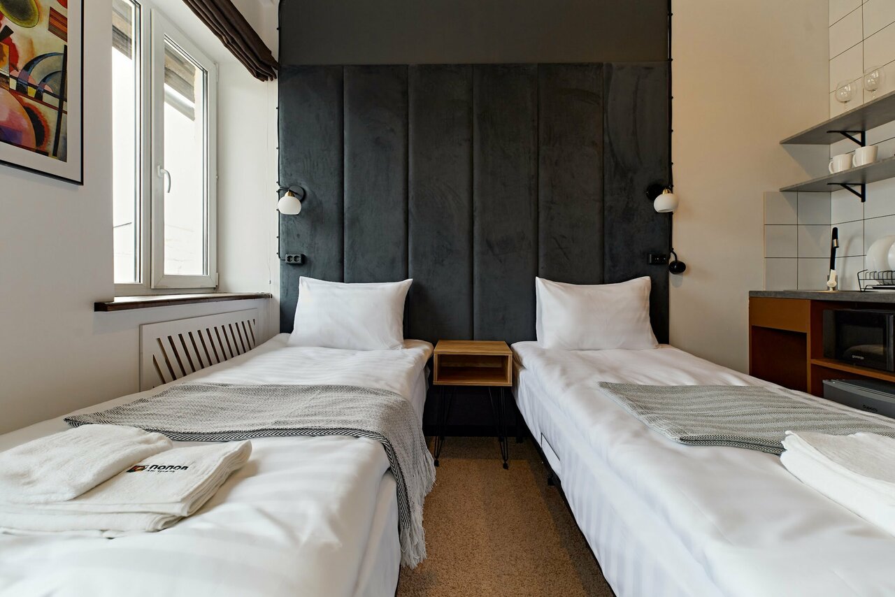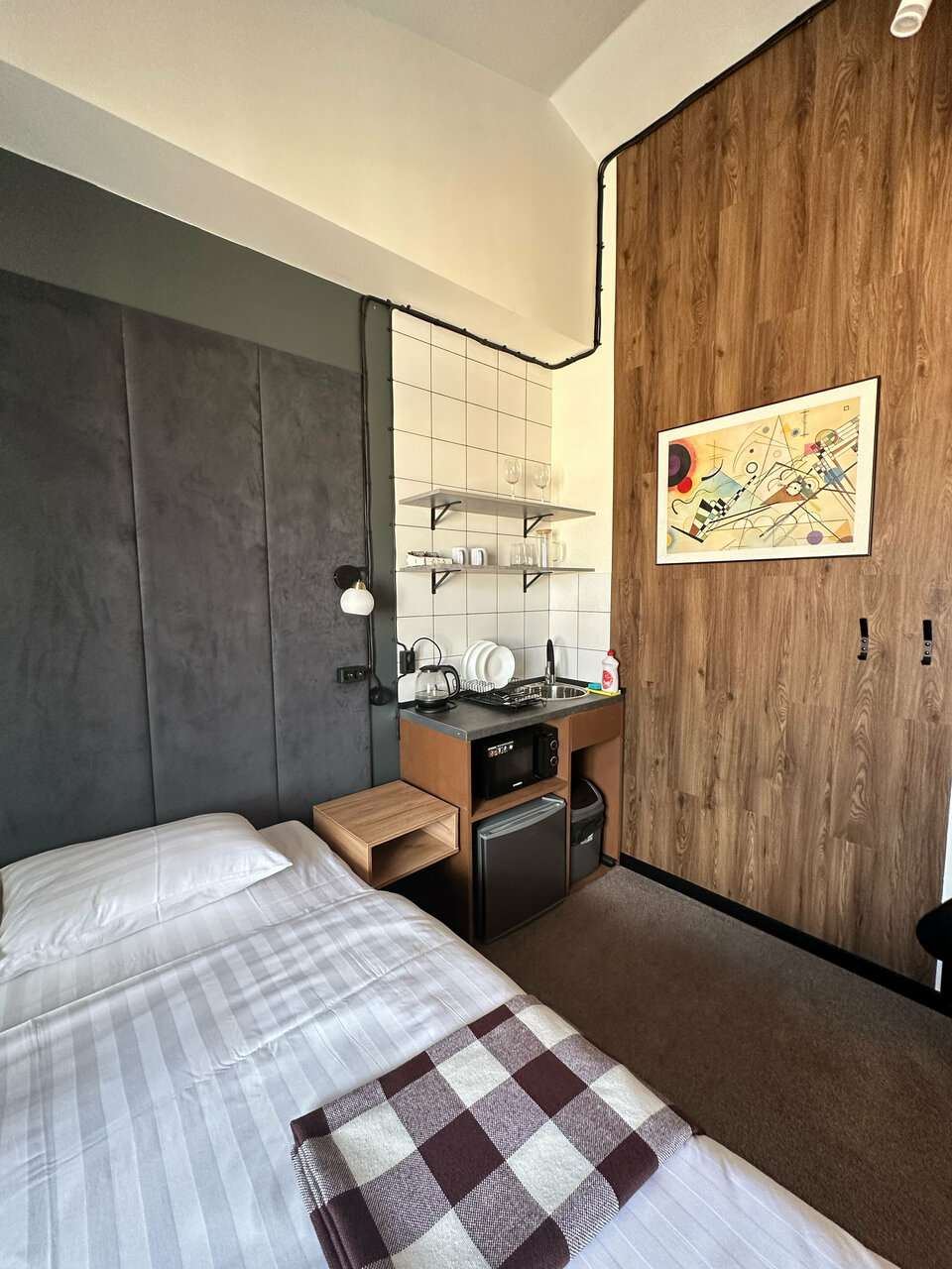 Нам понравилось! Мини-апартаменты, недавно открылись. Вход со стороны музея фотографии и школы. Заселение самостоятельно. Все необходимые принадлежности есть в номере. Дополнительные — в коридоре. Утюг, стиралка в коридоре. Кровати везде двухспальные. В номере фен, микроволновка, холодильник, мойка, посуда. Нет шкафа. Есть стол, пуф, тумбочка-этажерка, ниши под кроватью. Есть сомнительные дизайнерские решения типа мебели самодельной из крашеной фанеры. Уборка по запросу. Связь с ‘портье’ по ватсапп, отвечают быстро, все проблемы решили.