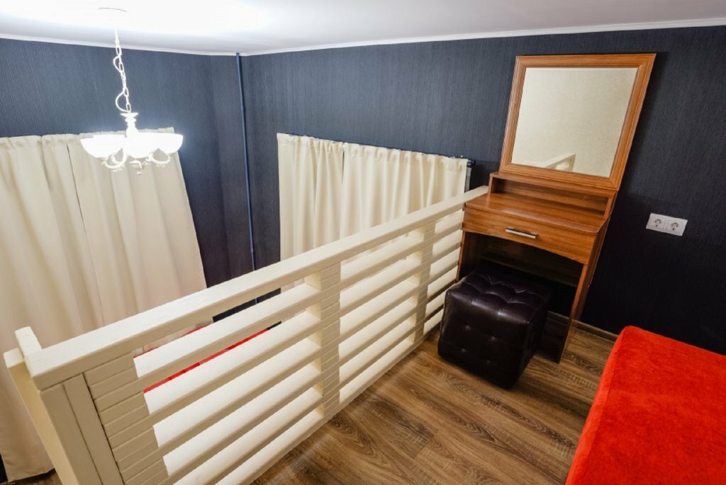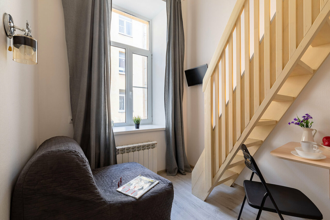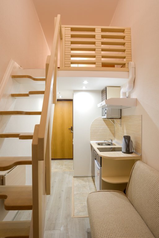 Номер понравился. Уютно. Есть второй этаж, мне высоты потолков на втором этаже хватило, но с ростом 1.90 придется пригнуться. Мужа это не смущало. Есть мини кухня со всем необходимым и магазины рядом. Для ленивых: миллион кафе. Удобное расположение и вокзал недалеко и улица с ресторанами.