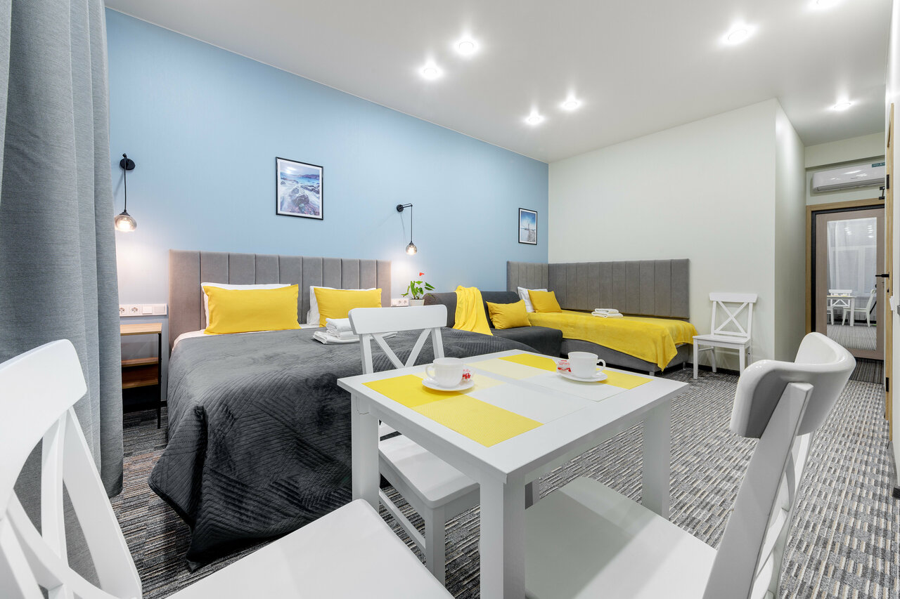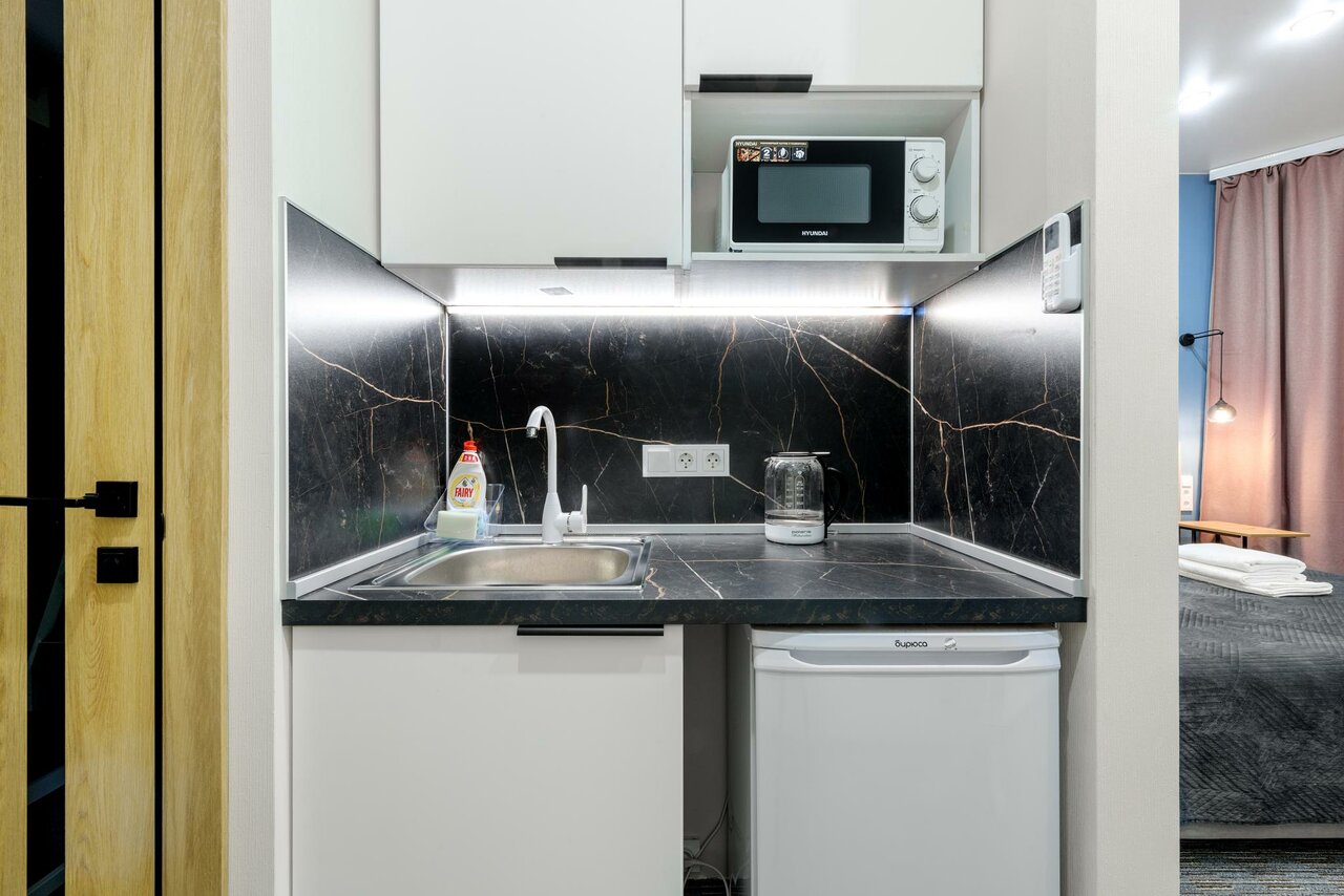 Приезжали в декабре 2024 года. Светлый, с красивой отделкой и всеми удобствами номер, есть кухонка, где имеется всё необходимое: Столовые приборы и приборы для готовки, холодильник, микроволновка, чайник;ванная комната с душем(в котором есть дозаторы с гелем для душа и шампунем), есть фен, чистые и мягкие полотенца и даже стиральная машина;Удобная кровать, с приятной к телу постелью, имеется телевизор с кинопоиском, ютюбом и прочими платформами, а вообще в помещении уютно и тепло! Очень удобное расположение, до метро идти 5-7 минут, на улице много кофеин, пекарень и ресторанов, есть тц ‘Планета Нептун’, а в нескольких метрах от входа находится магазин. Невероятно нравится администратор, очень отзывчивая и внимательная, прислушивается к клиентам и делает всё с любовью в следующий раз приедем туда же)