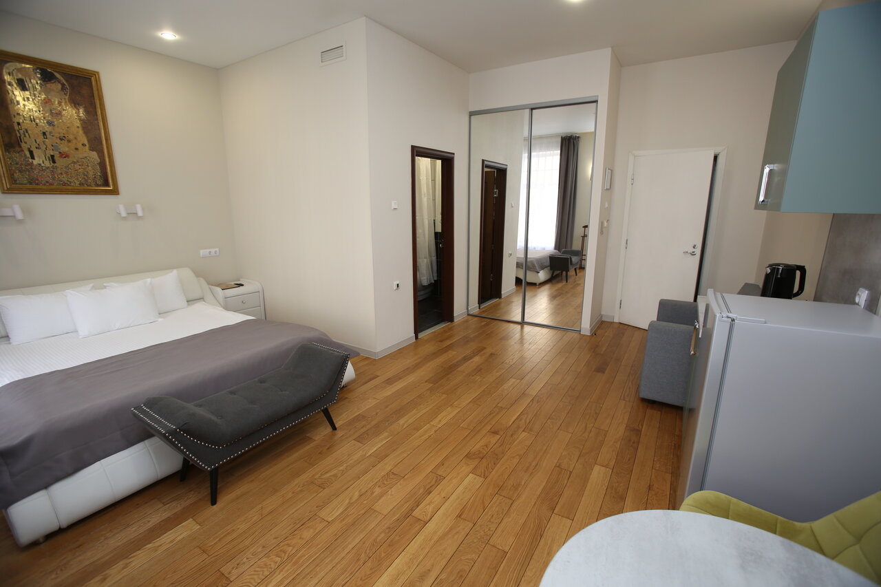 Двухместные апартаменты с кухней и ванной-джакузи. Интерьер оформлен в стиле модерн. Номер вполне подойдет для семьи, возможность размещения до 4 гостей. Площадь номера 26 кв.мВ номере: широкая двуспальная кровать, большой ЖК телевизор, кондиционер.
