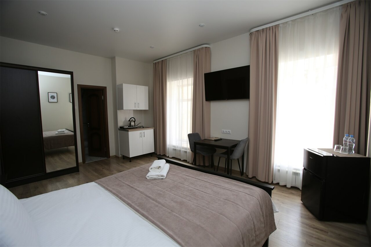 Уютный двухместный номер с кухней. В номере: 1 широкая двуспальная кровать, телевизор, телефон, шкаф для одежды, туалетный столики, сейф, бесплатный Wi-Fi Интернет, кухня, керамическая плита, холодильник, чайник. Площадь номера 18 кв.м.