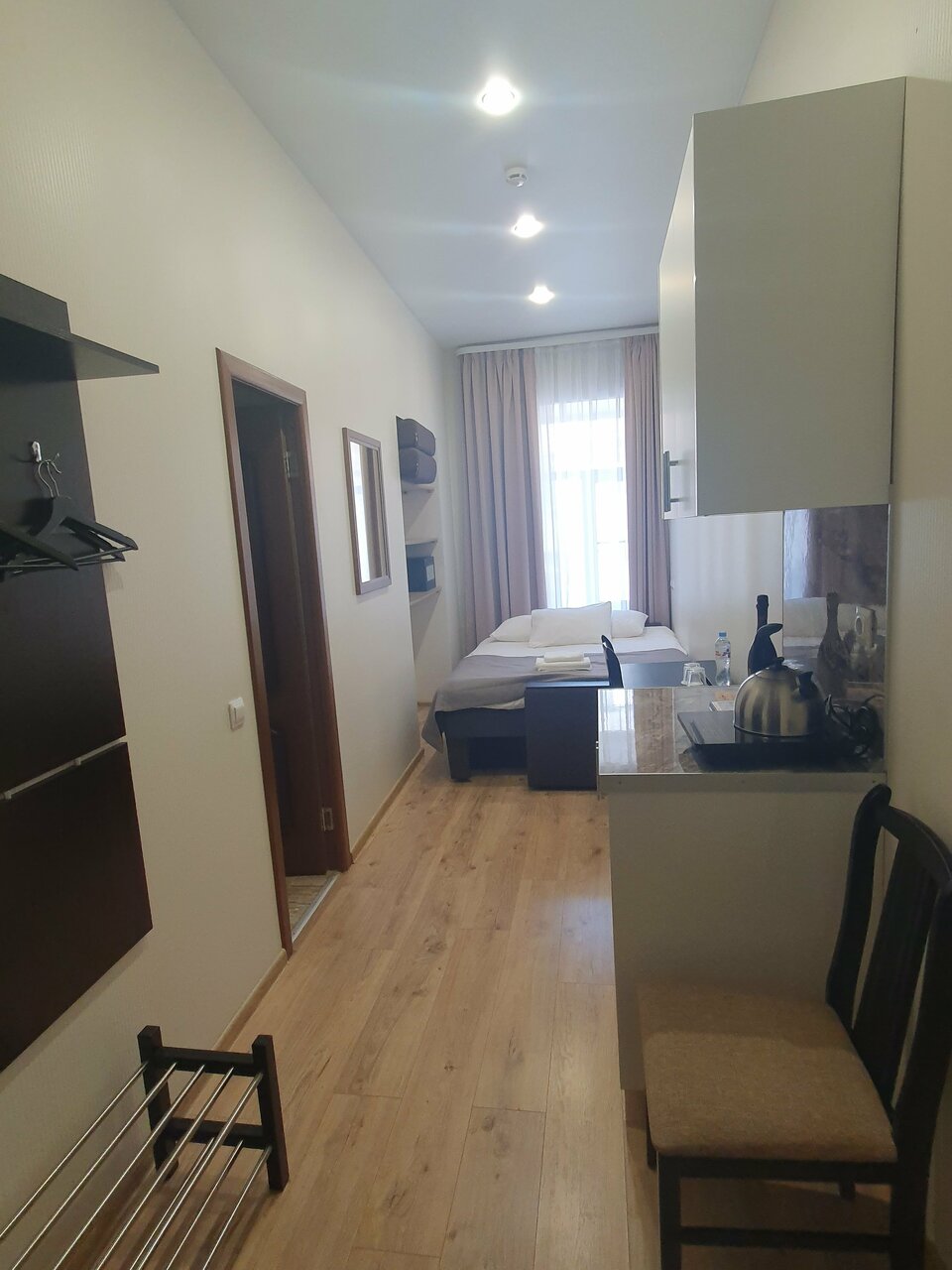 Студия включает в себя: спальню и ванную комнату. Кухня с принадлежностями находится в зоне спальни. Уборка проводится по запросу, предоставляются полотенца, туалетные принадлежности. Разместиться в студии с комфортом могут 2 гостя. Площадь 21 кв.м