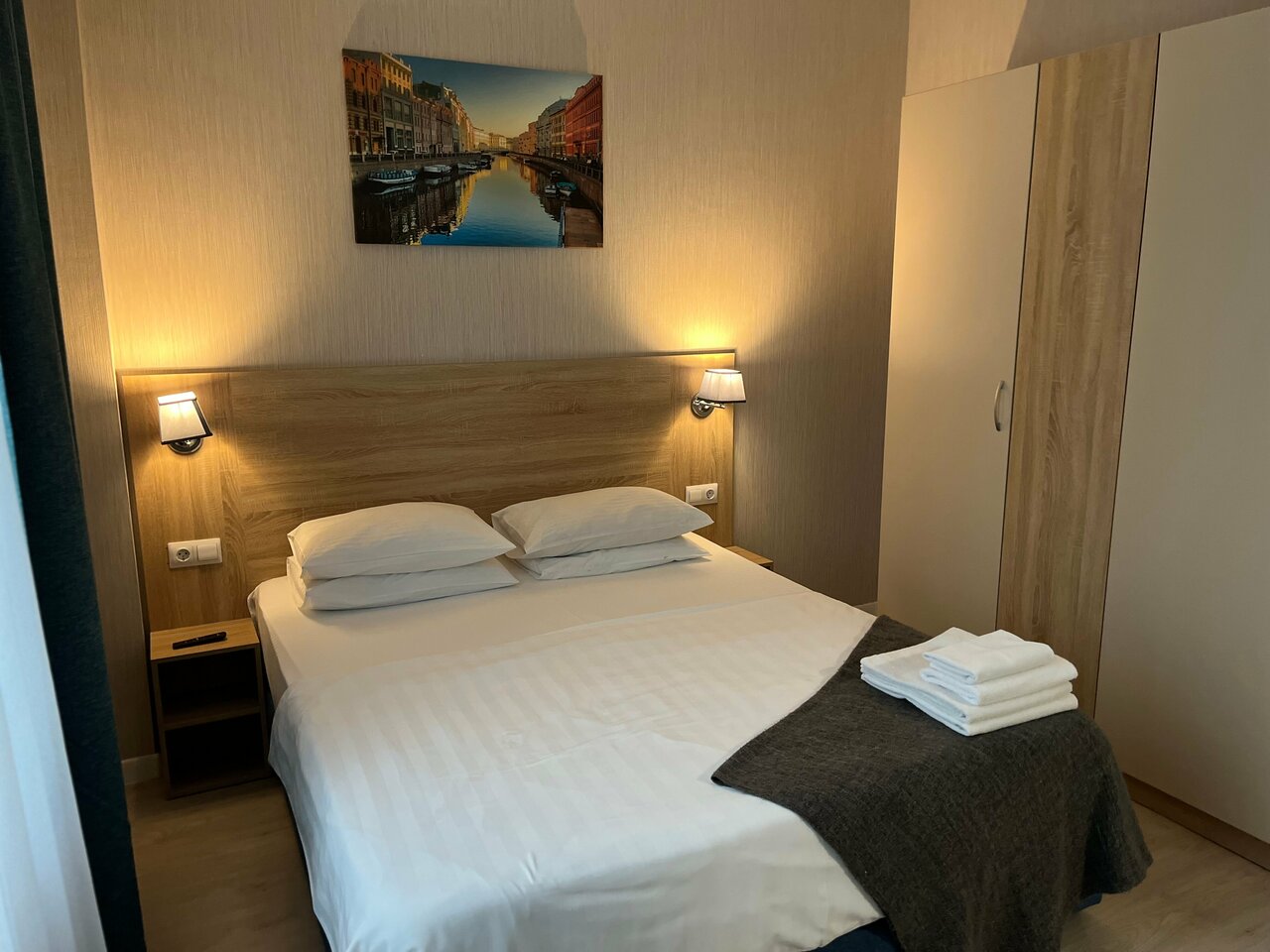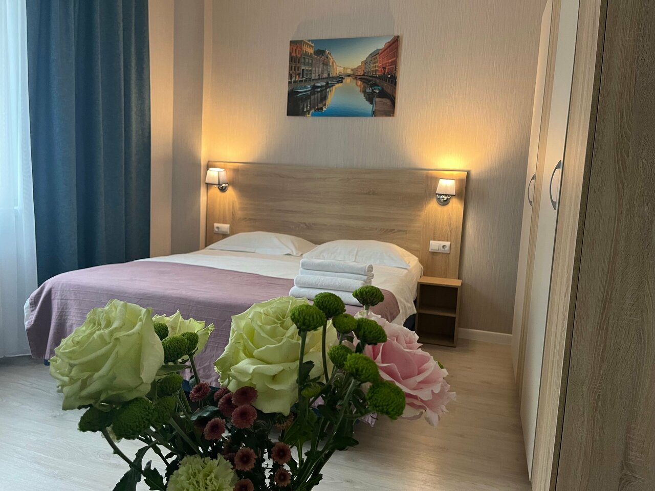 Вид из номера был хороший, заселили вовремя, в номере есть чайник и утюг (будьте аккуратны с паром, у нас пошла ржавая вода с утюга испортили белую блузку). Кровать более менее, но это не точно потому что спала по 4-5 часов всего на ней, много гуляли . Наверное из плюсов это все. От метро минут 15 в хорошем темпе шагать. Номер выглядит не опрятным, пошарпаным что-то где-то отвалилось, отломилось где-то пыль , где-то грязь. Полотенец всего 2 на человека, для ног 1 на двоих дали. Дверь в санузел не закрывалась (замок сломан) . Можно найти варианты получше за эту цену.