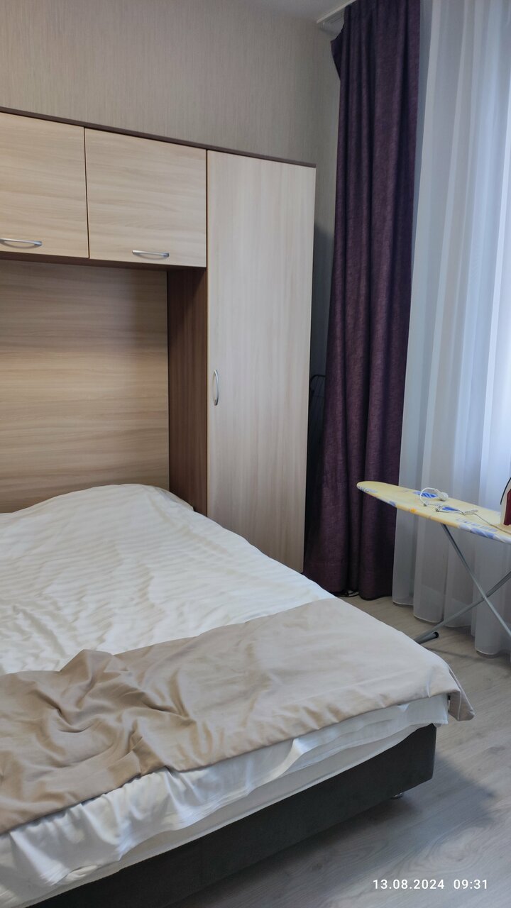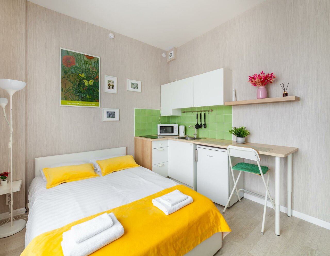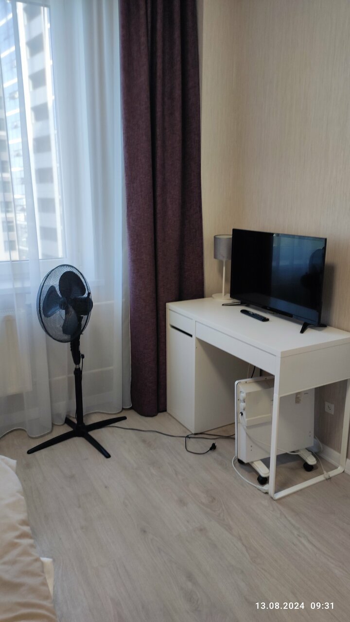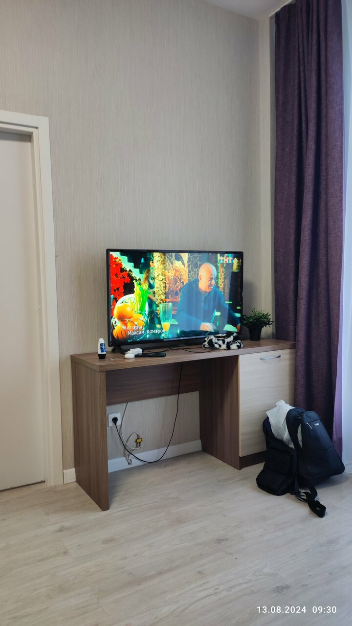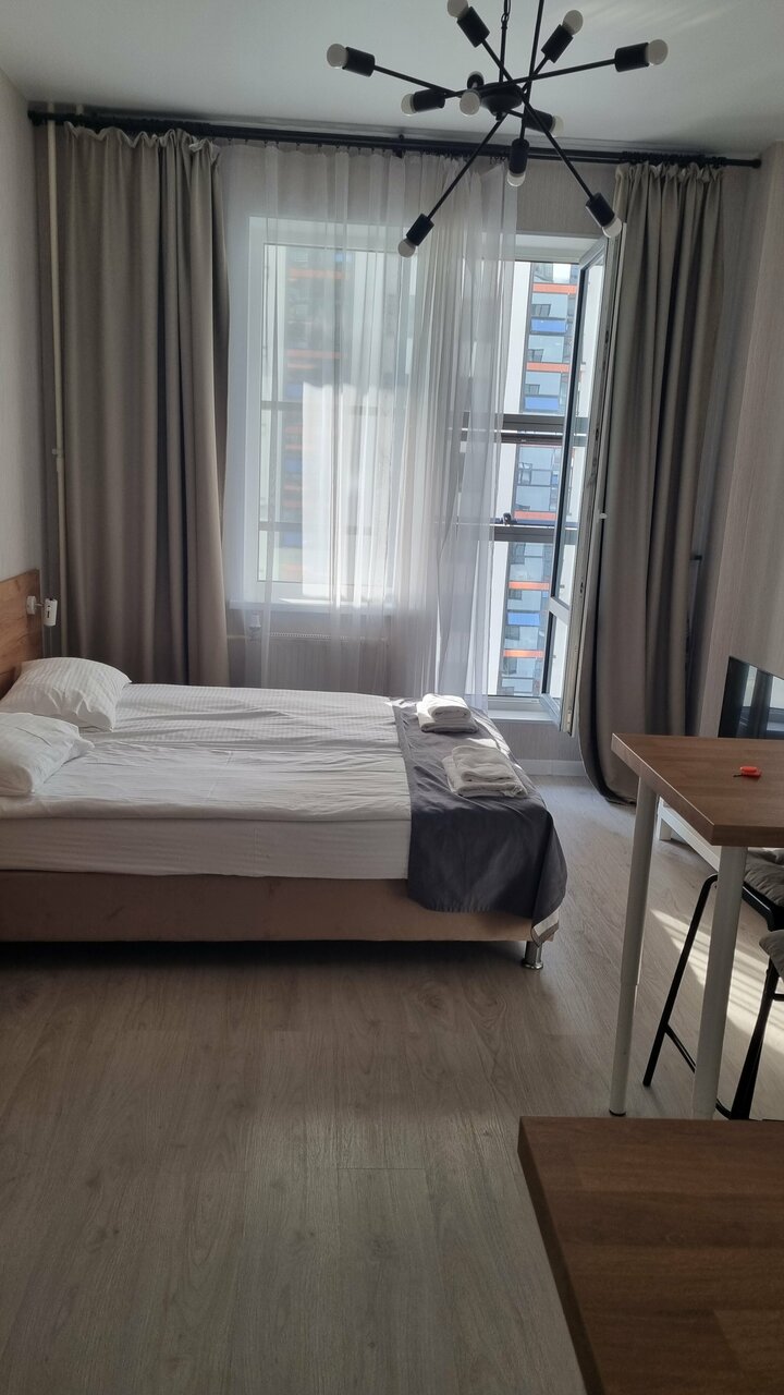 Это первые апартаменты, где нам понравилось все! Красивый вид, где каждый вечер был закат, вид на наш полюбившийся парк.. В номере был телевизор с смарт тв, что огромный плюс! 19 этаж.. Столовые приборы, посуда нужная. Для завтраков самое то! Была стиралка, много полочек, шкафчиков, утюг, доска для утюга, фен, мыло, средство для посуды, тряпочки, полотенца, сушилка, чайник, холодильник, свч, письменный стол, вай фай и кровати вместе соединенные с классным матрасом, на котором максимально удобно! Теперь домой хотим такой же матрас Парковка бесплатная вокруг домов была, но не сразу найдешь место) платный паркинг под домом, где ночь 400 стоила) Была уборка согласованная. Администраторы помогали со всеми вопросами!) фото комнаты нет, она была у нас с оранжевыми подушками и зеленым стулом за письменным столом.