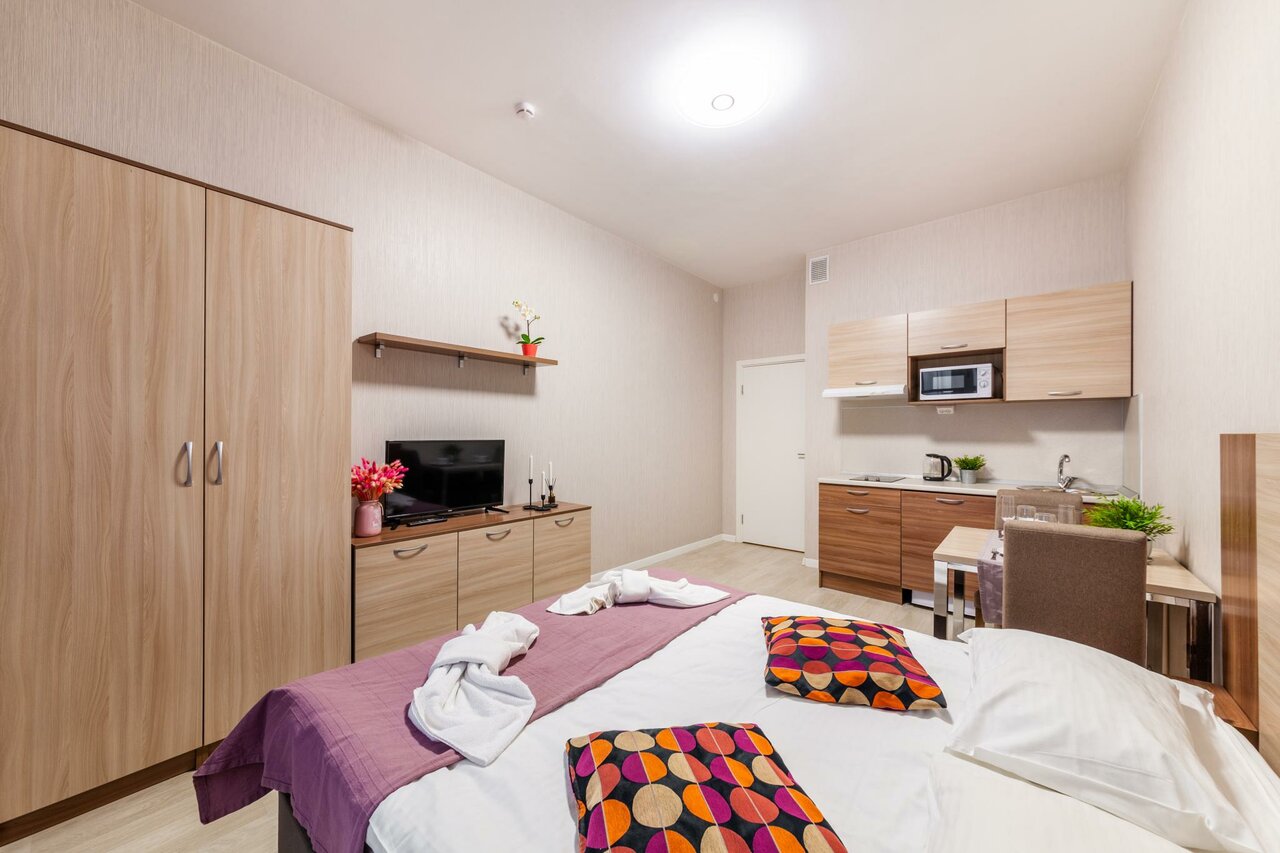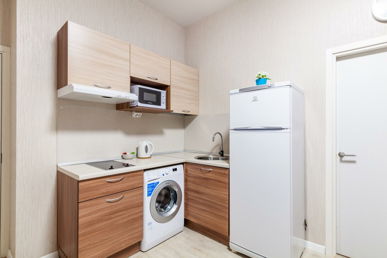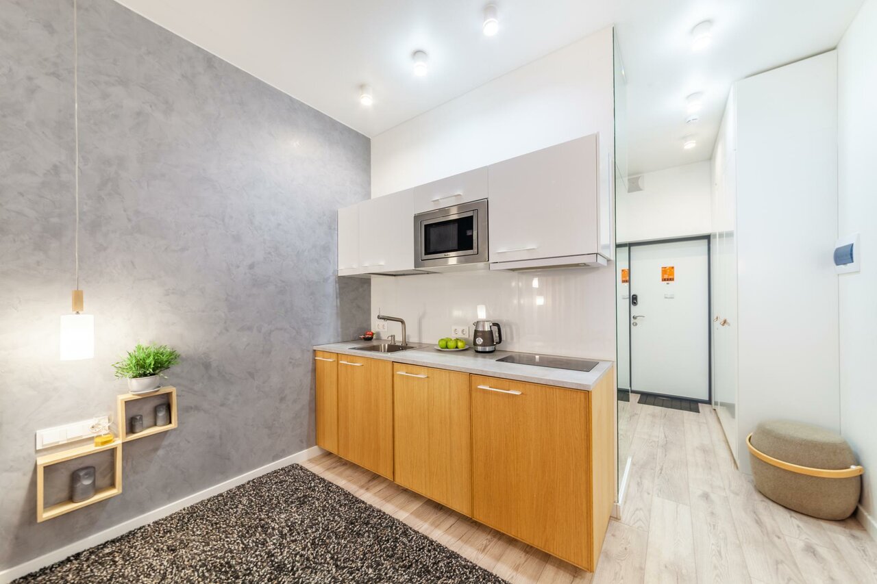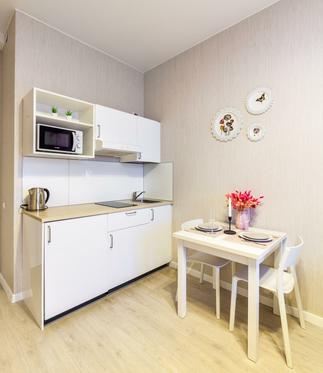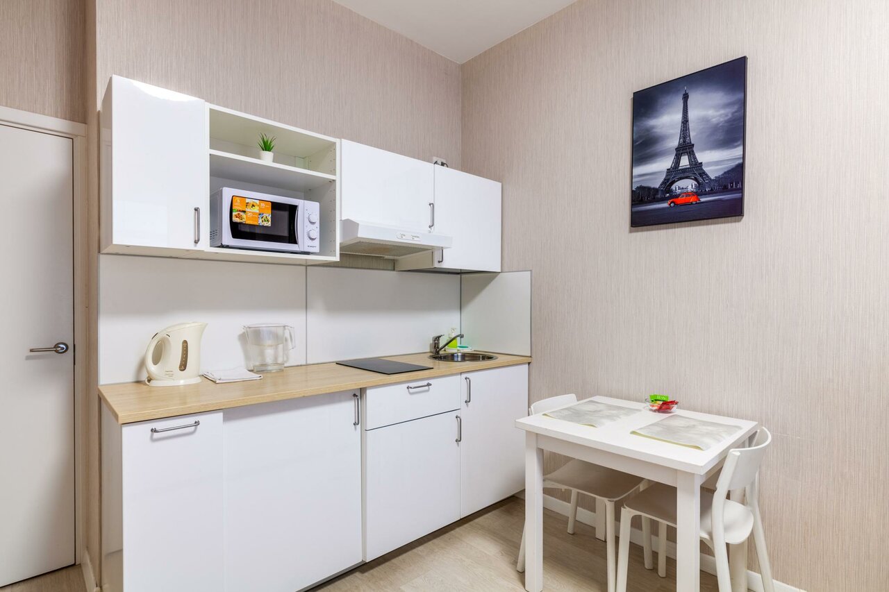 Останавлилась перед ночным рейсом, удобное расположение, внизу есть вкусвилл и кофейня. Кухня и ванная в полной комплектации.