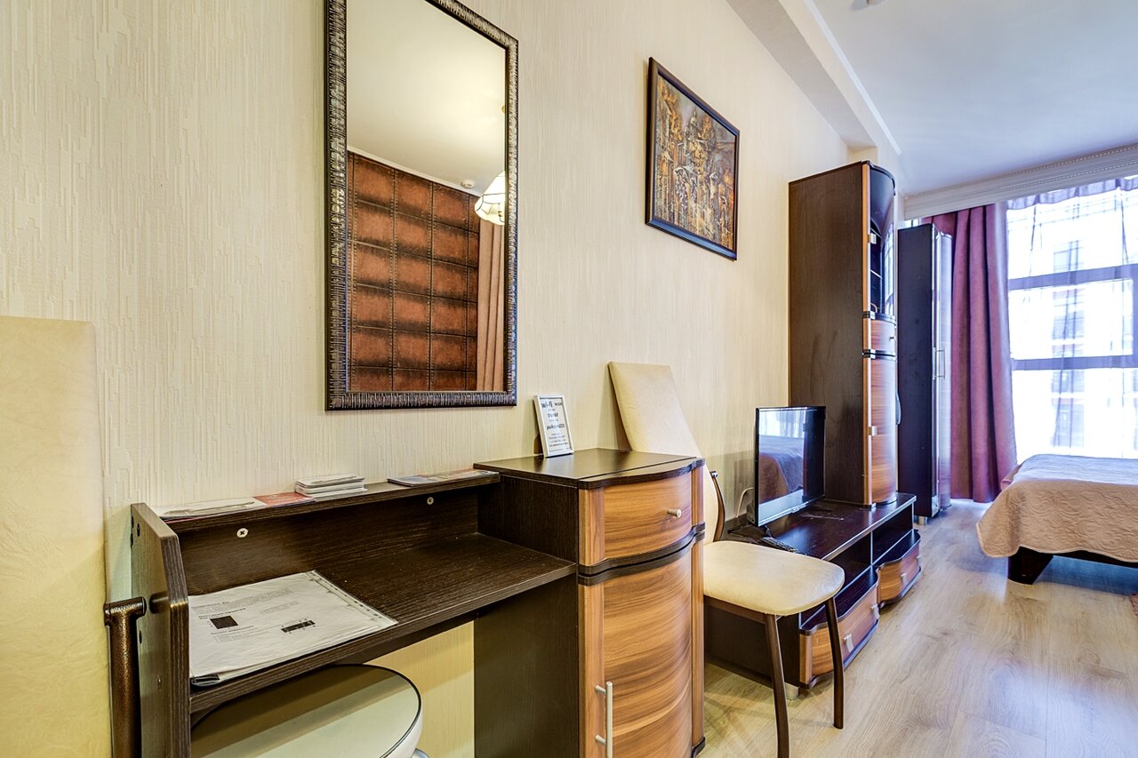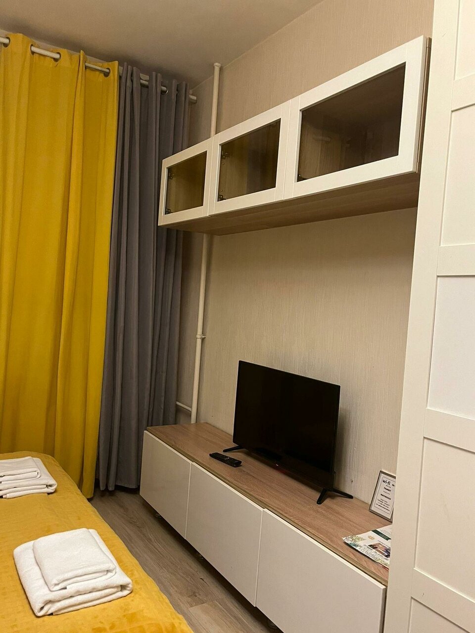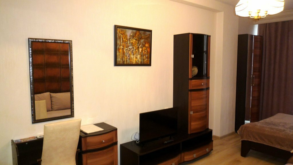 Небольшая комната, где есть всё необходимое. Удобная кровать. Проблема с парковкой — очень мало мест, приходится искать куда поставить машину. Рядом парк, недалеко метро.