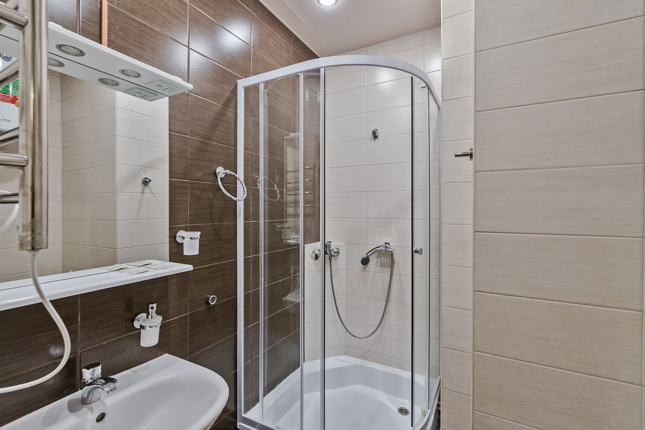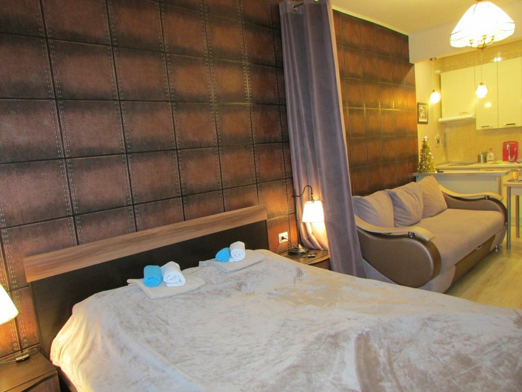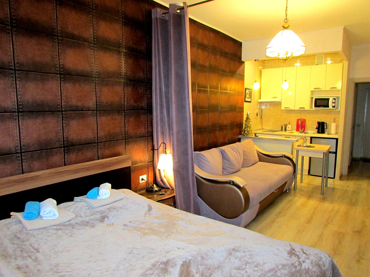 Номер 27м2 с мини кухней. Душ. Панорамное окно. Кровать 160см с ортопедическим матрацем. Возможность дополнительного спального места-пружинный диван.