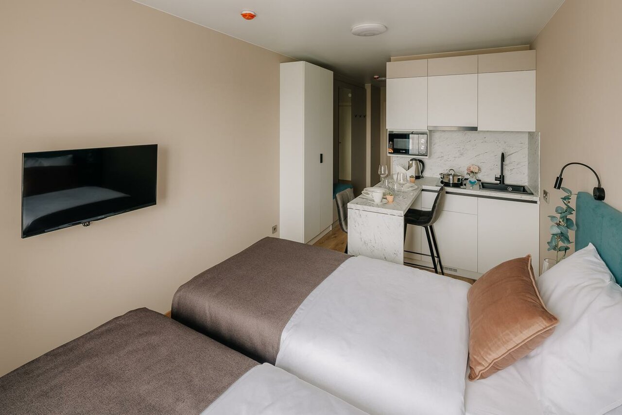 Нам всё понравилось. Чистый, новый современный аппарт- отель. На входе ресепшн, кофемашина, место для хранения багажа, три лифта. От метро 3 минуты. Рядом остановки общественного транспорта. В комнатах всё новое. Шум от дороги до нашего этажа не долетал.