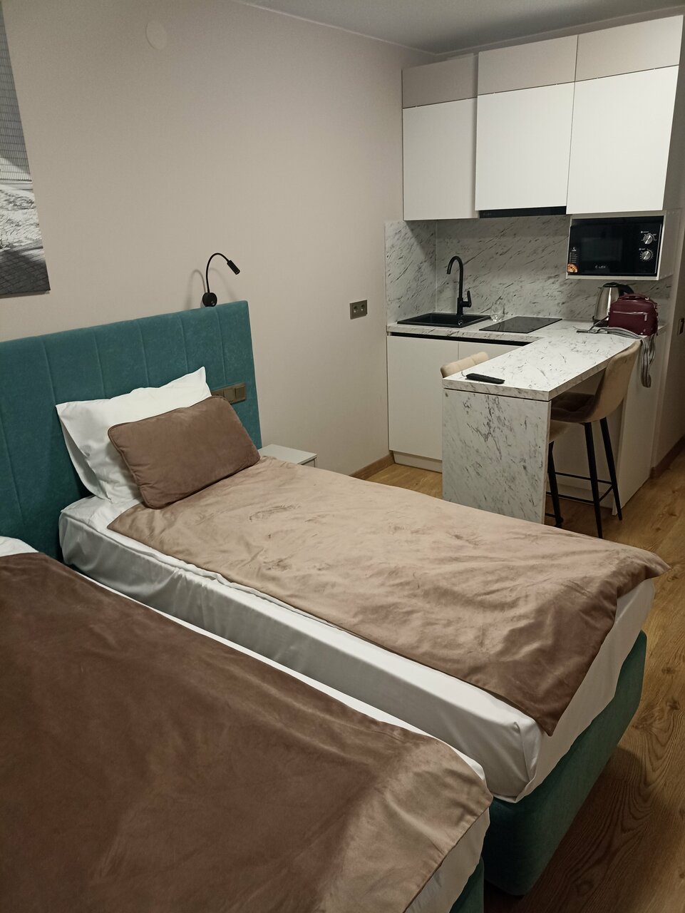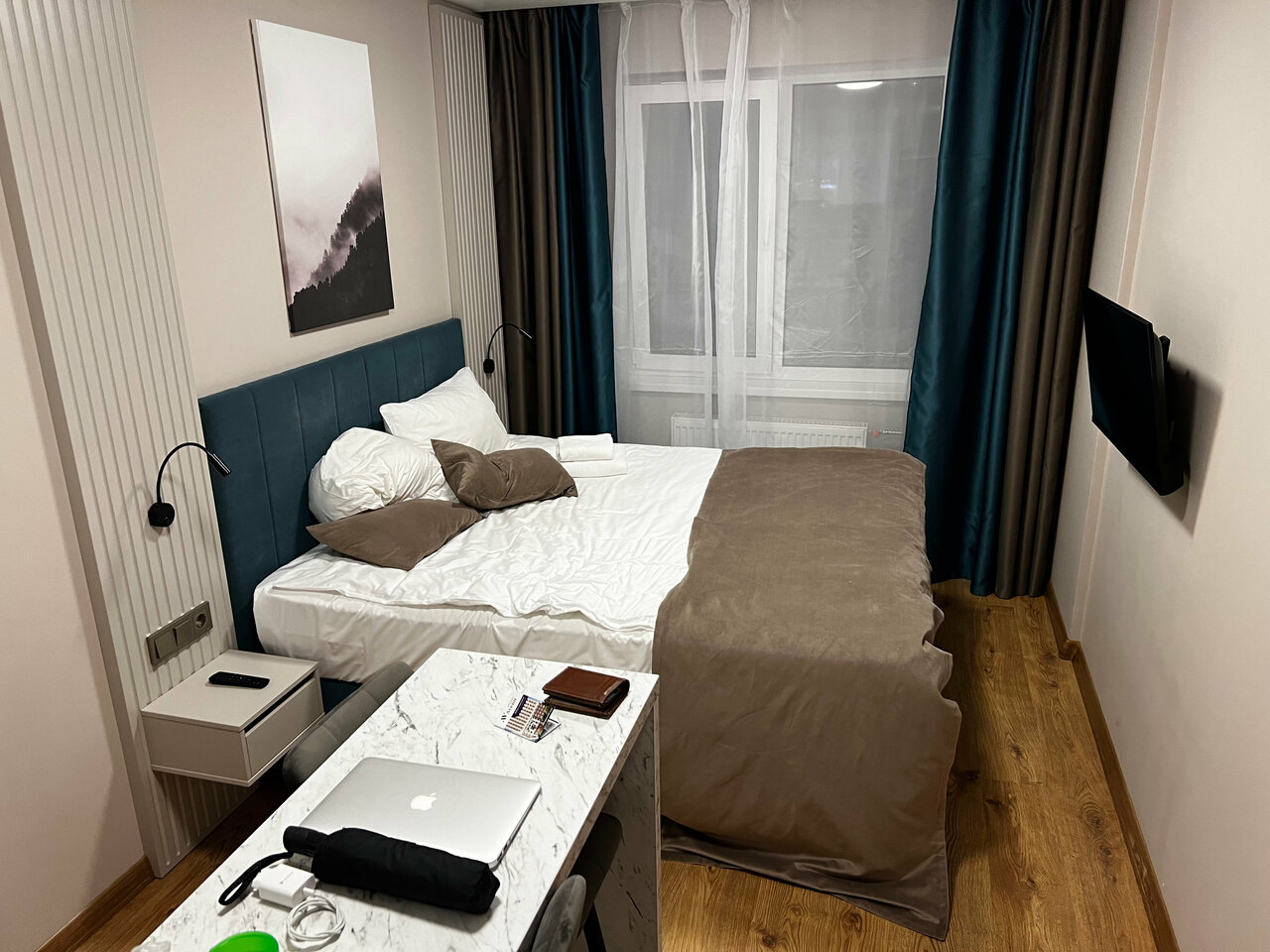 Уютное место рядом с метро. В номере нет питьевой воды и одноразовых тапочек, имейте это ввиду. Мне кажется, это уже такой стандарт, что отсутствие удивило. На утро после заселения и ночёвки прислали на телефон инфу, где в числе прочего было написано, что тапочки можно запросить у администратора. Удобно, что есть кухонька и микроволновка. Рядом с отелем есть Перекрёсток, купила там еды, разогрела и поела в номере