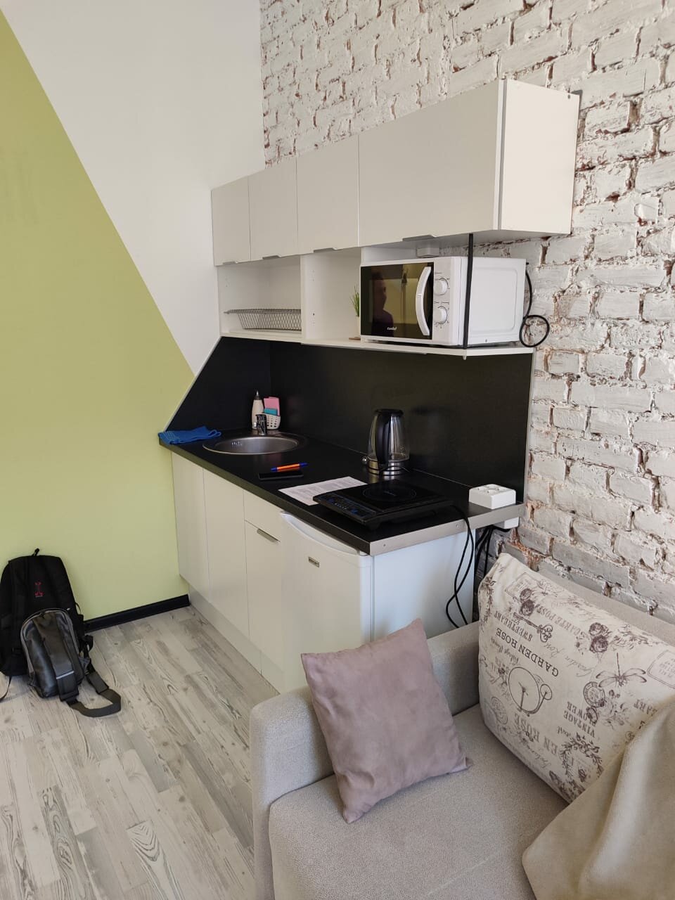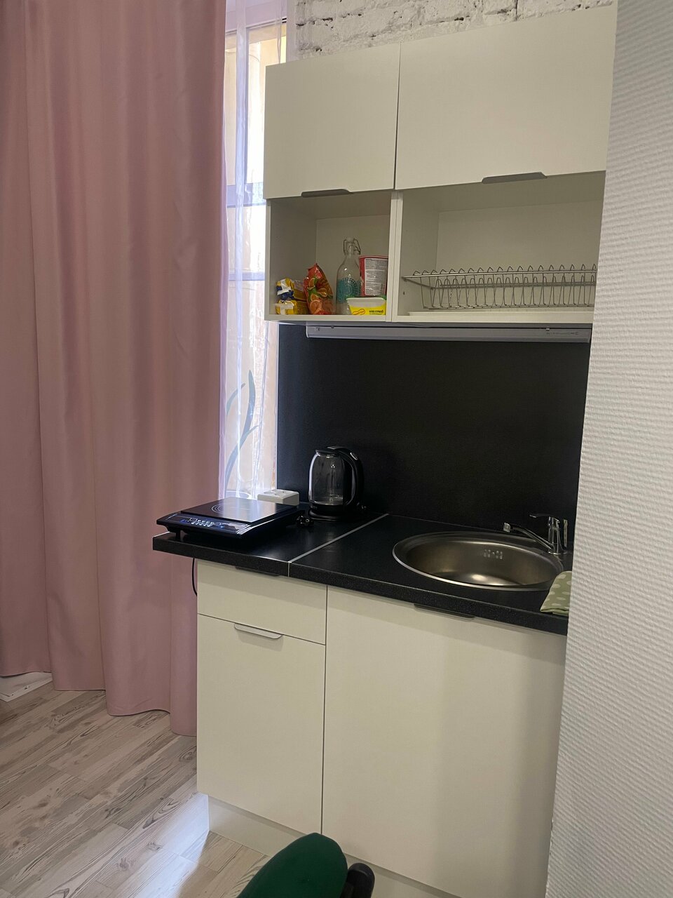 Студия супер: ремонт свежий, кровать и матрац удобные (спина не болит!). Кухня с мини-плитой, чайником и холодильником. Есть стиральная машина, утюг, гладильная доска и фен. В квартире дают стопку чистых полотенец и 2 бутылочки питьевой воды (спасибо огромное!). Жить в квартире вдвоем или одному очень комфортно. Не жарко, не холодно и не душно. Окна открываются, шторы полностью изолируют свет с утра — выспалась отлично. Есть вентилятор. Квартиру советую. Хозяин очень приятный, во всем помогает. Заселение бесконтактное — заеде и выйдете в любое время в разрешенном интервале, никого не нужно ждать. Большое спасибо хозяину за комфортное проживание, Питер со своим сервисом держит марку на высоте!)