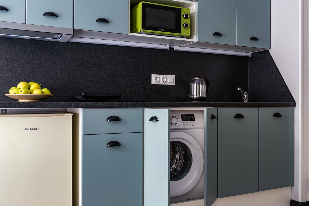 - Полная комплектация всем необходимым (кухня, стиральная машина, утюг, фен и др.).