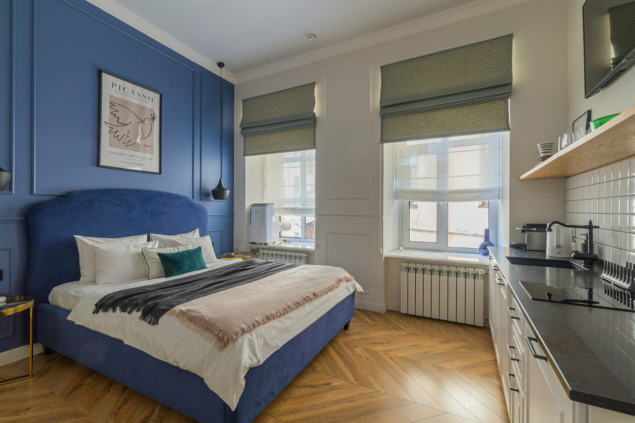 Прекрасные апартаменты. Шикарный вид, качественный и стильный ремонт, атмосфера Петербурга обеспечена! Снимали небольшой номер с бирюзовым диваном и камином. В номере есть всё необходимое. Спасибо!