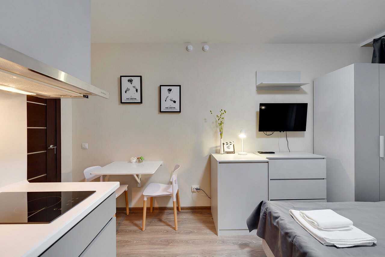 Удобные апартаменты в стиле современной классики. Общая площадь 23 кв.м. Вместимость 2 человека. Номер с полностью оснащенной кухней, собственной ванной комнатой и балконом.Сатиновое белье, махровые халаты, тапочки - у нас есть всё, чтобы вы чувс