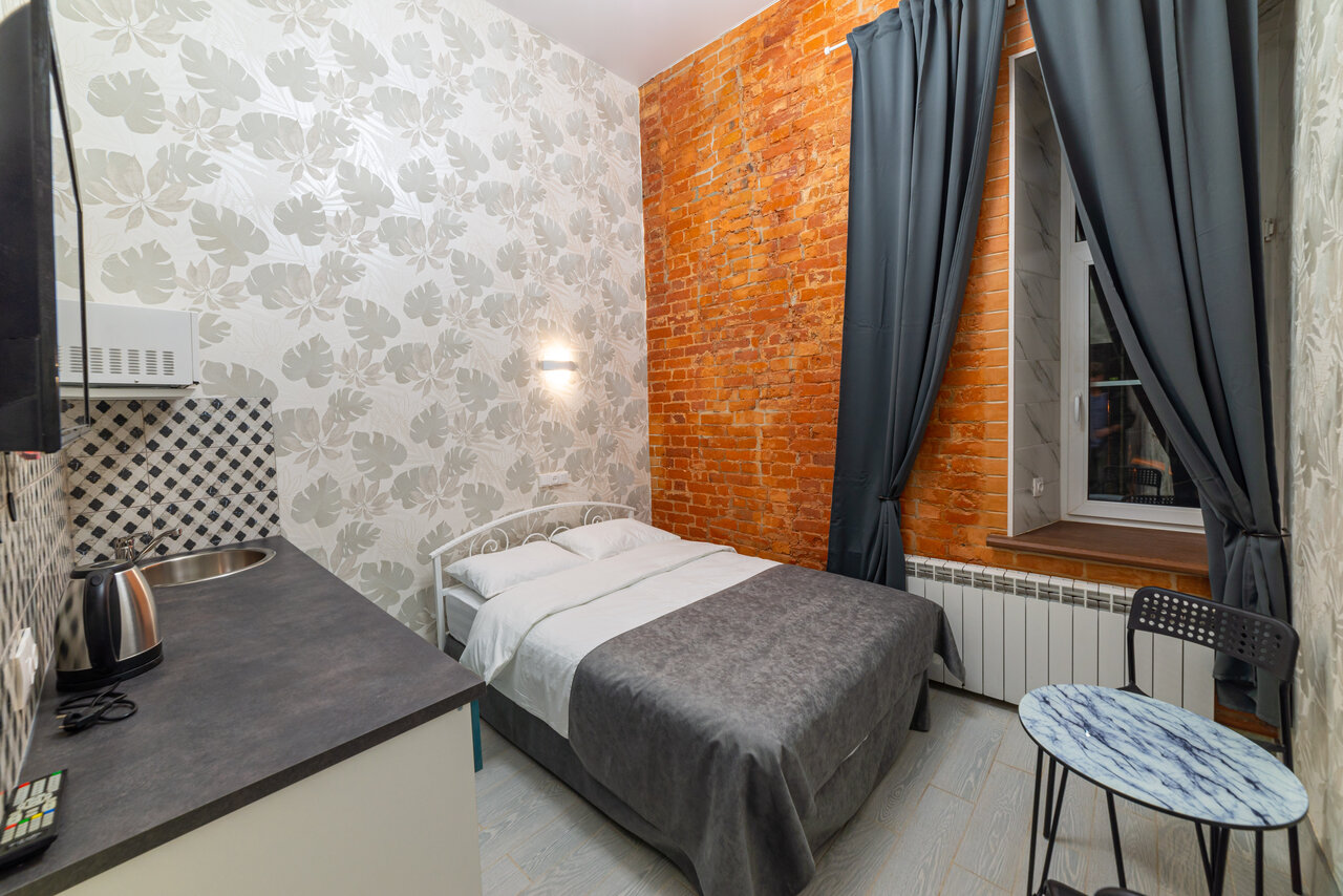 1-2 человека от 1 800 руб./сутки. Двухспальная кровать. Джакузи и туалет в комнате. Мини-холодильник, чайник, посуда и СВЧ. Телевизор и Wi-Fi. Полотенца, одноразовые тапочки.