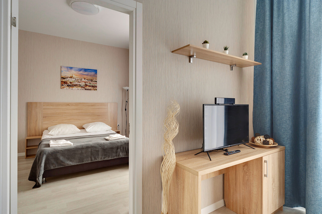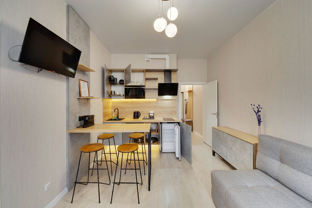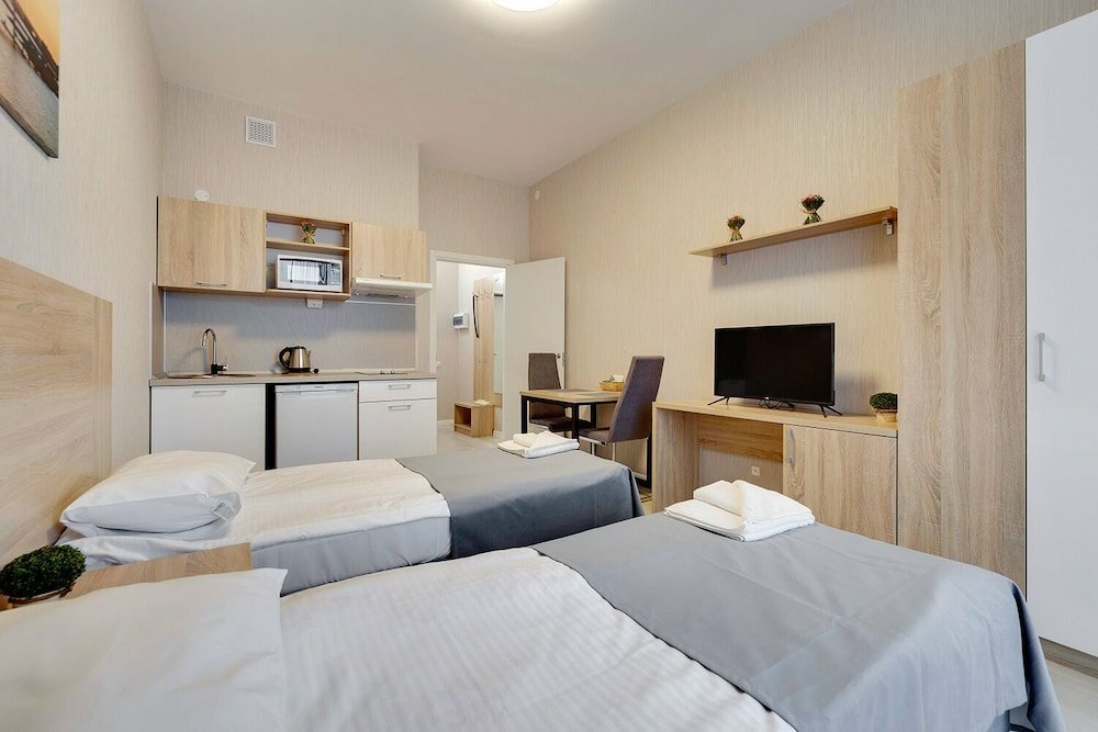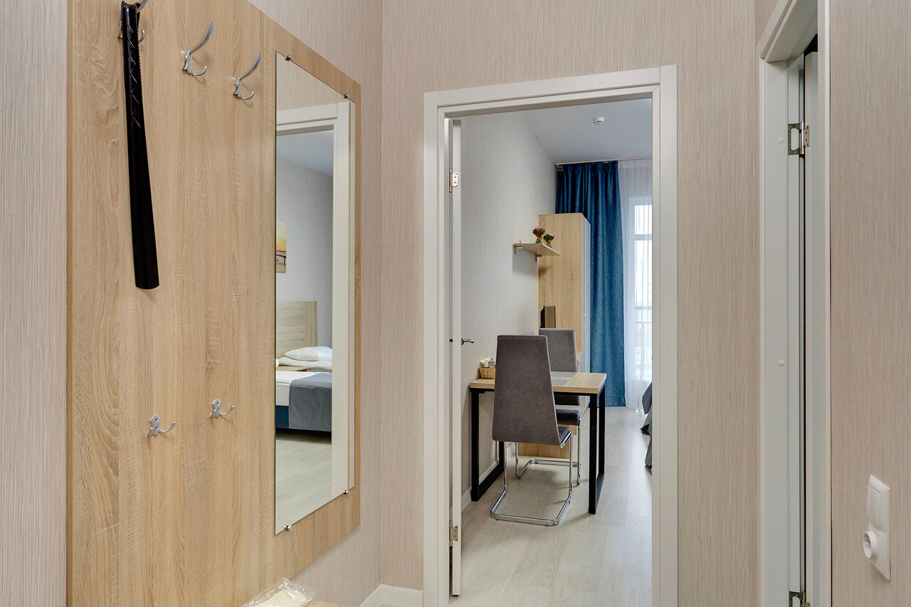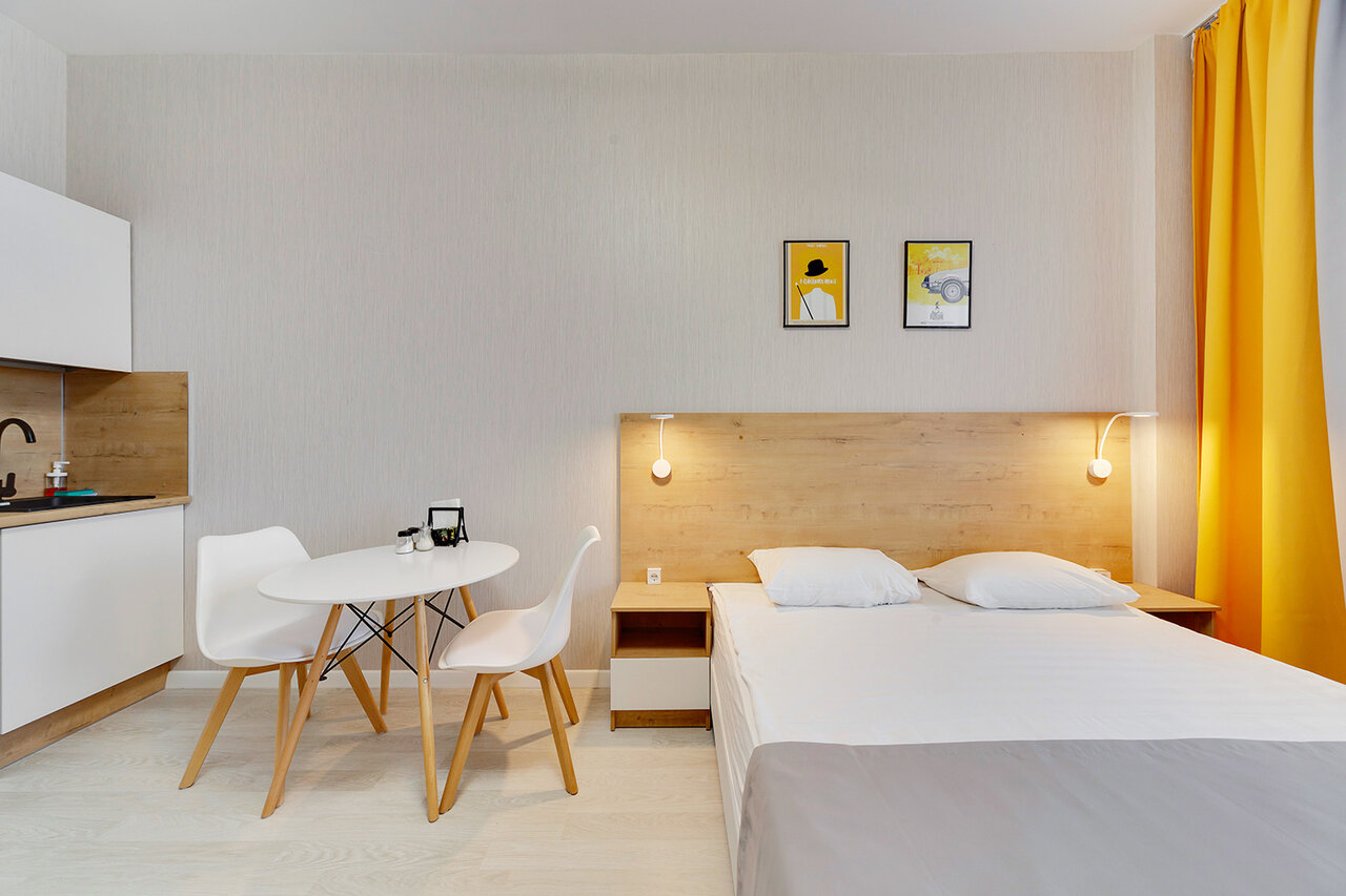 Для тех, кто предпочитает максимум, не переплачивая. Эргономичные апартаменты общей площадью 24 кв. м. Вместимость 2-3 человека.