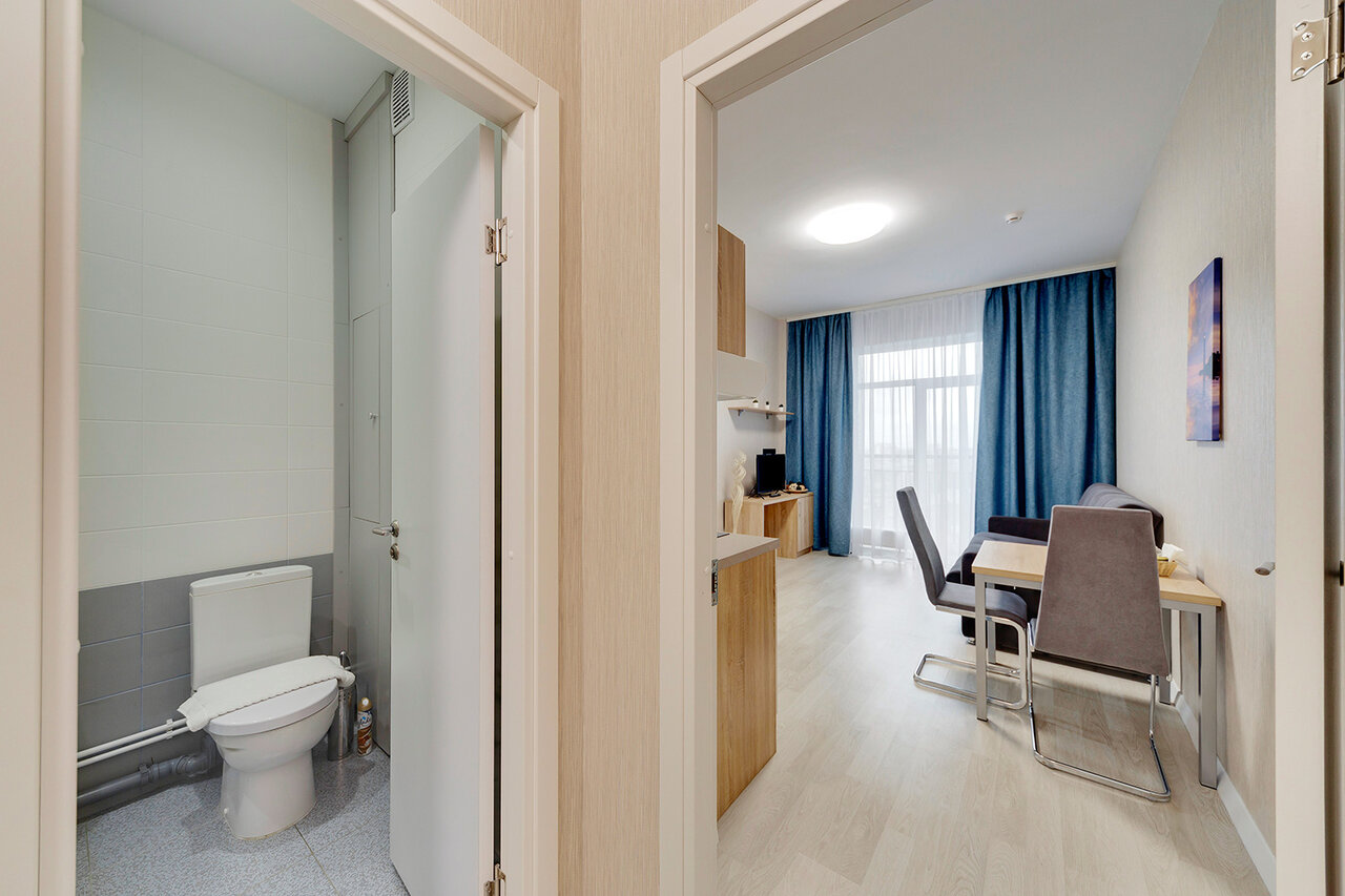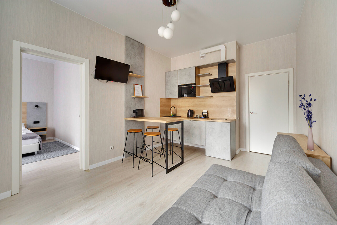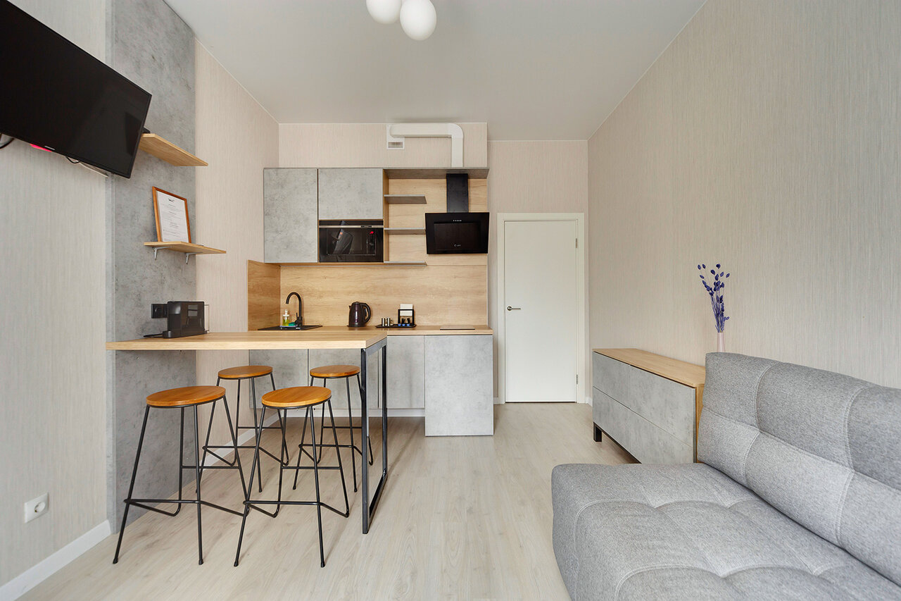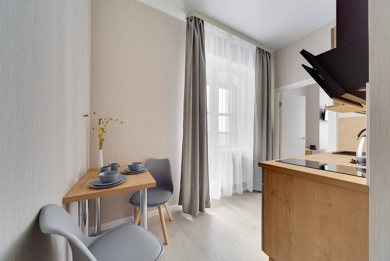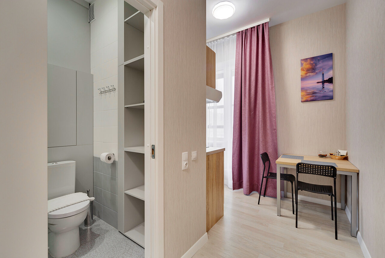 Для тех, кто предпочитает максимум, не переплачивая. Эргономичные апартаменты общей площадью 24 кв. м. Вместимость 2-3 человека.
