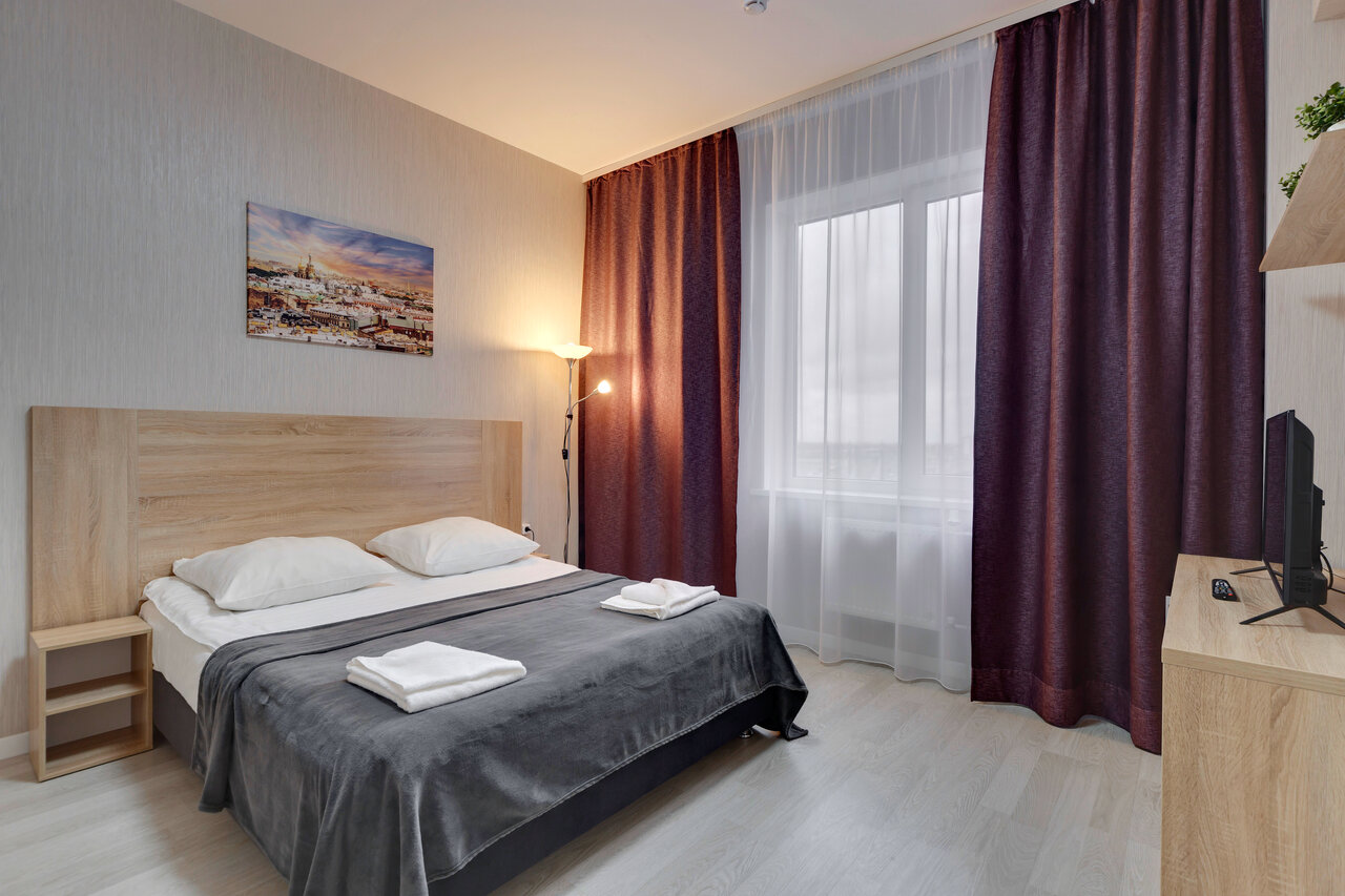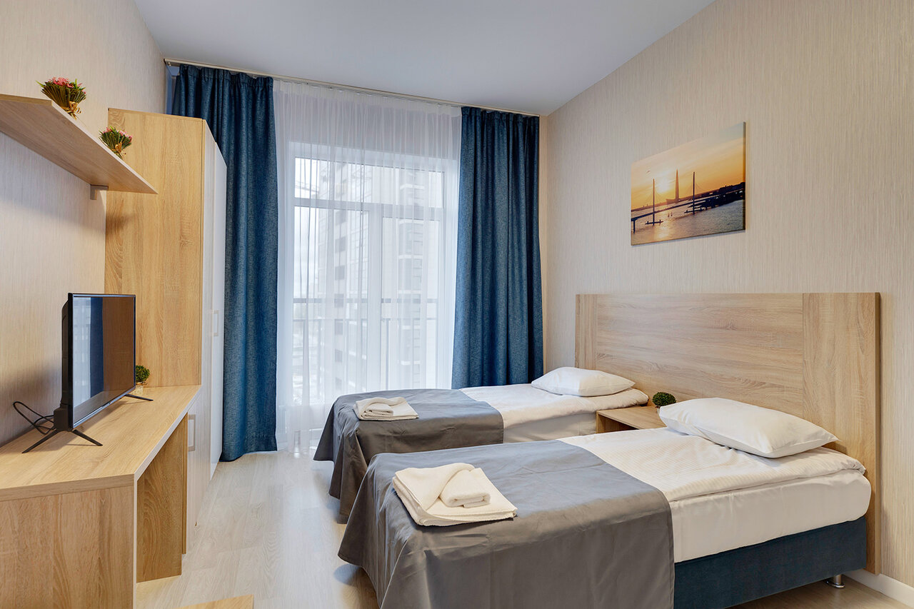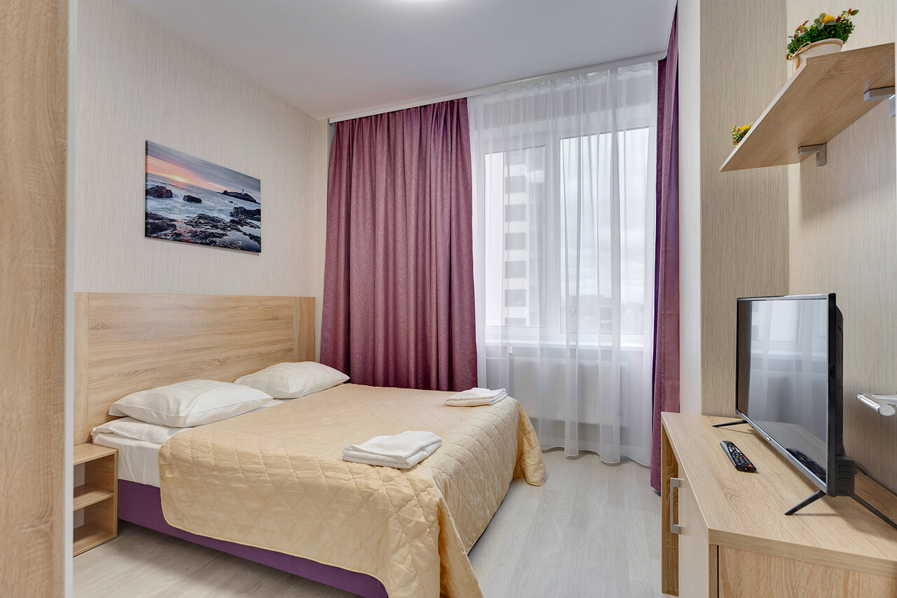 Заселились на неделю, цена была самой привлекательной во всем Питере (15 тысяч за номер-студию на двоих), нас по ошибке заселили в двухкомнатный номер, поэтому двойне понравилось. Номера с хорошим ремонтом, однако была сломана душевая кабина (дверка не закрывалась и вода долго смывалась). Также там видимо очень плохо убираются, так как повсюду волосы прошлых жильцов и грязные пятна. Чайник ржавый и кипятить в нем воду не стали. Вода какая-то желтоватая, поэтому лучше купить пятилитровку питьевой воды (мы так и сделали и было отлично). Обслуживание неплохое, но на ресепшене девочки не знали ничего (звонили кому-то, чтоб узнать информацию). От метро минут 10-15, по пути есть торговые центры. А также много магазинов рядом (Магнит, Пятерочка, Перекресток) В номере ни разу не слышали соседей, поэтому здесь плюс. Подводя итог, есть минусы, но они быстро устранимые и в основном все отлично.