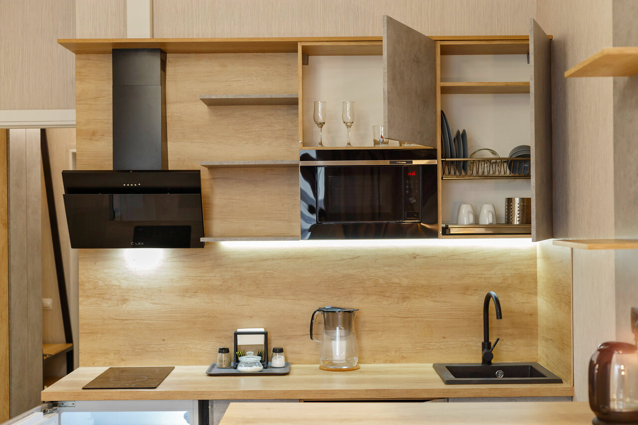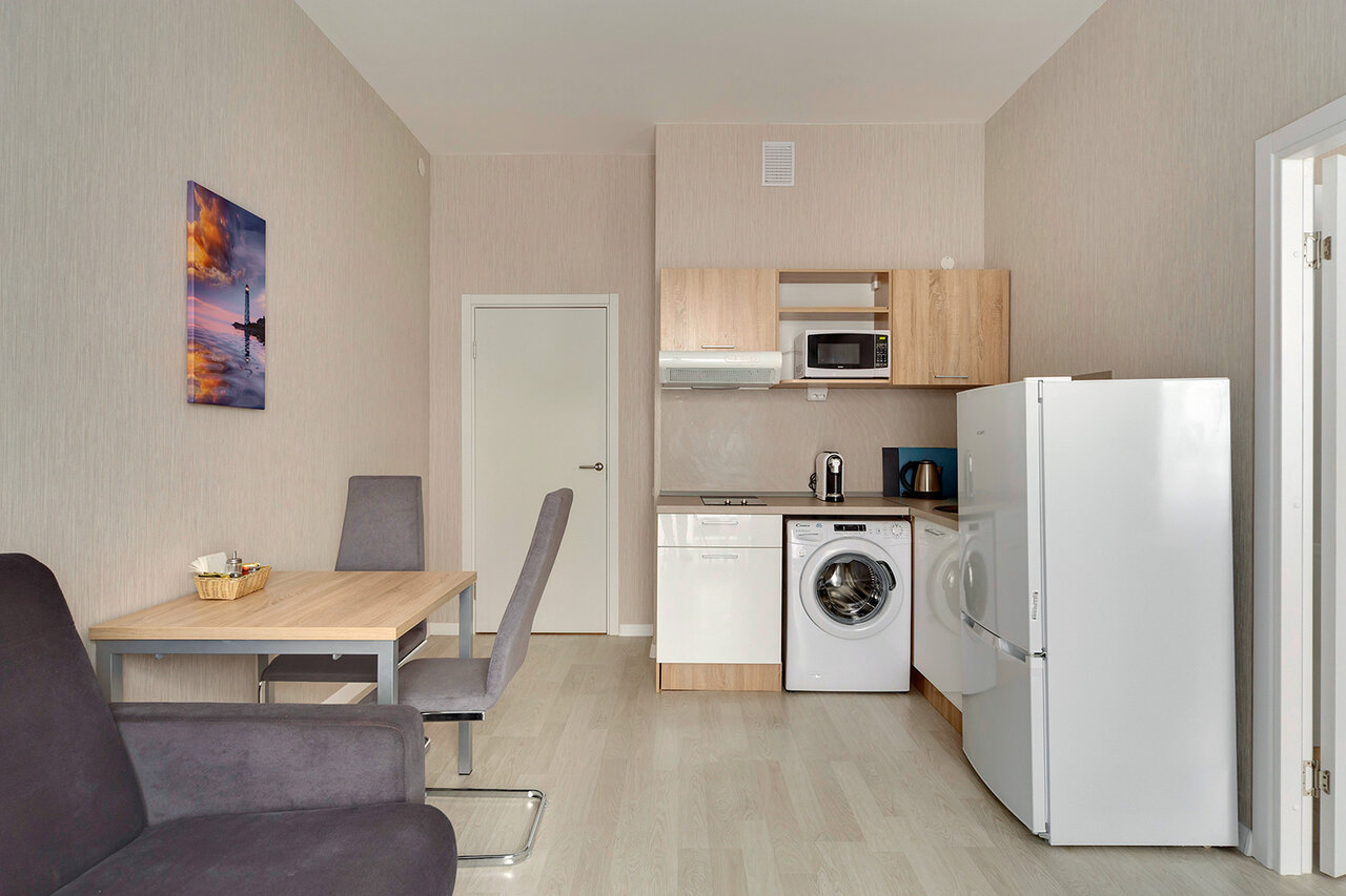 - Наличие кухни, плиты, микроволновки, стиральной машины.