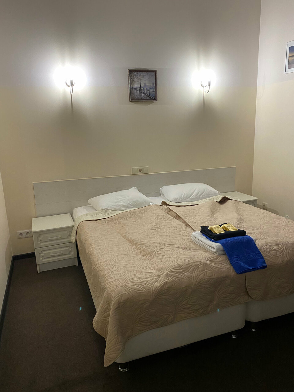 Снимали семьёй двухкомнатный номер со своей ванной комнатой. В номере было всё необходимое: чайник, телевизор и холодильник, достаточное количество полотенец и душевых принадлежностей, одноразовые тапочки. В отеле было тихо, кровати удобные, спалось хорошо. Расположение удобное. Можно не далеко ночью прогуляться посмотреть разведение мостов. Рядом есть магазины, кафе и не дорогие столовые. Своей парковки у них нет, но администратор посоветовал, где можно бесплатно оставить машину на ночь. Спасибо за приём)