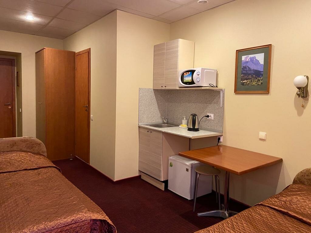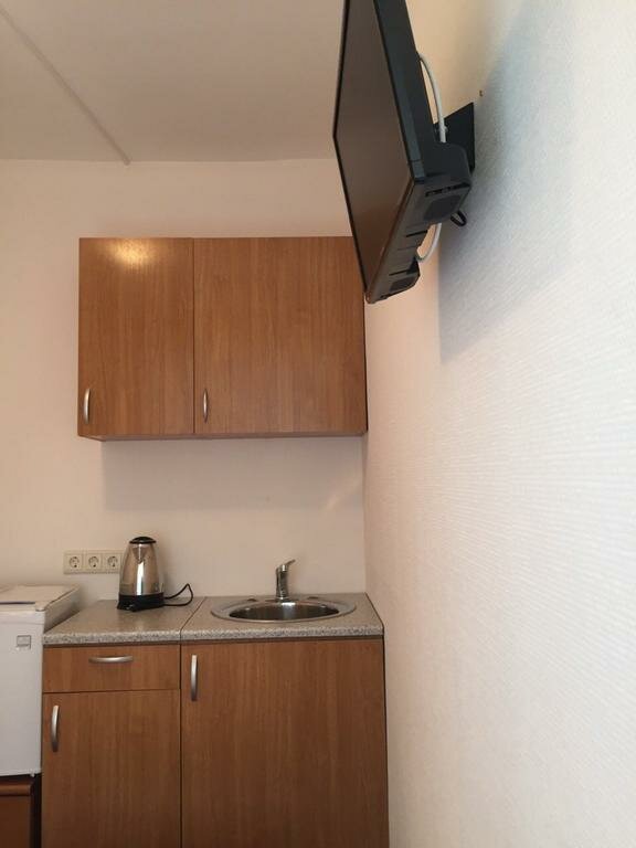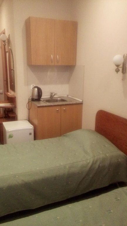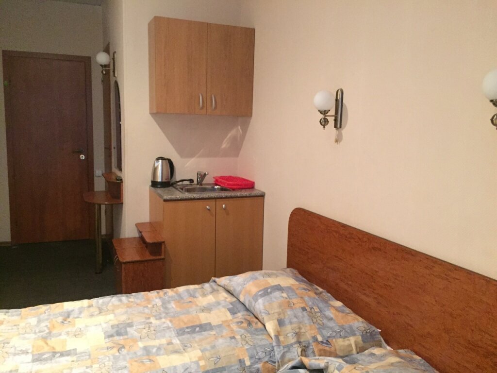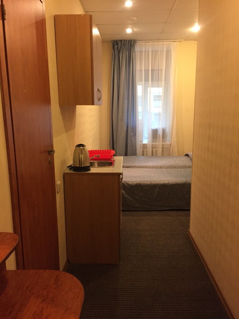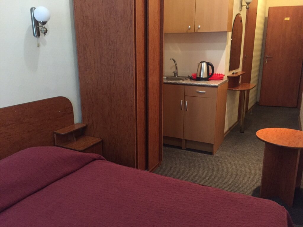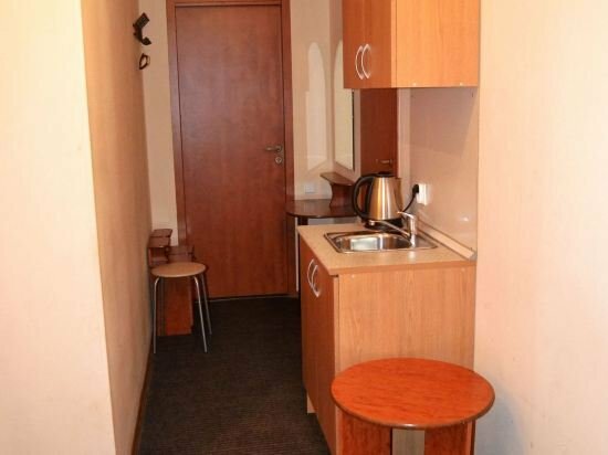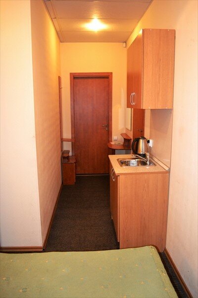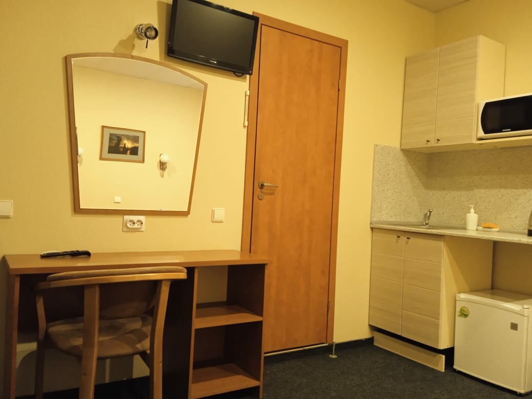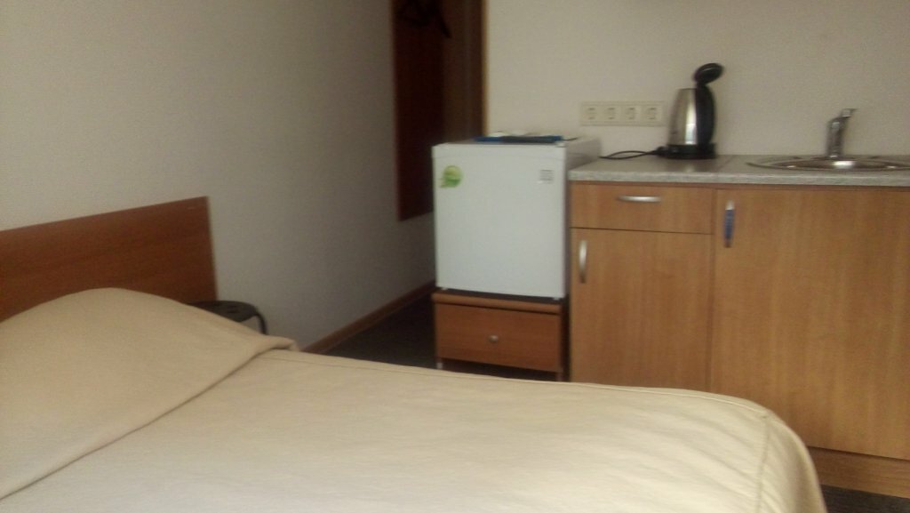 Номер ‘квартира-студия’ очень маленькая. Из удобств телевизор на стене, большая кровать, маленький холодильник, умывальник, тумбочка у душевая кабина с феном. В принципе все есть. Микроволновка находится в общем коридоре. .Ключ от номера нужно получать не в самой отеле, а в соседнем отеле на 6-ой красноармейской. Единственное, что мне не понравилось, так это отсутствие хотя бы маленького столика или стула, чтобы покушать за ним. Очень адекватная цена аренды.