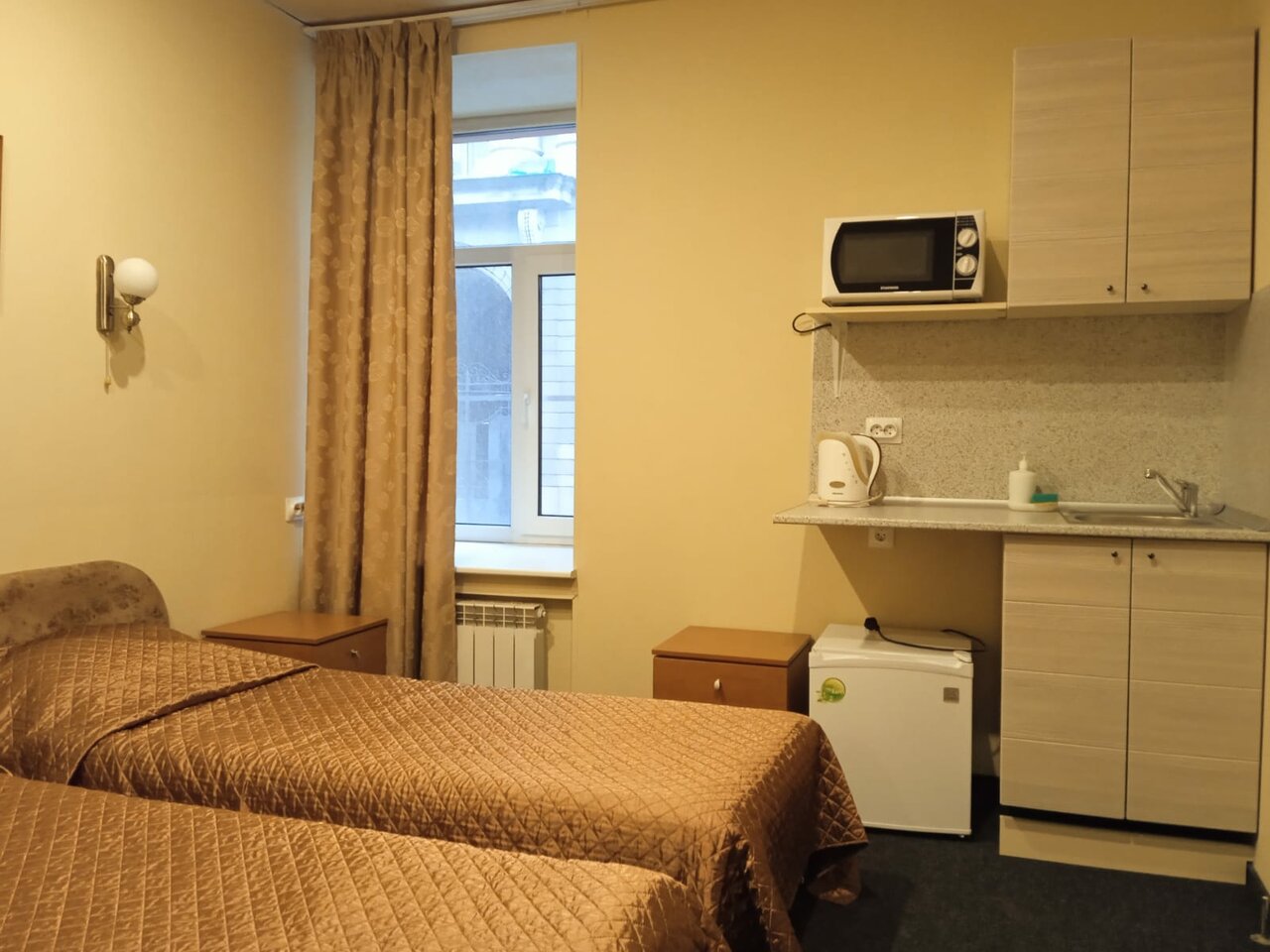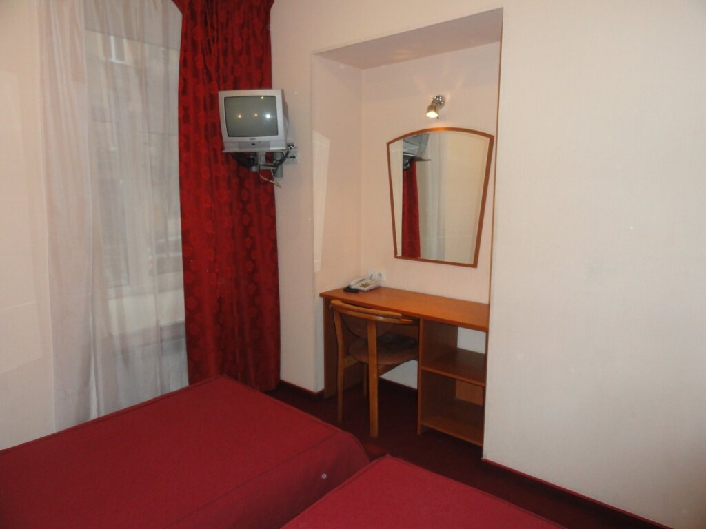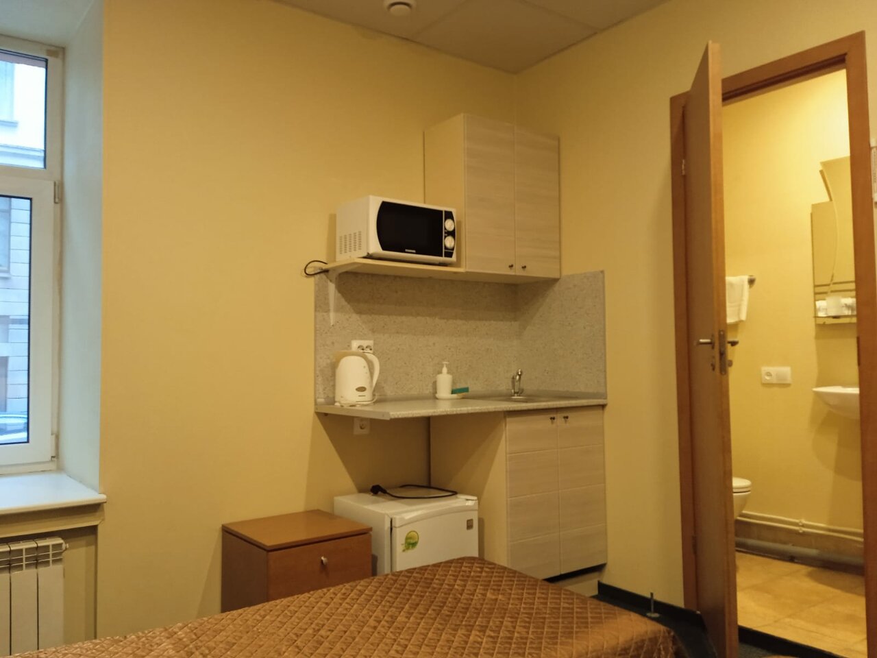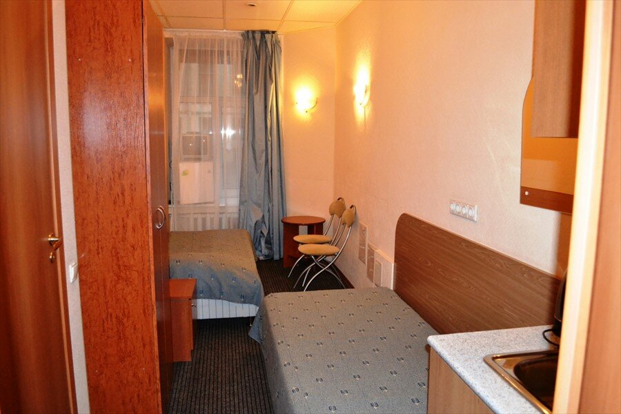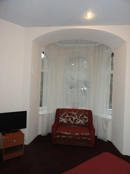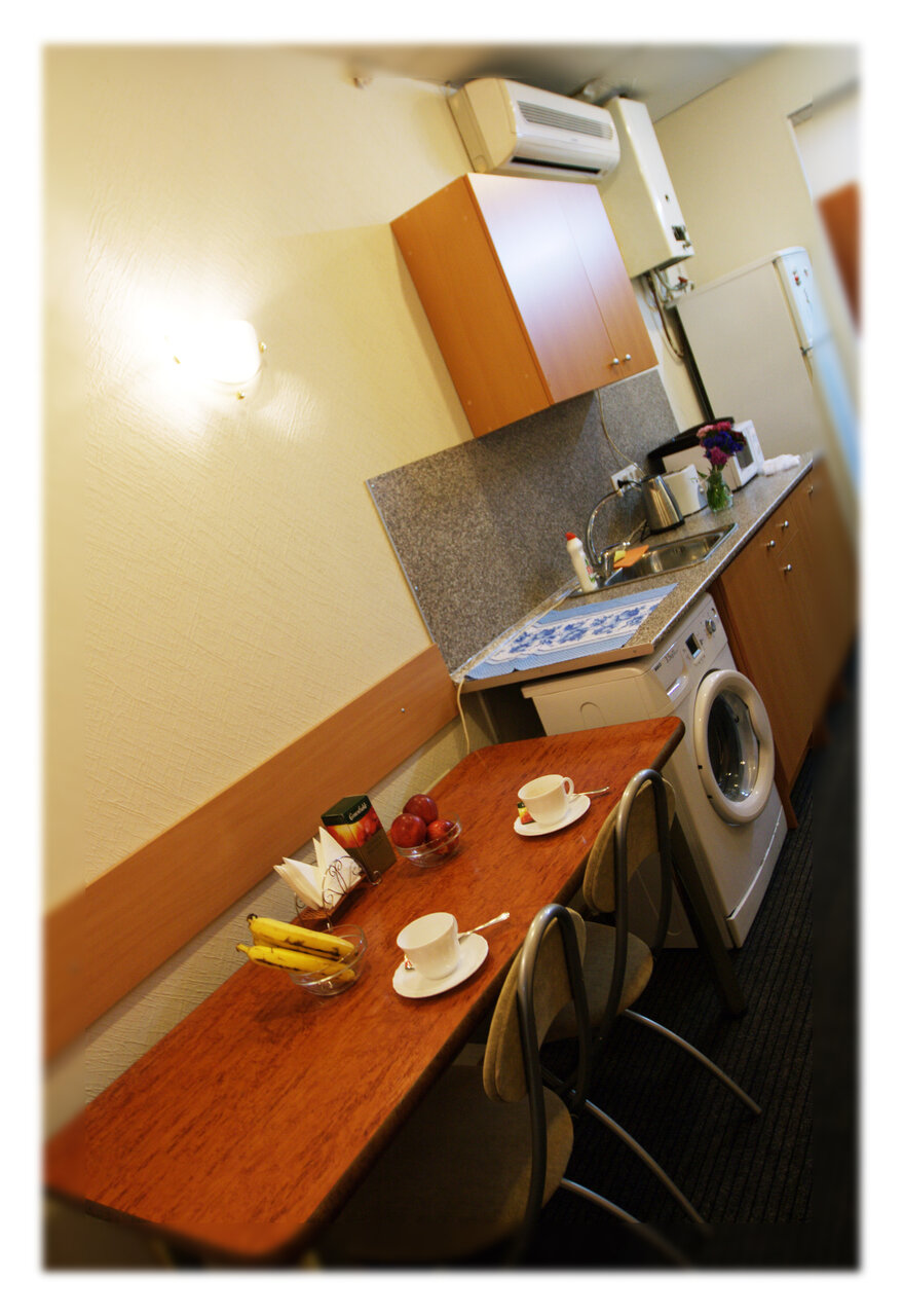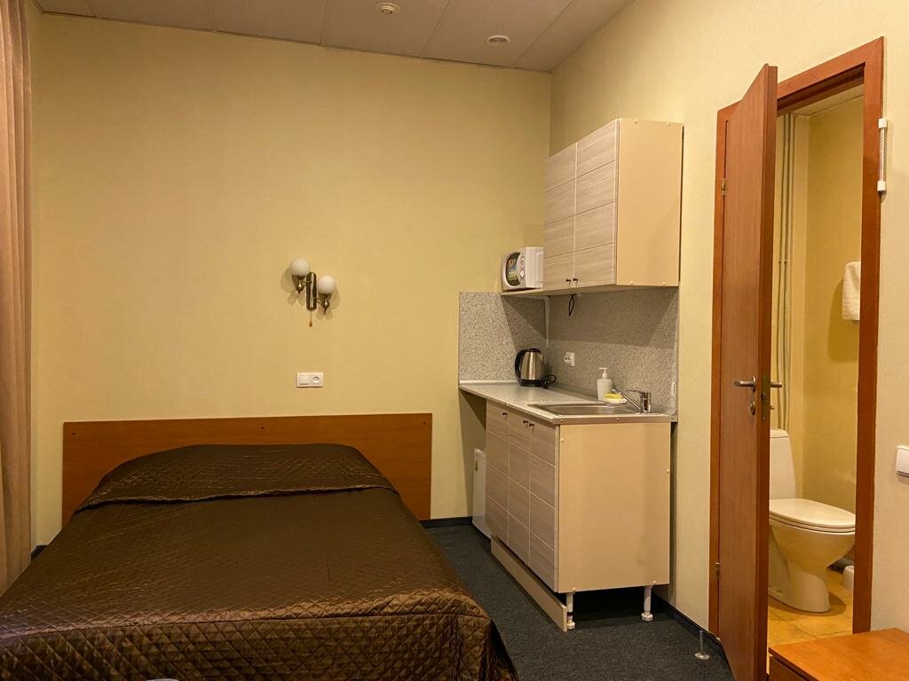 Номер ‘квартира-студия’ очень маленькая. Из удобств телевизор на стене, большая кровать, маленький холодильник, умывальник, тумбочка у душевая кабина с феном. В принципе все есть. Микроволновка находится в общем коридоре. .Ключ от номера нужно получать не в самой отеле, а в соседнем отеле на 6-ой красноармейской. Единственное, что мне не понравилось, так это отсутствие хотя бы маленького столика или стула, чтобы покушать за ним. Очень адекватная цена аренды.