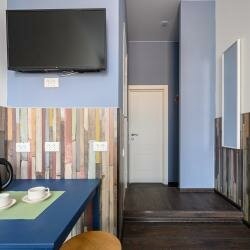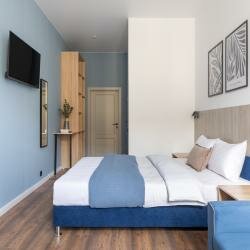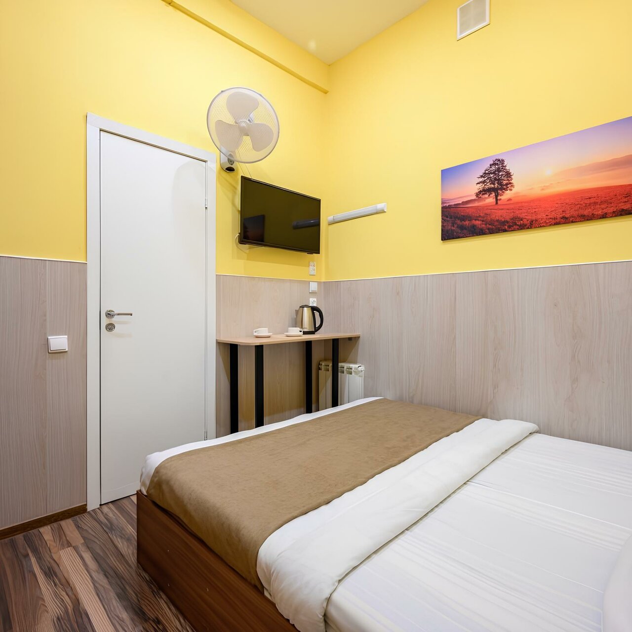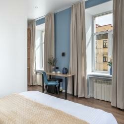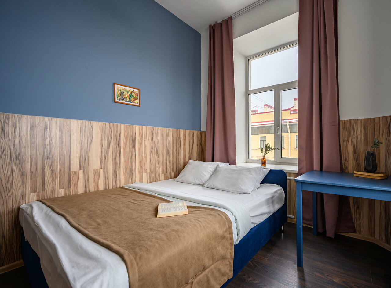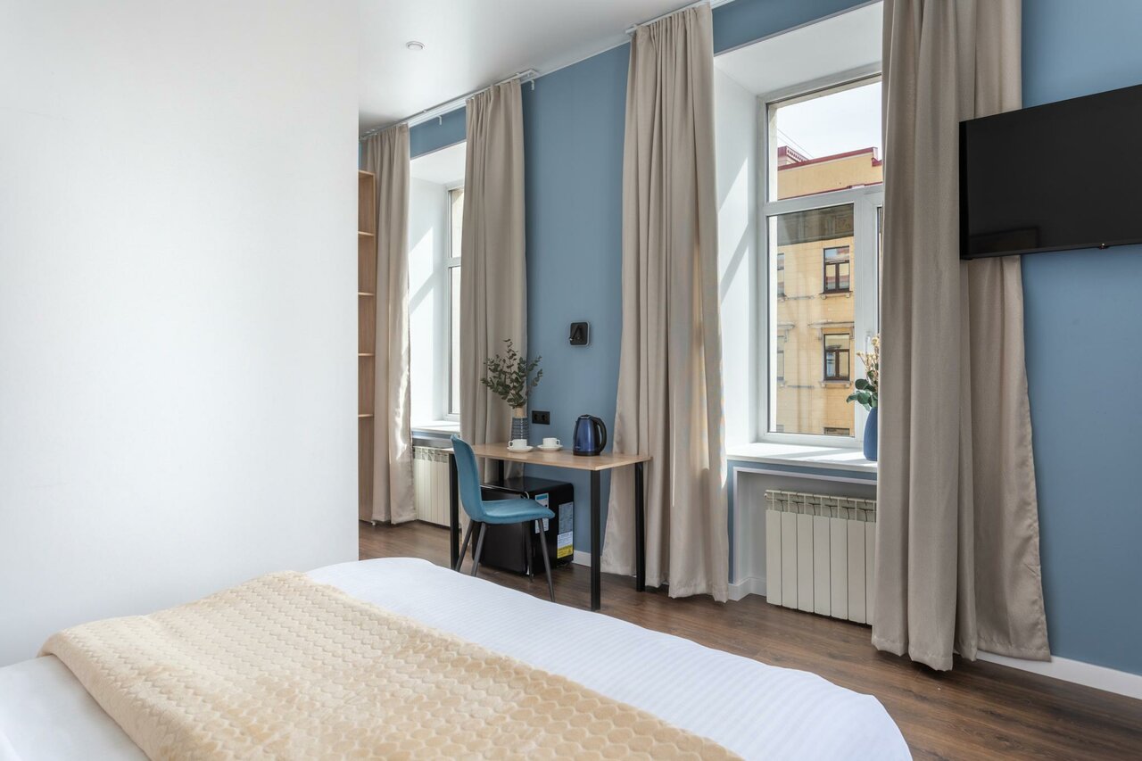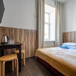 Двухместный номер с с/узлом и двуспальной кроватью. Вид из окна на Невский пр . Для гостей постельное белье и полотенца. В номере телевизор, чайник и чашки, стол и шкаф. В ванной туалетные принадлежности, фен. В отеле есть кухня, Wifi, доступ 24ч