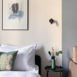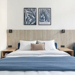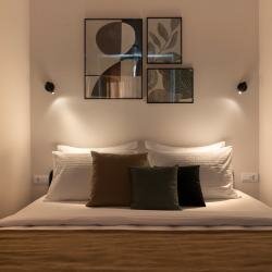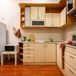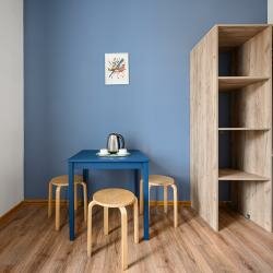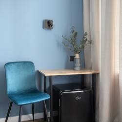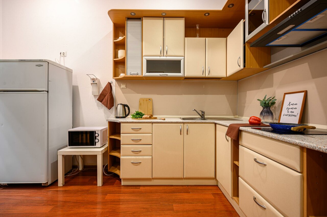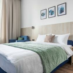 Апартаменты с одной спальней. Вид в во двор. Современные номера для гостей с размещением до 5 человек. В спальне двухспальная кровать ( 160 см) и кресло кровать. В кухне-гостиной диван кровать 160 см. Площадь номера 25 м. Номер оборудован кухней и...