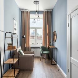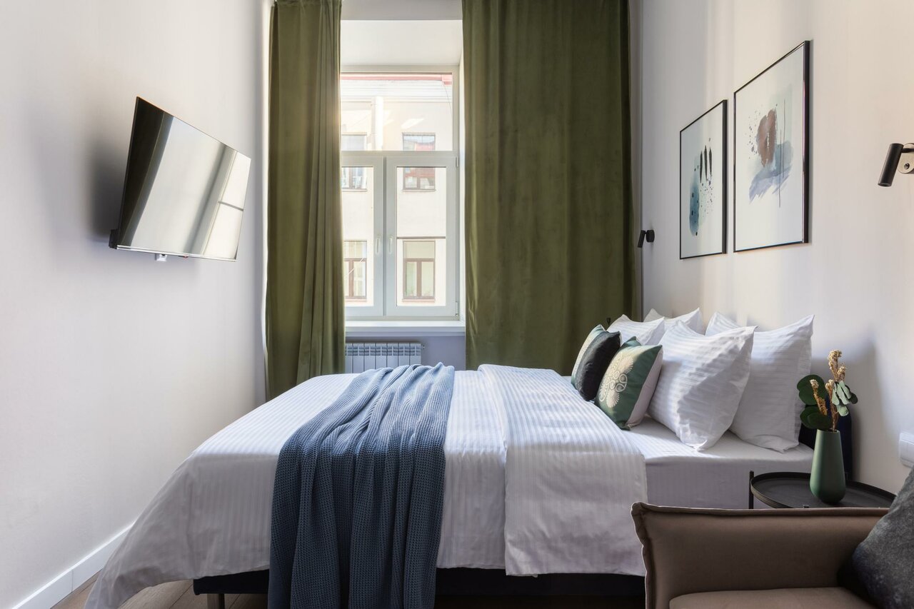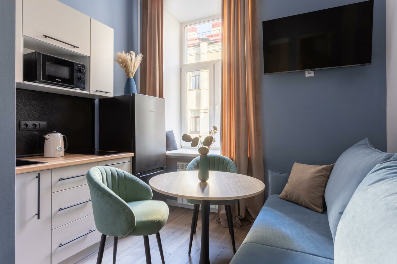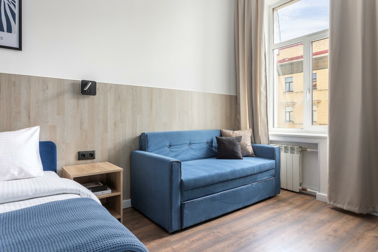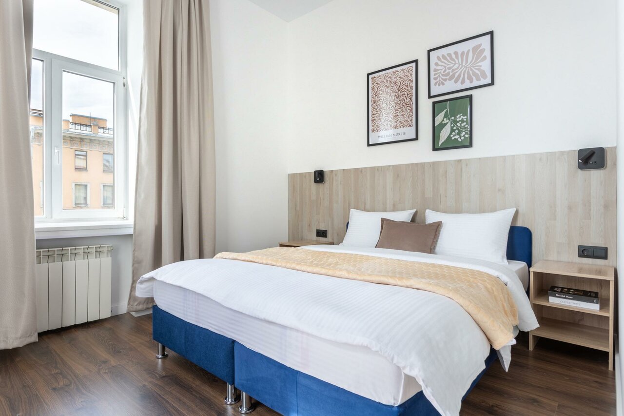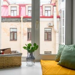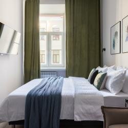 Апартаменты с одной спальней. Вид в тихий Петербургский двор. Современные номера для гостей с размещением до 5 человек. В спальне двухспальная кровать ( 160 см) и кресло кровать. В кухне-гостиной диван кровать 160 см. Площадь номера 25 м. Номер об...
