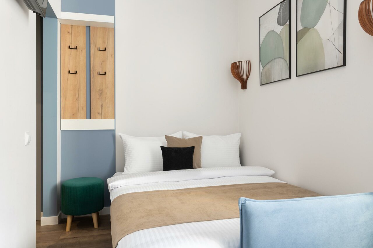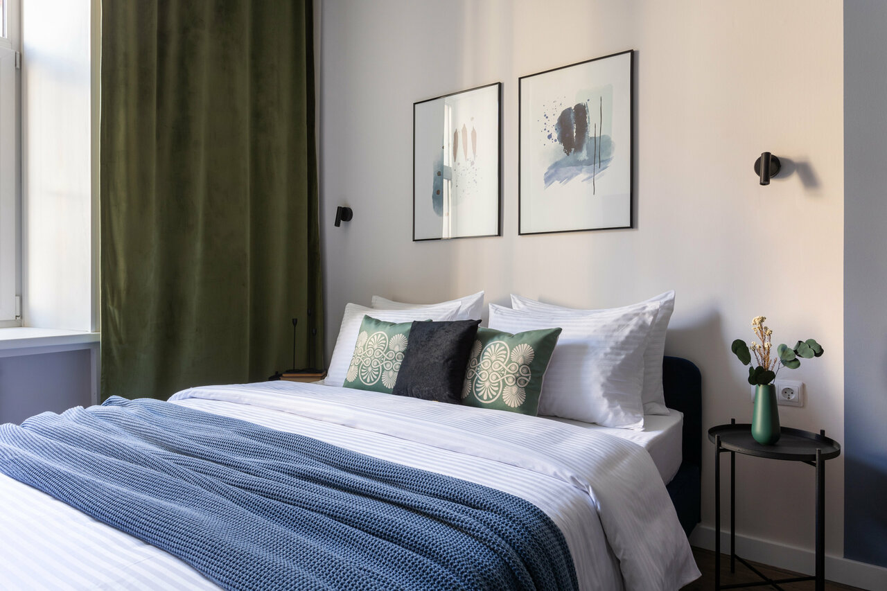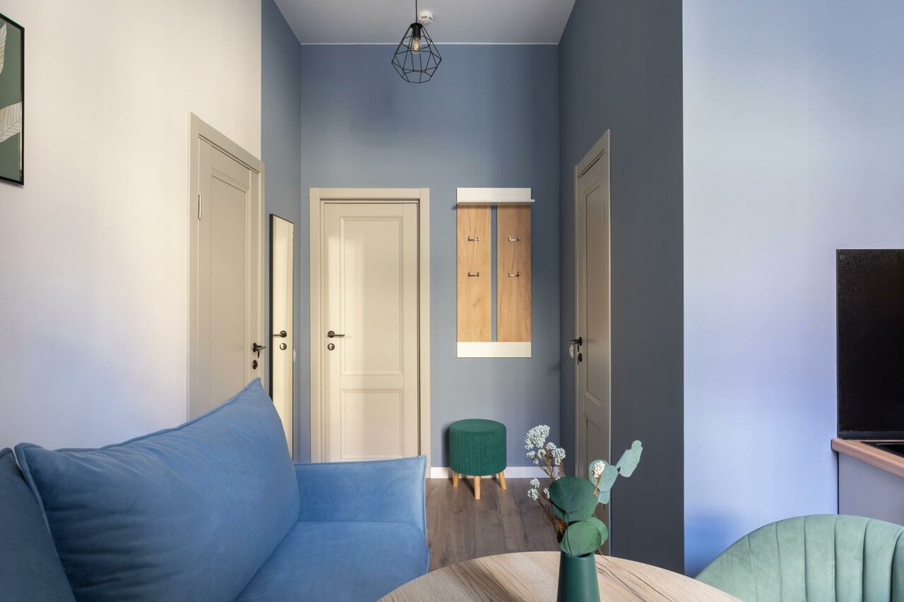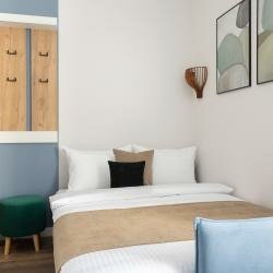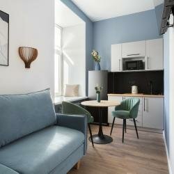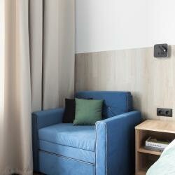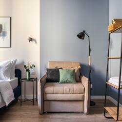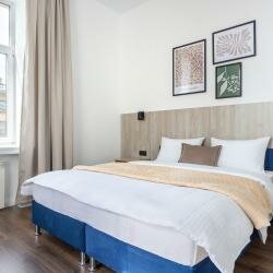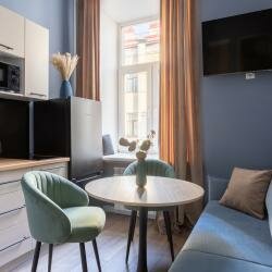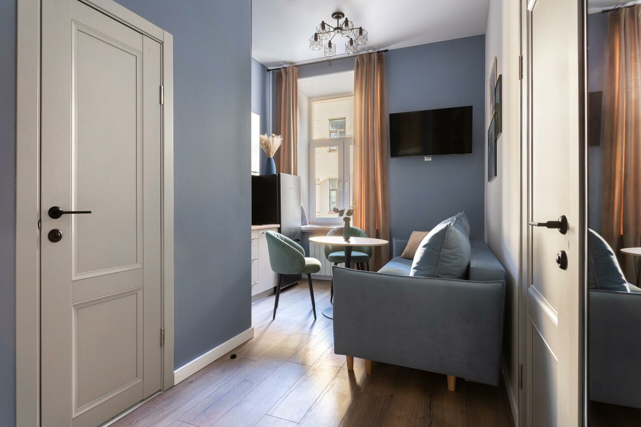 Апартаменты с одной спальней. Вид в тихий Петербургский двор. Современные номера для гостей с размещением до 5 человек. В спальне двухспальная кровать ( 160 см) и кресло кровать. В кухне-гостиной диван кровать 160 см. Площадь номера 25 м. Номер об...