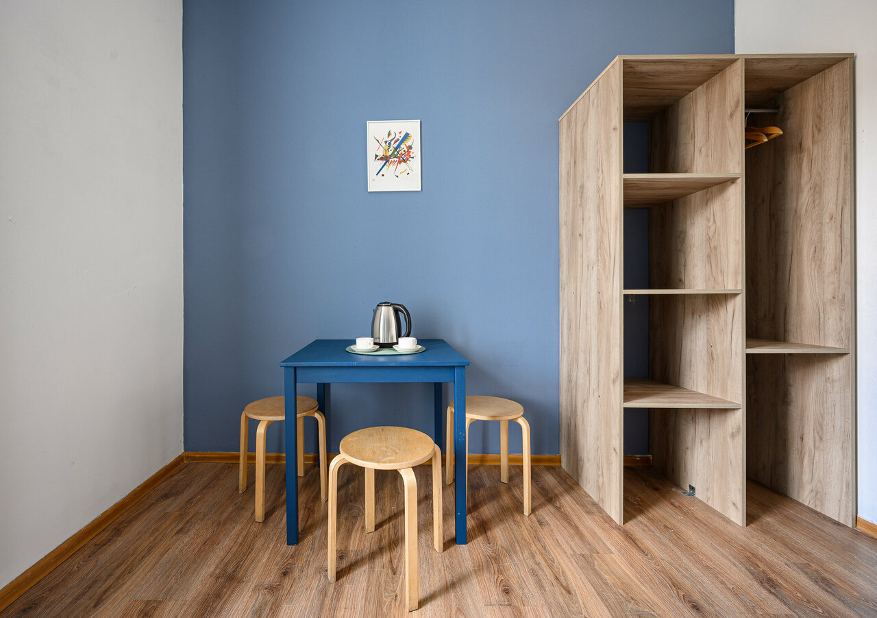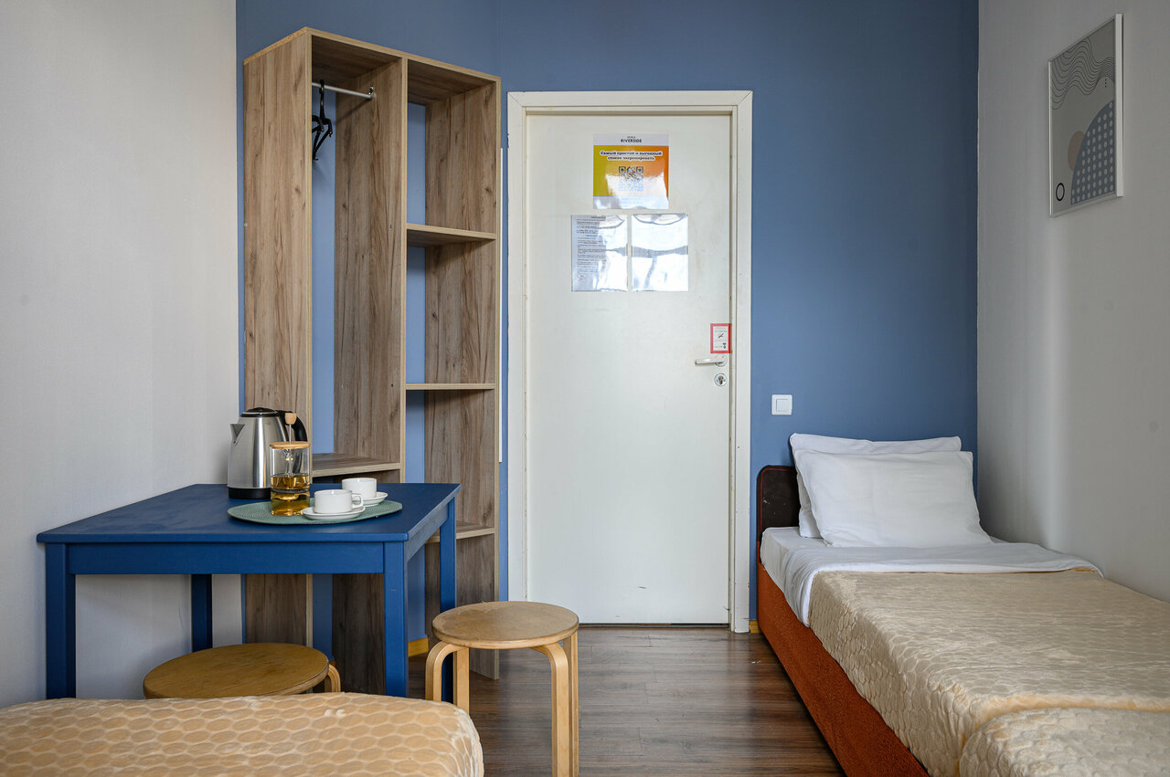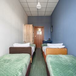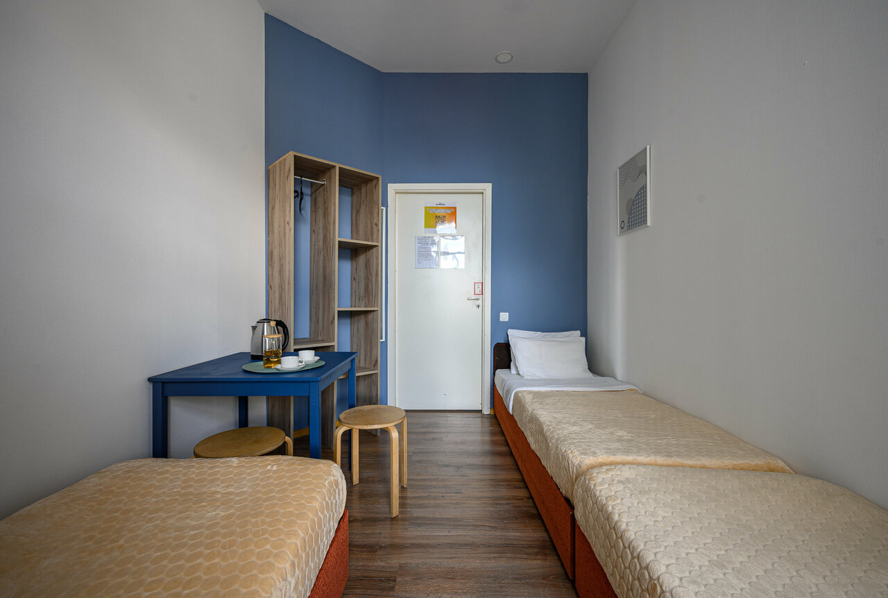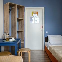 Небольшой номер для 2ух гостей. В номере постельное белье, полотенеца, окно, рабочий стол, стулья и вместительным шкафом. В общем пользовании на территории гостиницы находятся сан.узлы и душевые комнаты, кухонная зона.