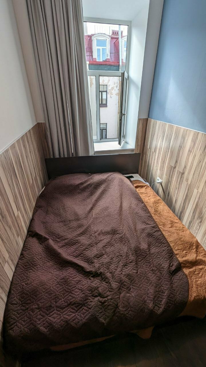 Бюджетно и в центре. Хостел. Узко. Захватите из дома свои тапочки и фен. Вай-фай, плита, холодильник, посуда есть.