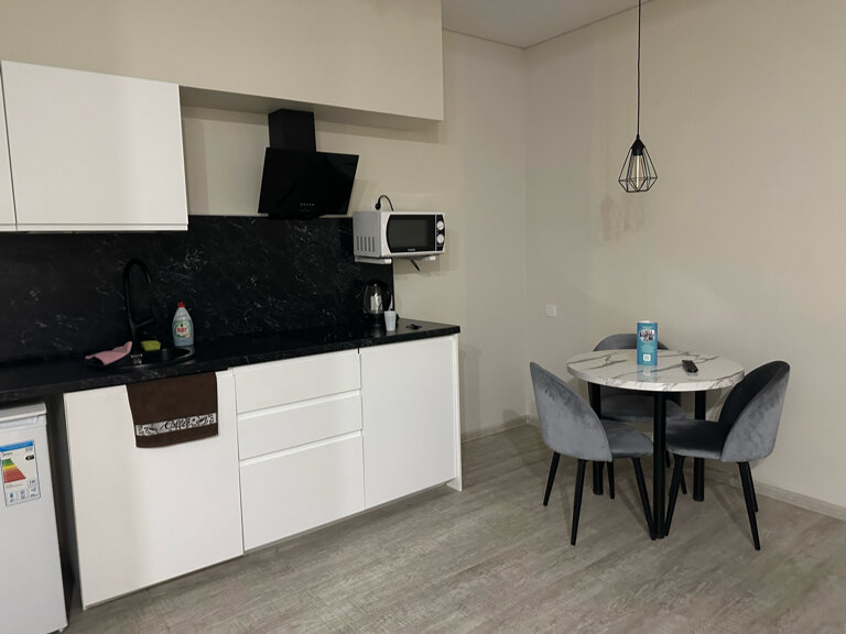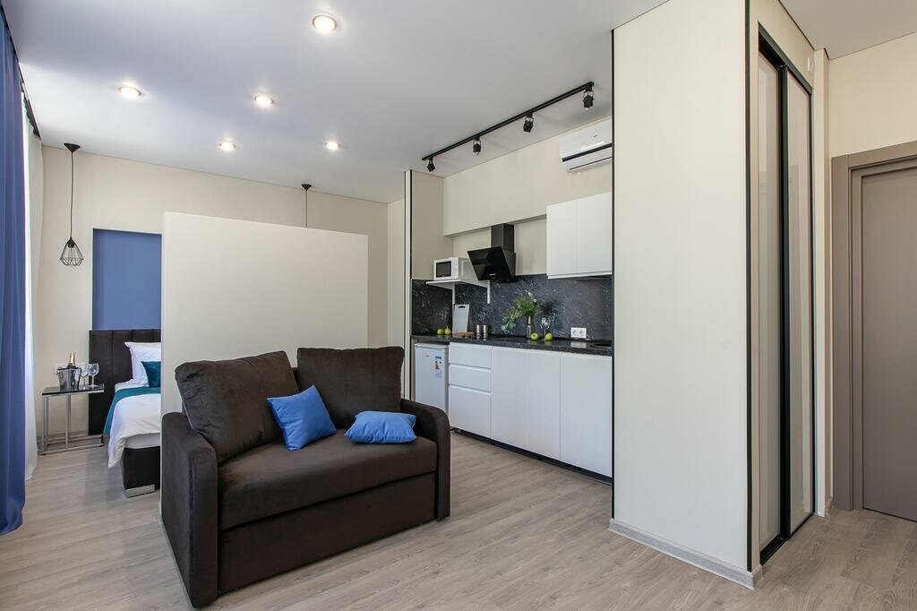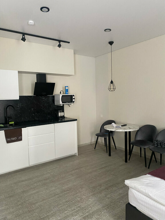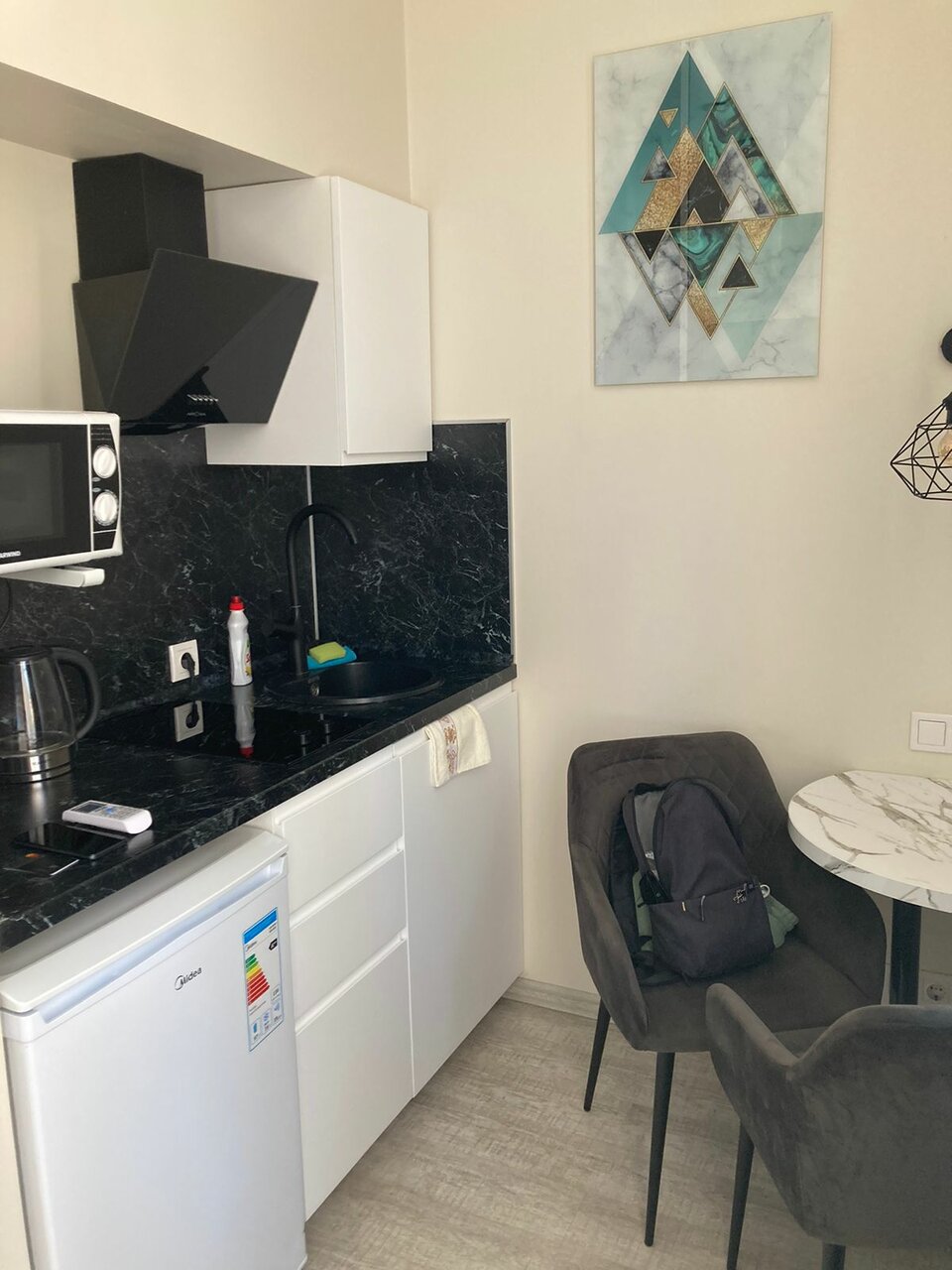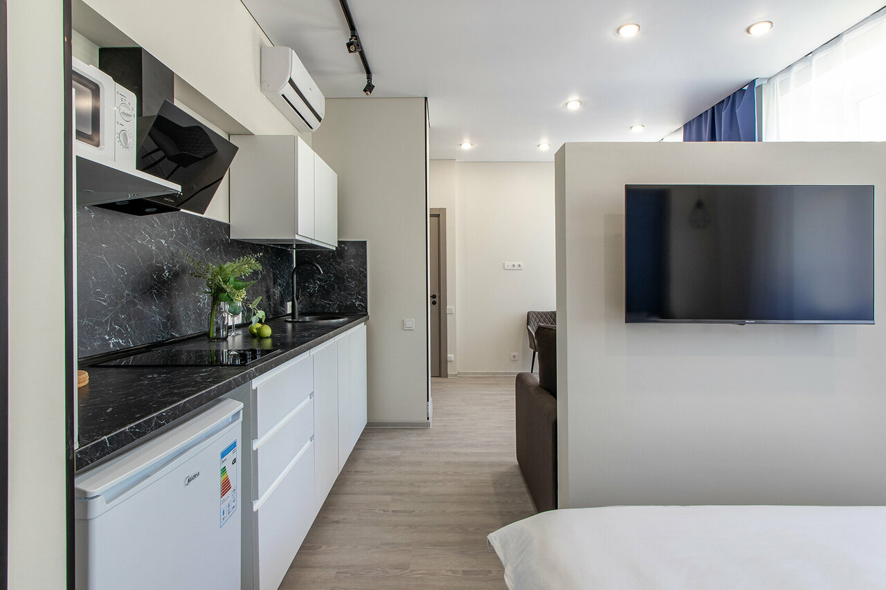 Очень уютно, комфортно. Есть посуда, микроволновка, сейф, халаты, туалетный набор (шампунь, гель, мыло, ватные палочки, зубная щетка, паста, тапочки). Питьевая вода, чай, кофе, сахар. Телевизор с выходом в интернет. Соседей не слышно. Взяли в аренду зонтик. Столовая, магазин, КБ за углом. Очень стильная студия. Мы в восторге. Находится в центре, легко добраться до любой точки. Рекомендуем